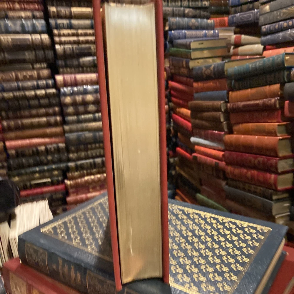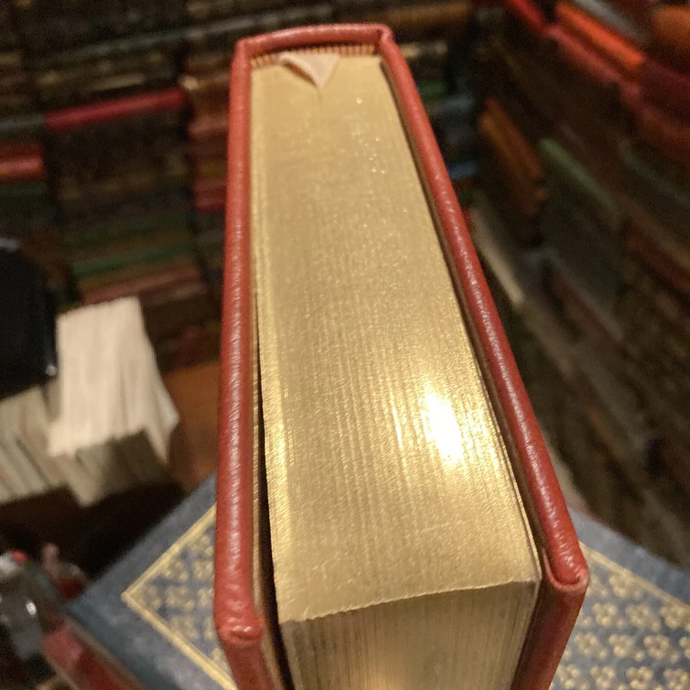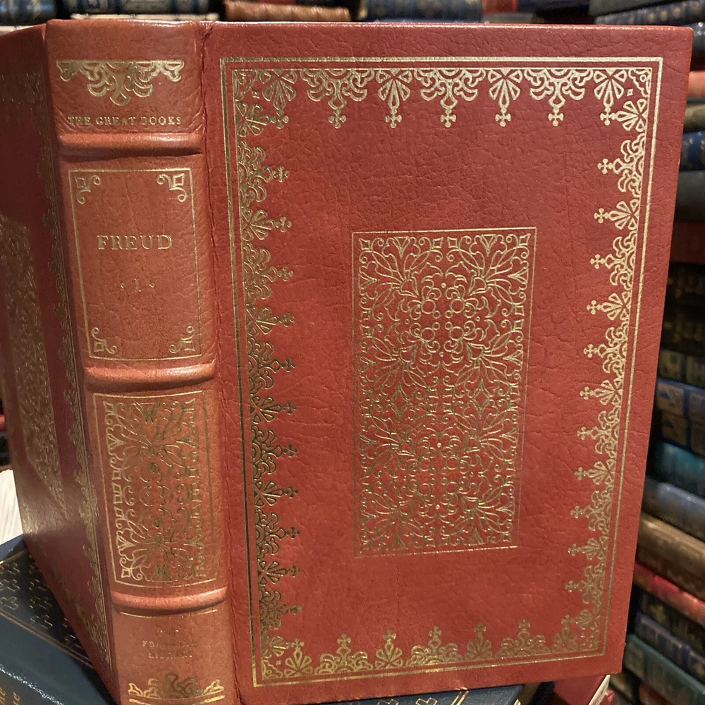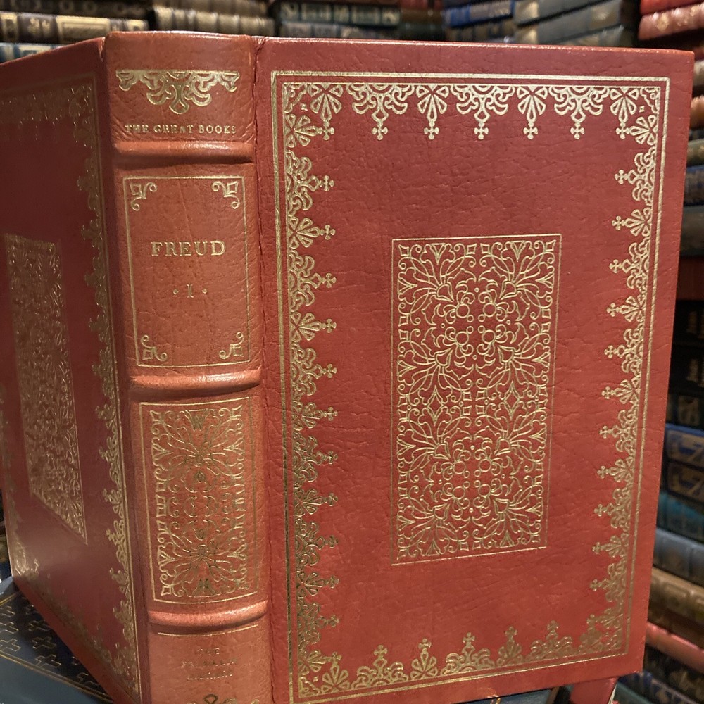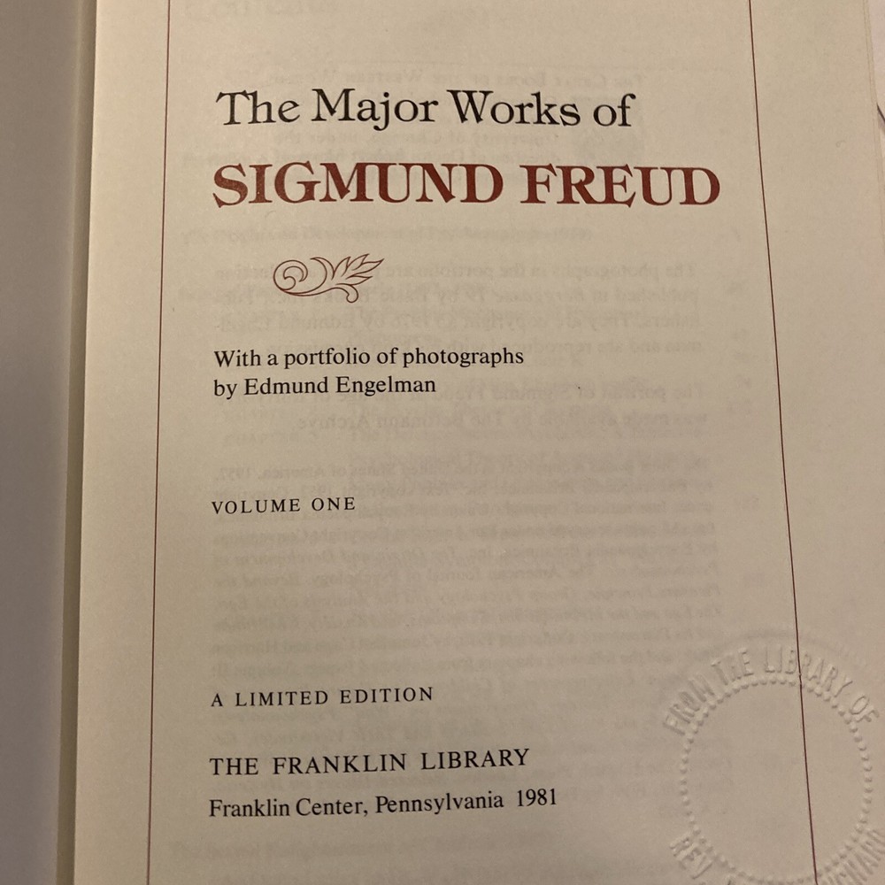 Franklin Library leather edition of "The Major Works of Sigmund Freud," Volume One, a Limited edition, With a Portfolio of photographs by Edmund Engelman, one of the 25th ANNIVERSARY OF THE GREAT BOOKS OF THE WESTERN WORLD series, published in 1981. [This is volume one of a three volume set but each is complete in itself.] Bound in red leather, the book has light tan French moire silk end leaves, acid-free paper, a satin book marker, Symth-sewn binding, hubbed spine, gold gilding on three edges---in near FINE condition. Sigmund Freud, who lived from 1856 – 1939, was an Austrian neurologist and the father of psychoanalysis, a clinical method for treating psychopathology through dialogue between a patient and a psychoanalyst. Freud was born to Jewish parents in Freiberg, in the Austro-Hungarian Empire. He qualified as a doctor of medicine in 1881 at the University of Vienna. Freud became a professor in 1902 and lived and worked in Vienna, having set up his clinical practice there in 1886. In 1938 Freud left Austria to escape the Nazis. In creating psychoanalysis, Freud developed therapeutic techniques such as the use of free association and discovered transference, establishing its central role in the analytic process. Freud's redefinition of sexuality to include its infantile forms led him to formulate the Oedipus complex as the central tenet of psychoanalytical theory. His analysis of dreams as wish-fulfillments provided him with models for the clinical analysis of symptom formation and the mechanisms of repression as well as for elaboration of his theory of the unconscious. Freud postulated the existence of libido, an energy with which mental processes and structures are invested and which generates erotic attachments, and a death drive, the source of compulsive repetition, hate, aggression and neurotic guilt. Volume one discusses the "origin and development of psychoanalysis, hysteria, the sexual enlightment of Children, Narcissism, the unconscious, Repression, Instincts and Their Vicissitudes, Group psychology and the Analysis of the Ego, the Ego and the id, Inhibitions, ssymptoms, and anxiety, thoughts for the Times of War and Death, and Civilization and Its Discontents--------FASCINATING reading! 683 pages. I offer combined shipping.