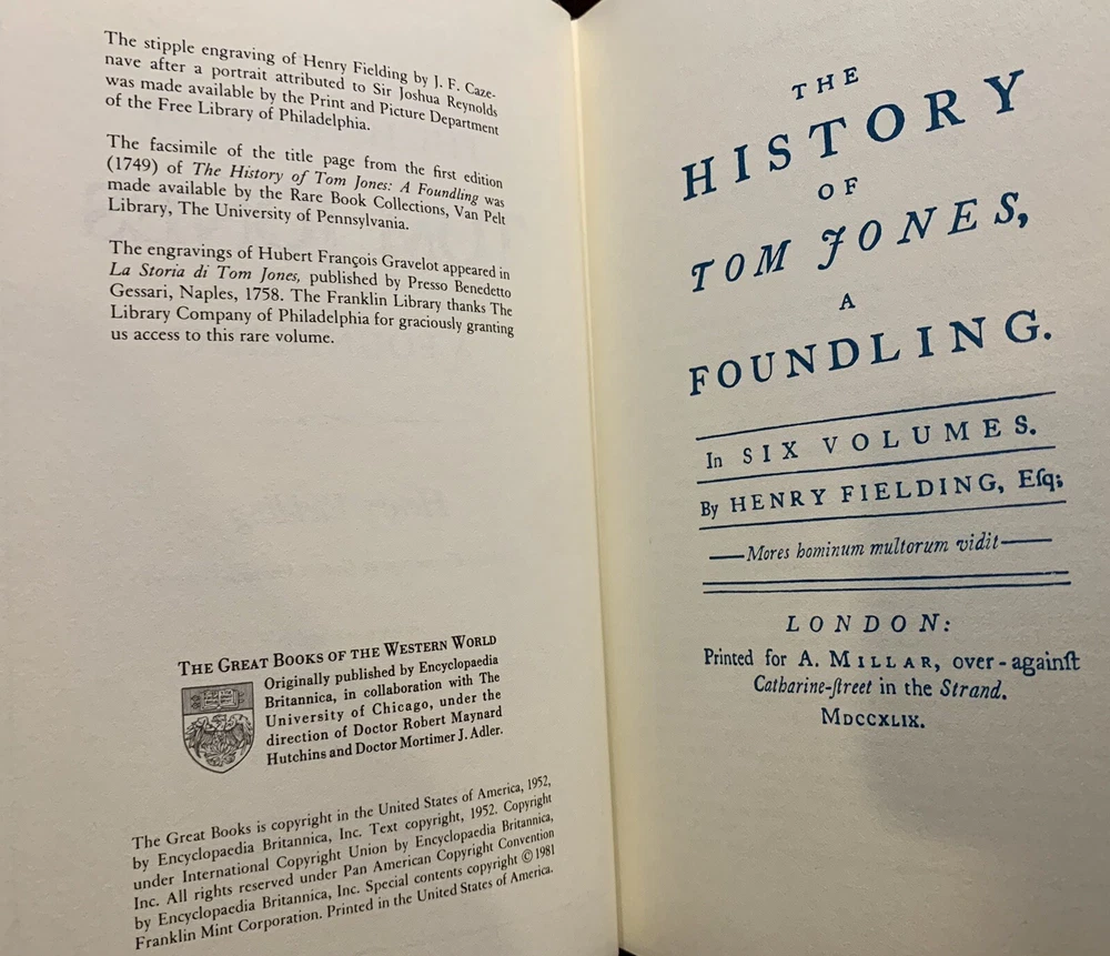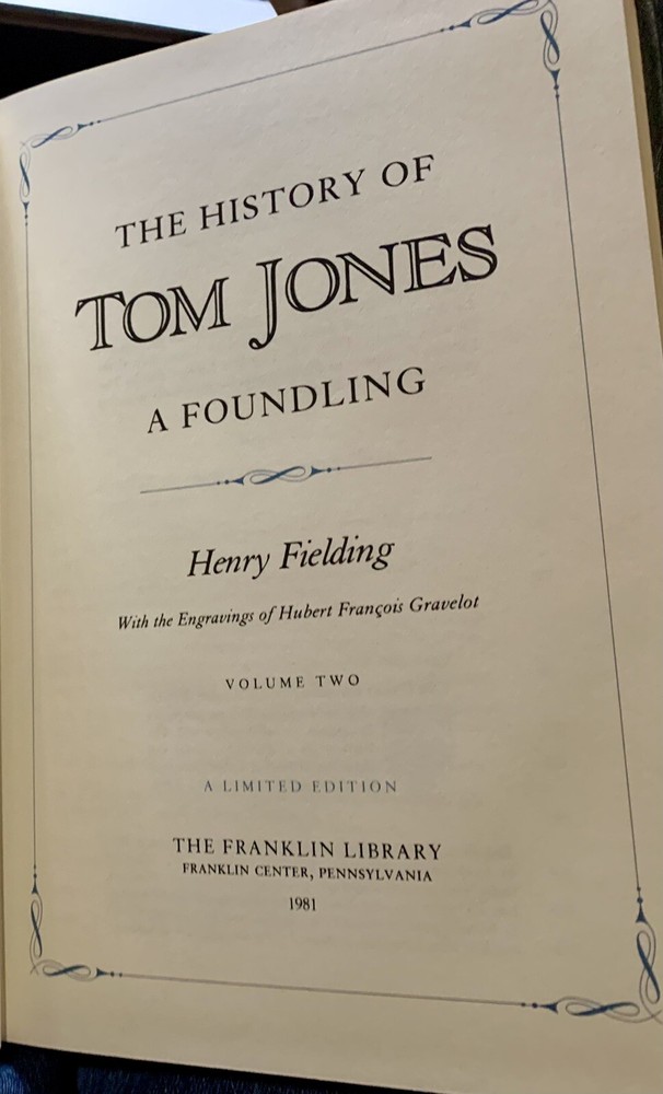 Franklin Library Greatest Books of the Western World Tom Jones: A Foundling Henry Fielding Rare/Complete Set The Franklin Library was a division of The Franklin Mint that produced fine collector edition leather-bound books for three decades, ending in 2000. For this reason, all Franklin Library editions are now considered "out of print" and are no longer available for sale from the Franklin Mint. This Franklin Library Edition Includes: High-quality Paper Sewn, not glued, Pages into the Binding Gold-gilded Page Edges Raised spine bands Full-Bound Leather Commissioned Illustrations Silk Moiré Endpapers