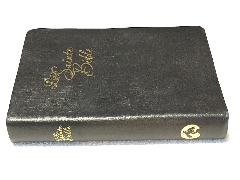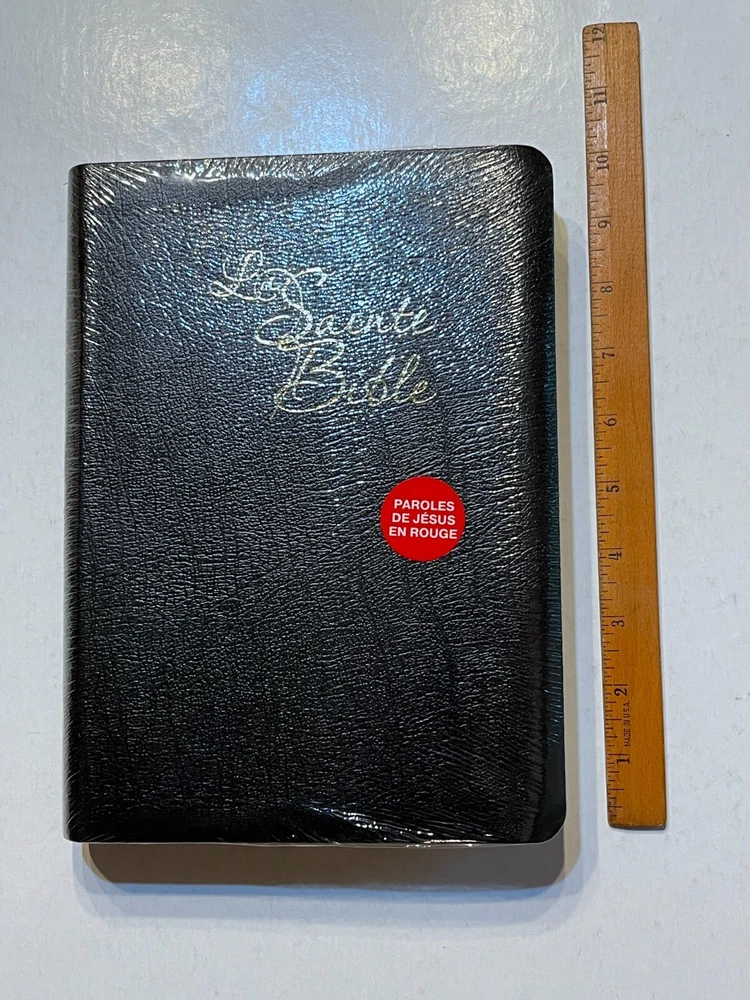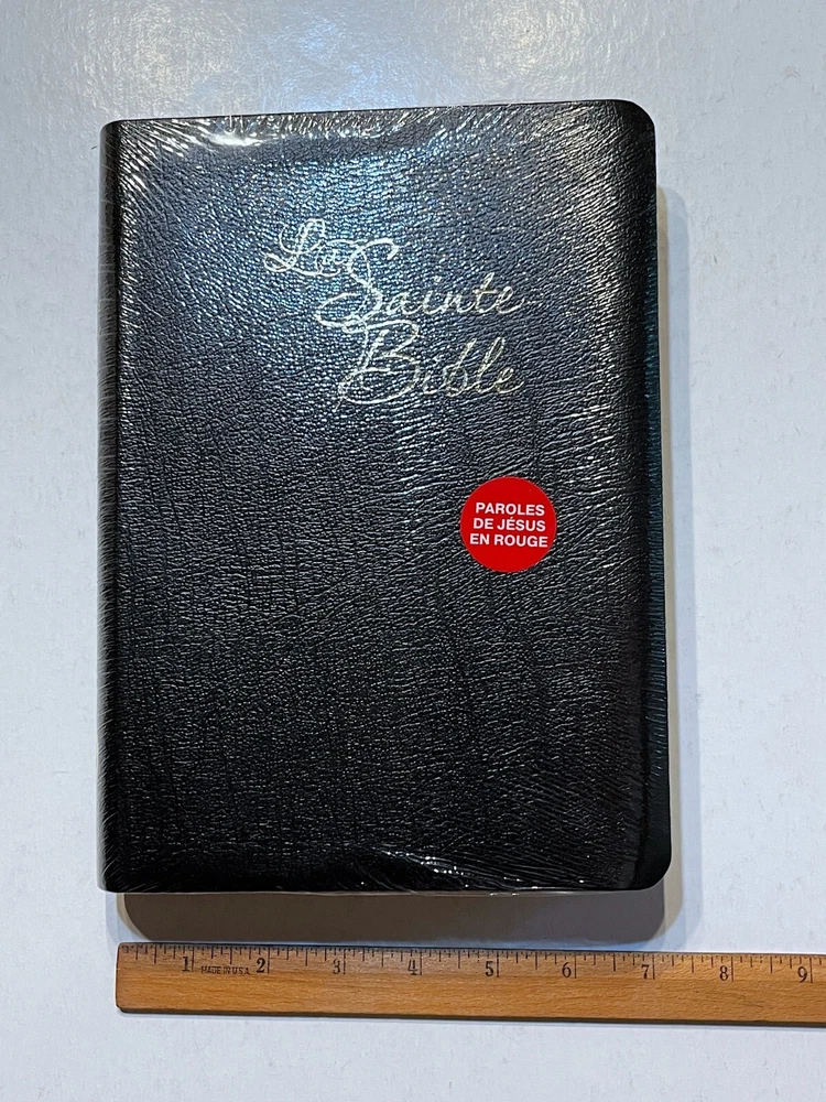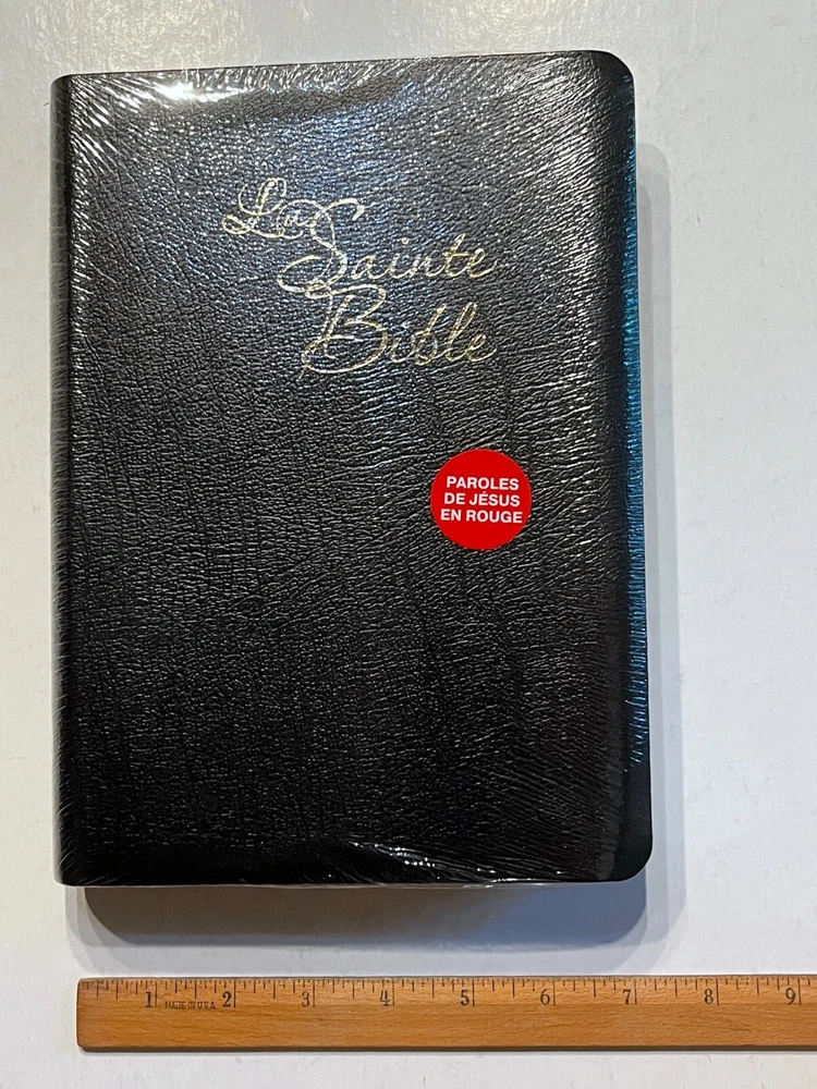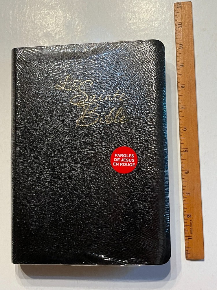 FRENCH BIBLE La Sainte Bible Large Print Louis Segond 1910 New Copy – Black Bonded Leather , Gold Lettering, Gilded pages, Red Letter 12 Point Print! 2008 edition Includes both the Old Testament and the New Testament 1804 Pages Maps Introduction to each Book of the Bible Harmony of the Gospels Index of Bible Themes Titled sections parallel citations Footnotes page Color maps 6 3/4” X 9 1/2” X 1 3/4” ISBN 9781771243759 This is produced by The Canadian Bible Society. This Bible is new and in excellent condition. We ship within 2 days of receiving payment. Combined shipping available. Please check shipping options for the one best suited for your need and region. I list 3-4 option to select from for shipping. Returns accepted due to damage in shipping and must be initiated within 7 days. Thank you for looking!