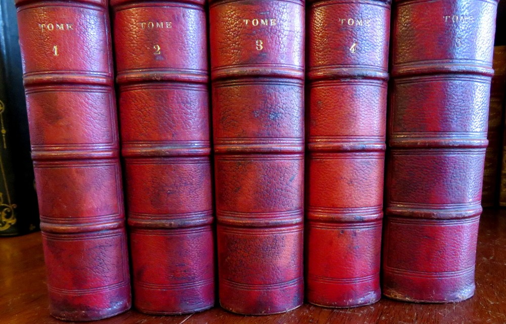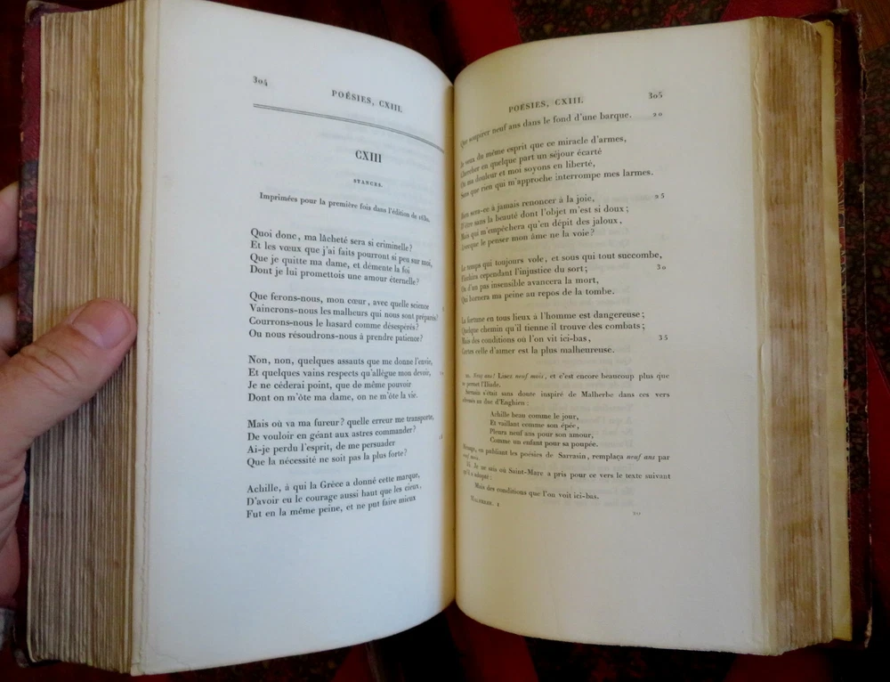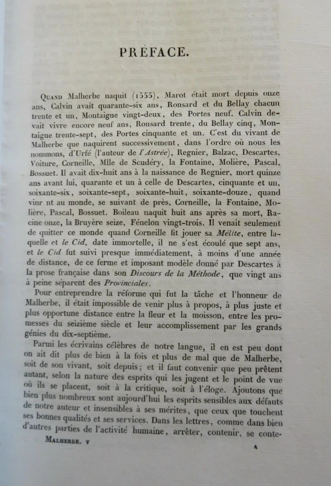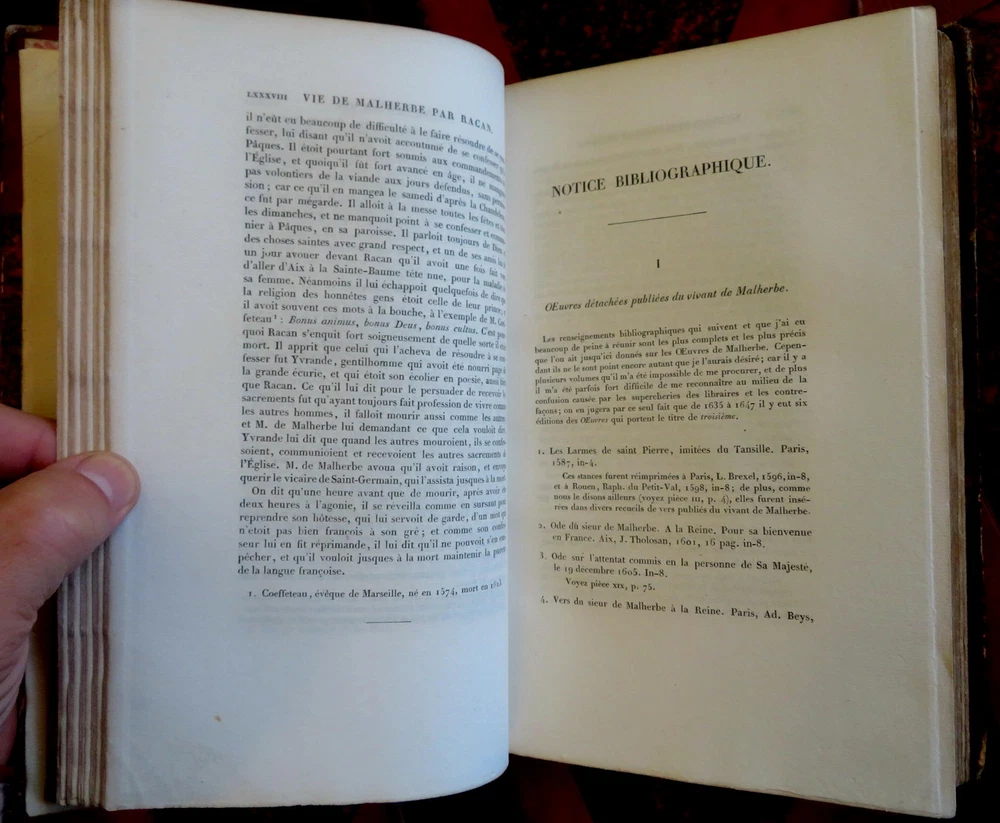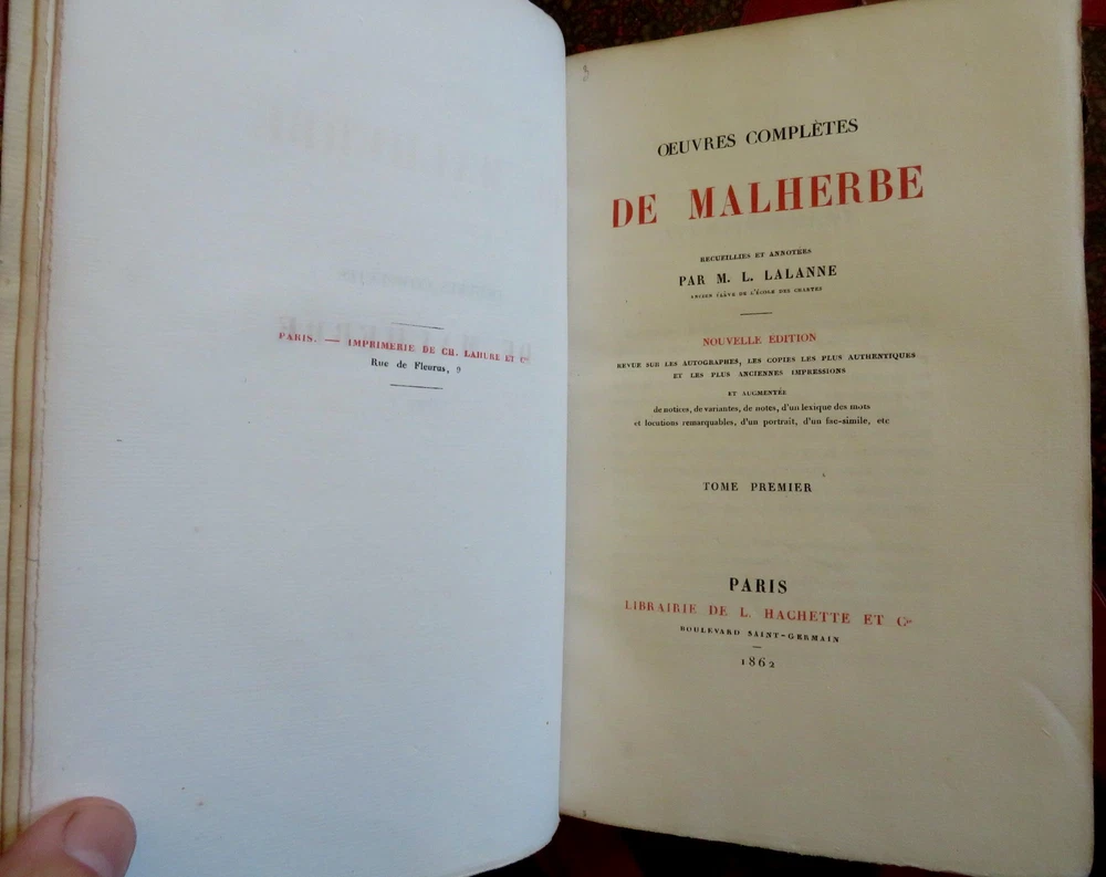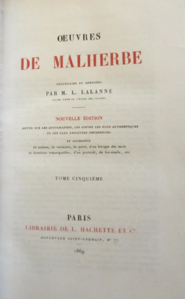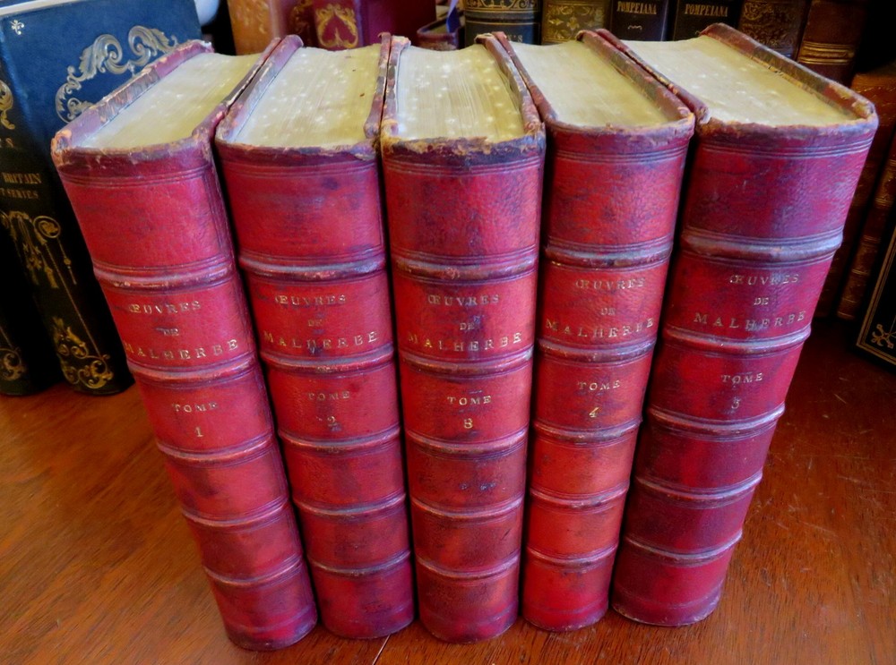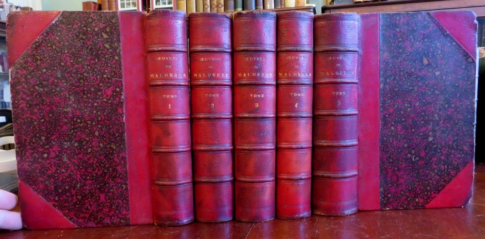 French Poetry Francois de Malherbe Complete Works 1869 rare leather 5 vol. set French Poetry Francois de Malherbe Complete Works 1869 rare leather 5 vol. set (Old Books, 19th Century Books, Leather Books, French Books, Poetry, Francois de Malherbe). Ouvres Completes de Malherbe. Published 1862-69, Paris by Hachette Et Cie. 5 volumes, each c. 600-675 pages. Text in French. Scarce set in any condition. Attractive antiquarian 1/2 leather bindings, raised bands, gilt title lettering, gilt ruled compartment decorations, marbled end papers & covers, top edges gilt, deckled edges. Set is physically old and shows some signs of handling and time. Bindings age worn but still appealing, leather and joints scuffed and rubbed but still supple, spine ends worn with small chipping in spots, some age staining to leather, board tips bumped with fraying, set remains overall very attractive as an object. Text block paper is gently age toned as typical, internally set remains mostly clean, tight and sound. A set which has been taken care of but may/ does not look like new. Still attractive on the shelf. Set displays a pleasing and unique age patina and is in rather nice antiquarian condition, any age flaws seem easy to overlook or forgive. Please review photos for more detailed attempt to present this scarce set as it survives. We often over-describe any flaws that many sellers would not even bother to mention since most people would overlook them as minor and unworthy of comment. Many people tell us the books they receive from us are nicer in person than they appears on the screen. We want you to be clear about what you are buying, so we take numerous photos and try to describe it openly and honestly. Books Measure c. 9 1/4" H x 6" W. [B7473-BR225].