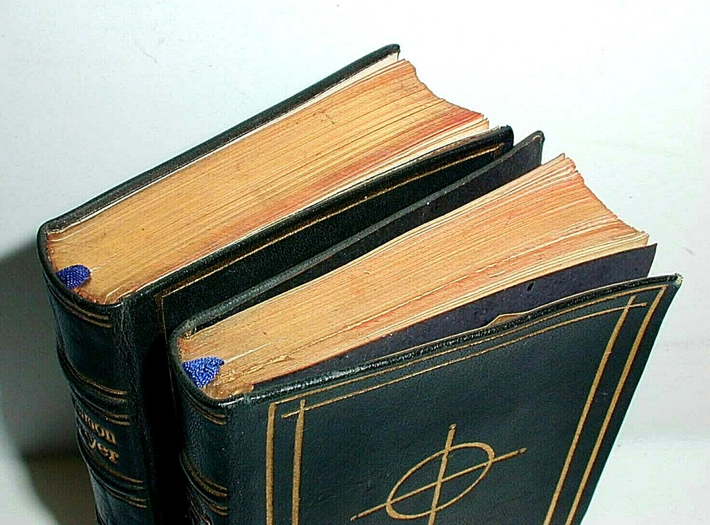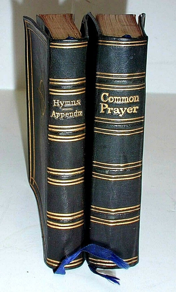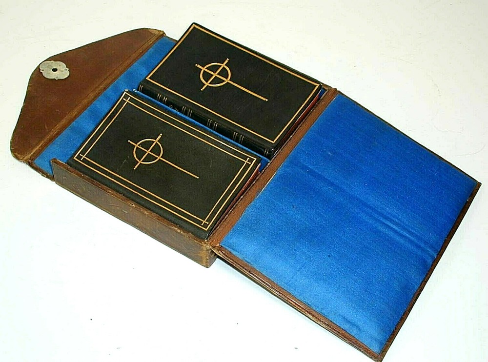 ORIGINAL AND VINTAGE ............. CASED SET, FULL LEATHER BOUND. ............ 'COMMON PRAYER AND HYMNS', 2.5" x 4" EACH............. STUNNING CONDITION............ These are two miniature 19th century Original and Vintage full leather, exquisitely bound books in a leather case. The condition is very fine. The titles are: 'The Book of Common Prayer', Oxford Press, 1862, unpaginated, all edges gilded, 2.5" x 4" 'Hymns Ancient and Modern', London, William Clowes and Sons, all edges gilded, 2.5" x 4" We are assuming both books are the same vintage, and the Common Prayer has the earliest date in the tables of 1862. The condition is almost as new. The case has scratches and the lock does not catch. As ever this is guaranteed 100% money back, to be as represented.