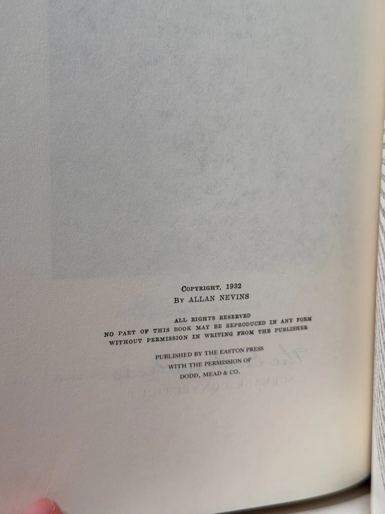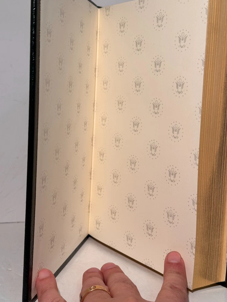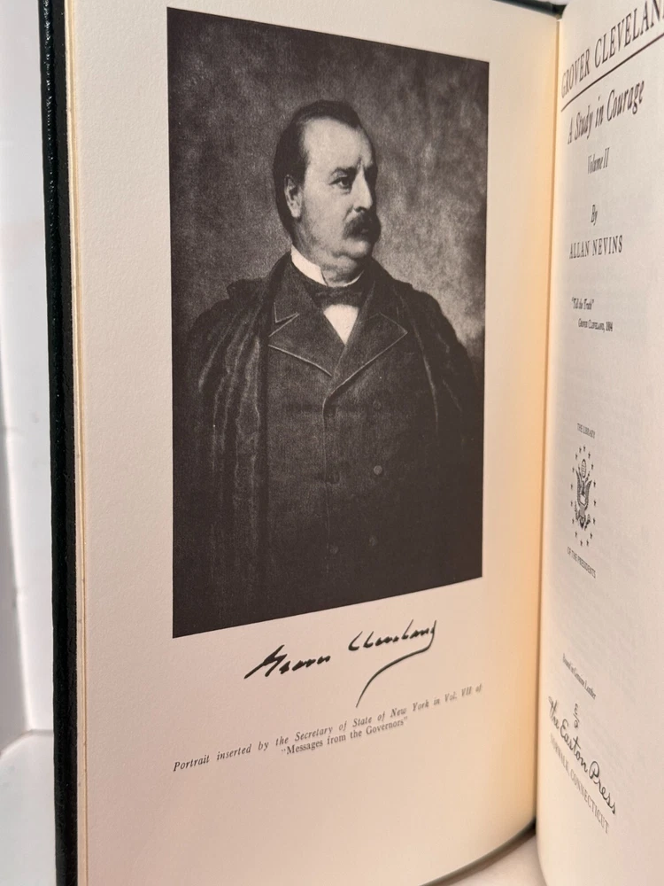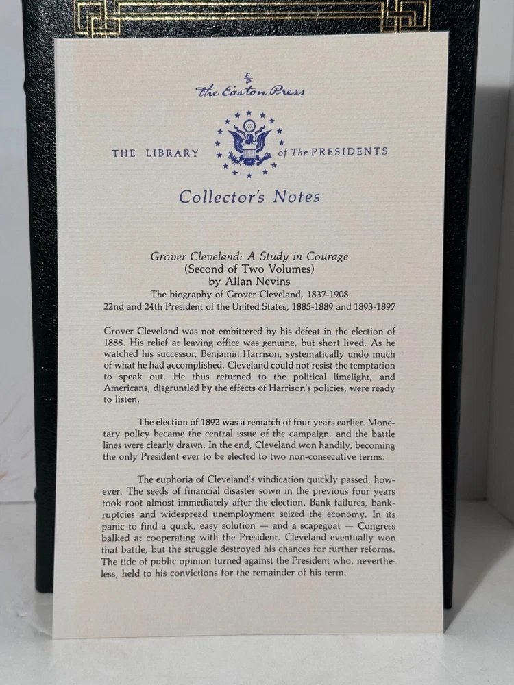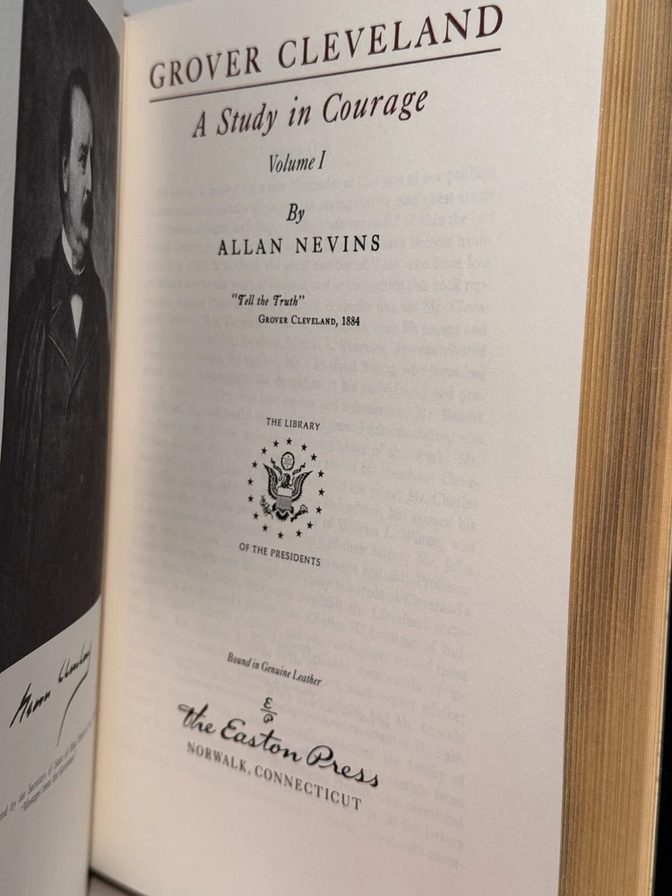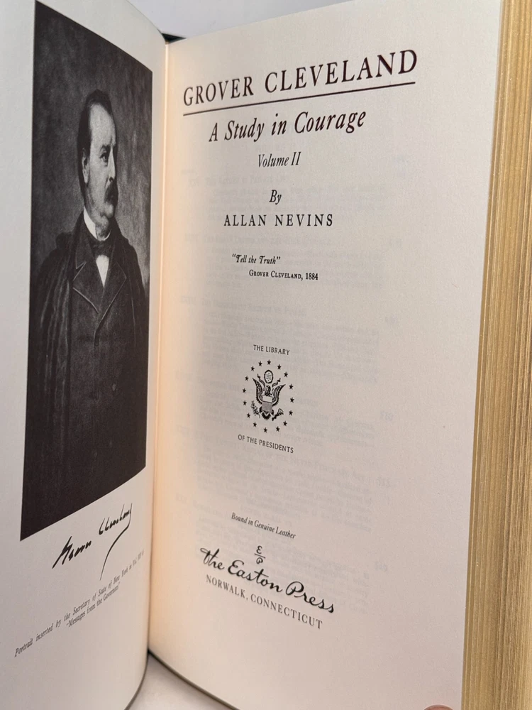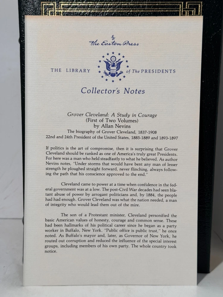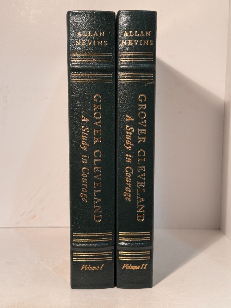 You are bidding on a very fine copy of a 1st Edition, 1st Printing of the Easton Press' THE LIBRARY OF THE PRESIDENTS series edition of Allan Nevins's 2 VOLUME SET of GROVER CLEVELAND - A STUDY IN COURAGE. This is a 2 Volume set edition about the life and work of President Grover Cleveland. Bound in beautiful genuine moroccan cowhide leather, the book features raised bars on the spine, gold tooling on the cover and spine, End-pages decorated with the seals of the U.S. Presidents, satin silk sewn-in bookmark, 22k gold dust on page ends on all 3 sides. Printed on archival quality acid-neutral paper, that will last for generations without diminishing in quality or looks. INCLUDES ORIGINAL, LIBRARY OF THE PRESIDENTS INSERT FOR BOTH VOLUMES. LIMITED, COLLECTOR'S EDITION FROM THE SERIES OF THE LIBRARY OF THE PRESIDENTS. Free Shipping in all of Continental United States. All other buyers, please check with me for shipping rates before bidding. ***NOTE: If you are dissatisfied with your purchase for any reason, please contact me first directly, and I will do all in my power to make sure you are satisfied with your purchase. *** See my other listings. I have a large collection of rare and collectible books, most leatherbound, others of first edition, first printing, even unpublished manuscripts. I will combine them during shipping so you can receive them together. Just message me your intent to buy more than one book, and I will hold them to be shipped together. Abell Happy Buying!