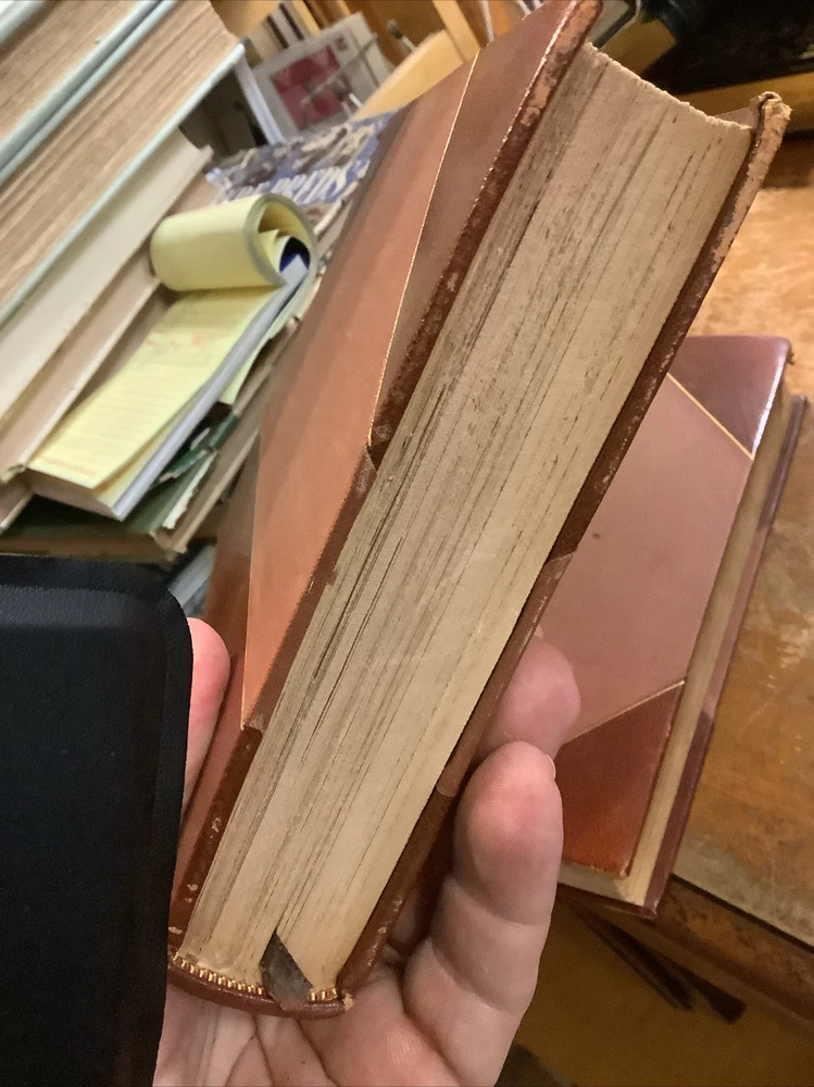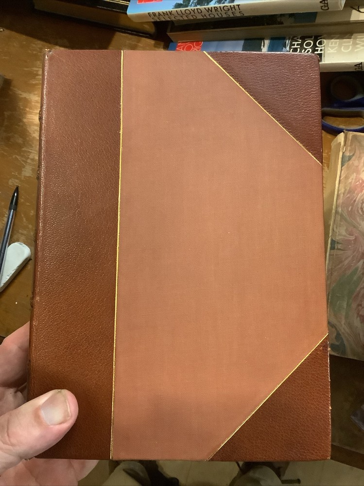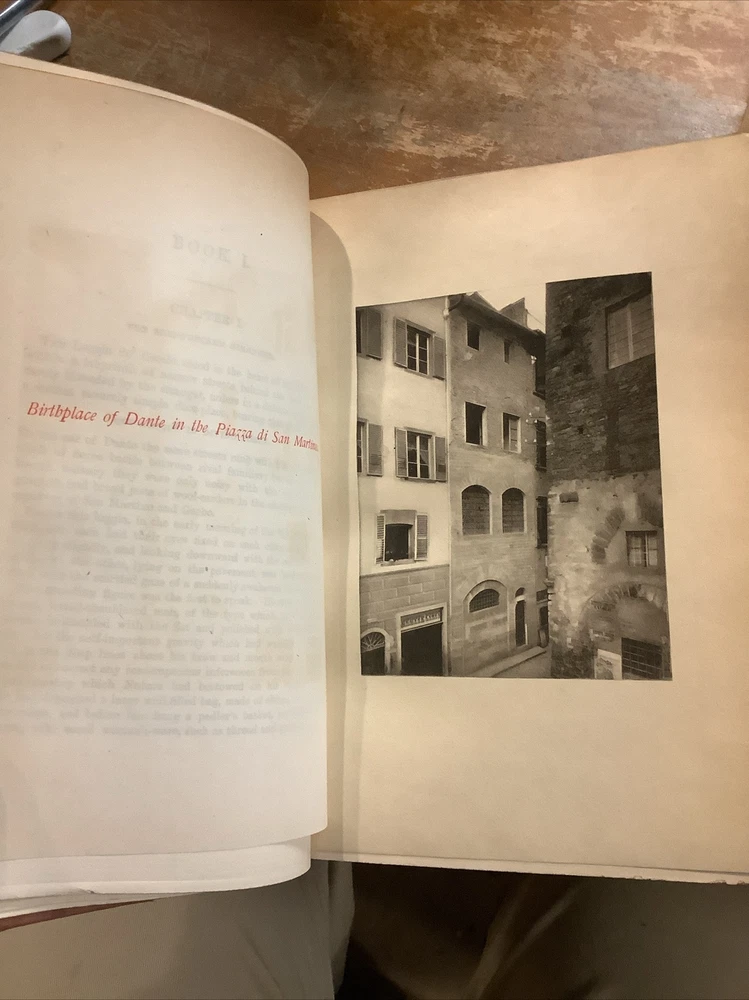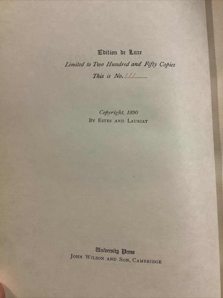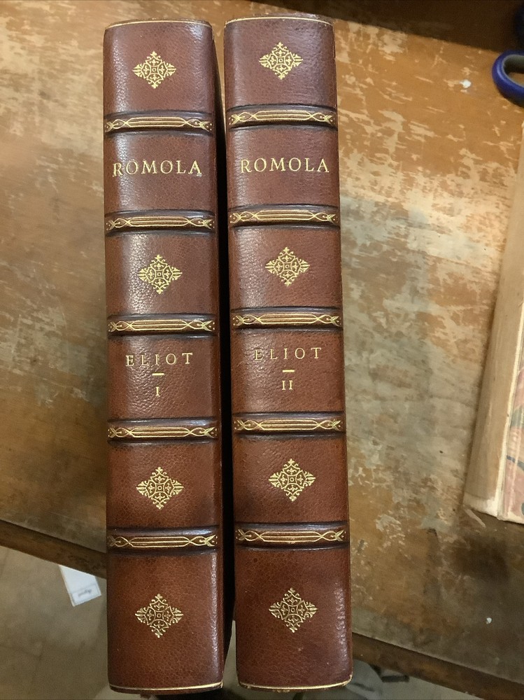 Romola by George Eliot. Two volume set bound in three-quarter leather. Published by Estes and Lauriat in Boston, 1890. Limited edition number 111 of 250. Illustrated with black-and-white photos. Rubbing to binding edges.