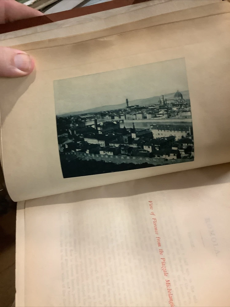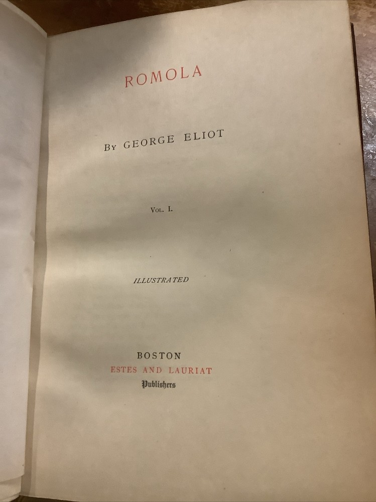 Romola by George Eliot. Two volume set bound in three-quarter leather. Published by Estes and Lauriat in Boston, 1890. Limited edition number 111 of 250. Illustrated with black-and-white photos. Rubbi...