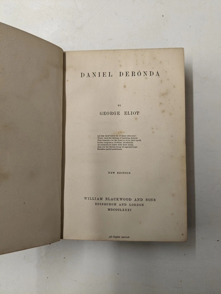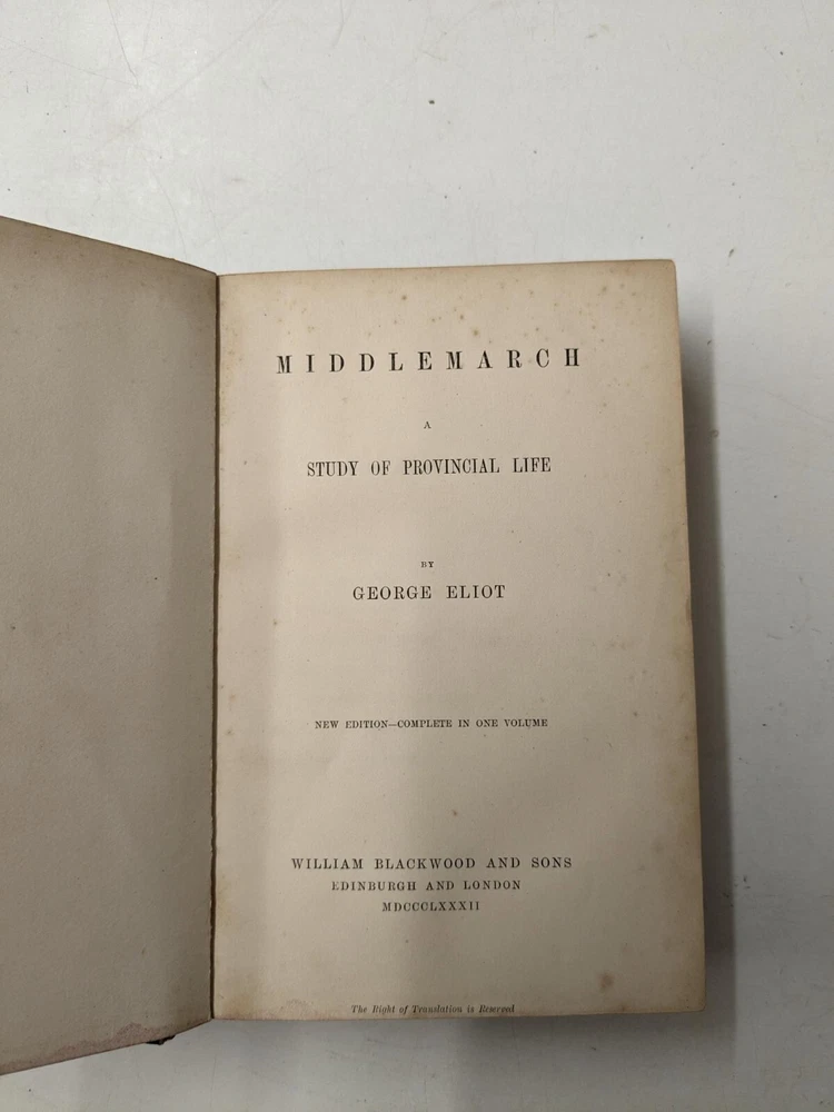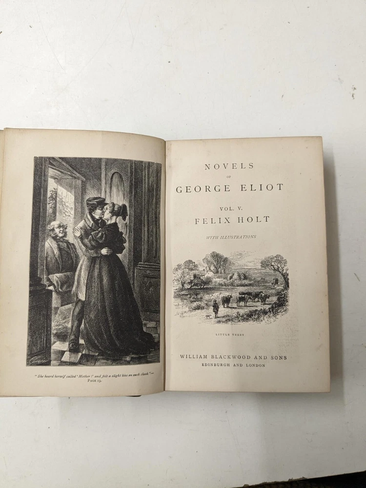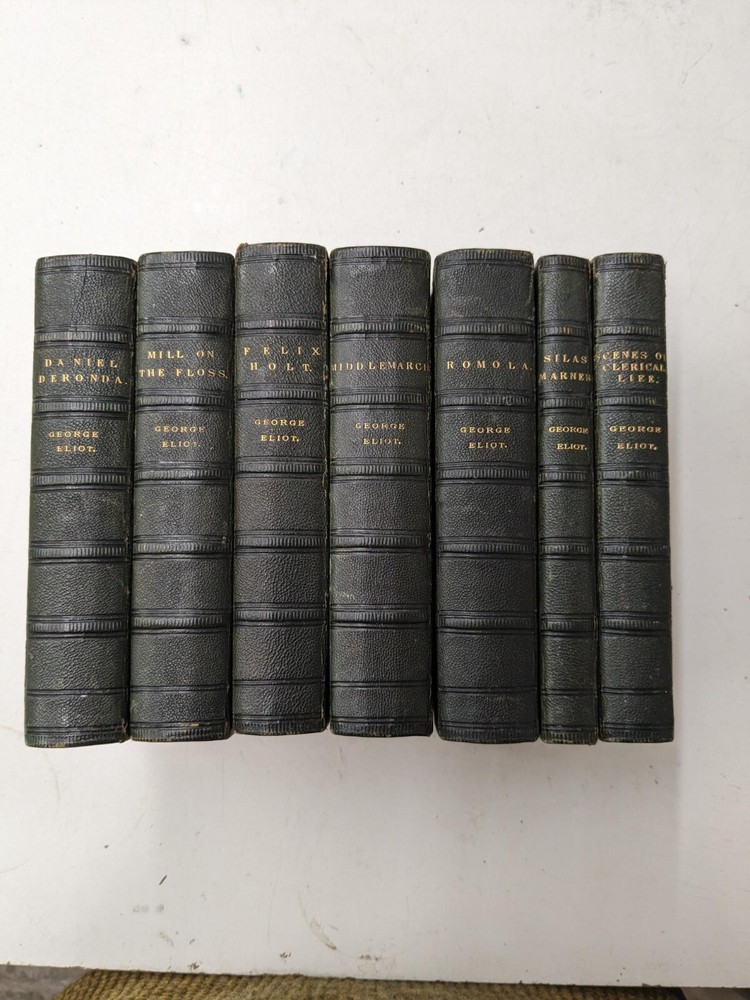 George Eliot Part Set: Seven Volume Set published by William Blackwood in 1882. Matching set in black half leather & red marble patterned boards, with gilt lettering to the spines. Bindings tight with no loose pages in all volumes The set contains all of the author's major novels, with the exception of Adam Bede : Middlemarch / D aniel Deronda / Mill on the Floss / Silas Marner / Sc enes of Clerical Life / Felix Holt / Romola. All volumes have signatures & cracking to front & rear boards. A sturdy set in good condition for their age - in a fine binding. BS12 Please see the photographs for the best indication of overall condition. Tracked postage within the UK. eBay Global Shipping for international sales - please check prices before committing to purchase. Please e-mail for further information if required. Our charity’s eBay office is open from 09:00 GMT to 17:00 GMT, Monday to Friday (excluding UK bank holidays). There may be a delay in responding to enquiries sent outside of these hours. Payment can only be made via Paypal. We will not accept cheques, bank transfers, postal orders or any other payment method. We are happy to combine purchases of multiple items therefore in these cases, please defer payment until a revised invoice is sent to you. Items will be packed and dispatched within two working days of payment being received. If the item is listed as ‘buyer collects’, please e-mail us to make the necessary arrangements. If the item is listed as ‘buyer collects’ and you are a non-UK resident, please do not submit a bid. If you are not happy with your purchase, please contact us via e-mail before raising a case through eBay. All items listed for sale on eBay by Dorothy House have been generously donated to our charity All profits from our eBay sales go towards providing free patient care. Dorothy House Hospice Care – Caring When It Counts since 1976 – serving BANES, parts of Somerset, & North & West Wiltshire