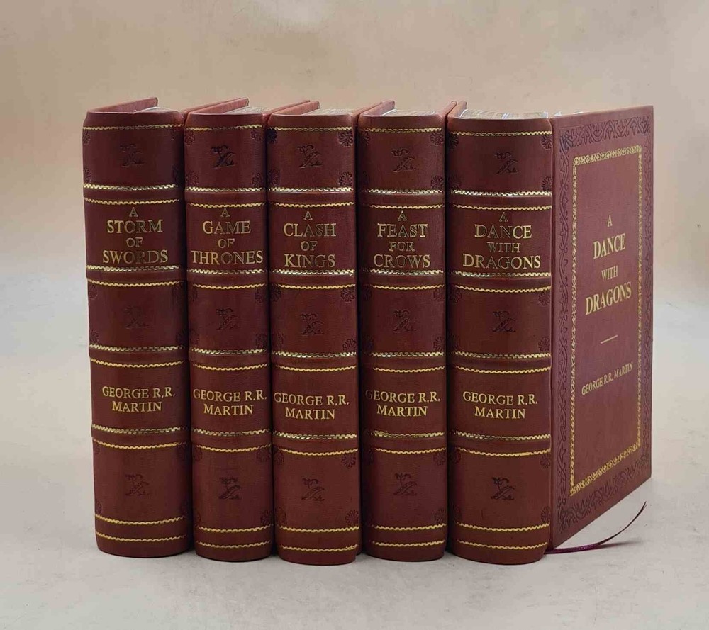 GYAN BOOKS INTRODUCING A REMARKABLE LEATHER-BOUND EDITION, METICULOUSLY CRAFTED BY THE ESTEEMED INSTITUTION " RARE BIBLIO". This title holds the distinction of being a Bestseller, highly praised by readers across the GLOBE. We are thrilled to present this literary gem exclusively to our elite readers, meticulously encased in our one-of-a-kind Premium Leather Binding . Following your order, we purchase the book from the original publisher/distributor and embark on the process of rebinding to elevate this book to a Luxurious Reading Style. A UNIQUE LEATHER-BOUND BOOK FOR ELITE READERS/COLLECTORS OF OLD RARE AND BESTSELLING BOOKS. For the Binding, we use GENUINE LEATHER , graced with opulent GOLDEN LEAF DETAILING on the SPINE , FRONT COVER , AND BACK COVER , ADDED BY EDGE GILDING . ABOUT US ★ We deal into reprinting of the master pieces crafted by authors around the world. ★ We are proud to say that we have a collection of over 25 million books and our collection includes books that are as old as 200 years and hence are considered as RARE BOOKS. ★ We are pioneer in this field having experience of 40 years. ★ We also undertake printing and Leather Binding jobs of other books. ★ Thesis printing and Leather Binding is one of our important Service ★ Many publishers and author approach us for their books to bind in our Unique leather binding format for their special customers. ★ Our craftsmen are active in this job since generations. ★ Restoration of old books is our expertise ★ We are known by our Customization options. ★ We have many leather color options in our bucket. ★ The whole process is done manually so that it gives you the same feeling of old book. OFFERS & SPECIALIZATION: ★ SPECIAL DISCOUNT FOR BULK ORDERS, PLEASE CONTACT US. ★ CHOOSE ANY LEATHER COLOR OF YOUR CHOICE WITHOUT ANY EXTRA CHARGES, JUST CLICK ON IMAGES FOR OPTIONAL COLORS AND INFORM US YOUR CHOICE THROUGH MAIL WITH COLOR CODE. ★ WE OFFER A DIVERSE RANGE OF LEATHER COLORS, INCLUDING RED , GREEN , BLUE , BLACK, MAGENTA , YELLOW , TAN . WE ALSO OFFER MULTI-COLOR LABELS WITH THESE BEAUTIFUL BOOKS ON SPECIAL REQUEST. ★ AN ORIGINAL LEATHER IS BEING USED FOR BINDING THIS BOOK WITH GOLDEN LEAF PRINTING AND DESIGNING ON SPINE, FRONT AND BACK OF THE BOOK WITH EDGE GILDING . Points to note before booking order: ★ In case of multi volume sets, please note that the above listing is for a single volume only. (To order multiple volumes, please contact us separately). ★ We urge you to appreciate that our Leather-Bound Books are Genuine works of art and are Handcrafted by our Professional Craftsmen. Thus, requiring time and care to reach the pinnacle of excellence. ★ We Prepare the Book after receiving the Order. ★ We usually take 30 business days as handling time to dispatch shipment. ★ We request you to understand that these leather-bound books are work of art and hence require time to go through different process to be the master pieces that they are. ★ We usually take 30 business days as handling time to dispatch shipment. We consider special request for a special occasion. ★ Craftsman based in India, prepared this book and shipped from different stock locations around the Globe. Product Details: - ★ Complete Title: George R. R. Martin's a Game of Thrones 5-Book Boxed Set (Song of Ice and Fire Series): A Game of Thrones, a Clash of Kings, a Storm of Swords, a Feas by Martin, George R. R. [PREMIUM LEATHER BOUND] ★ Author: Martin, George R. R. ★ Language: English ★ No. Of Pages: 4272 ★ Year: 2013 ★ We provide ?Extra customization*? on request with additional charges. ★ We also undertake printing and Leather Binding of all the books. ★ Product Disclaimer: Please be aware that because leather is a natural material, slight discoloration or change in texture may be visible. About the Book: - Perfect for fans of HBO's Game of Thrones--a boxed set featuring the first five novels! An immersive entertainment experience unlike any other, A Song of Ice and Fire has earned George R. R. Martin--dubbed "the American Tolkien" by Time magazine--international acclaim and millions of loyal readers. Now here is the entire monumental cycle: A GAME OF THRONES A CLASH OF KINGS A STORM OF SWORDS A FEAST FOR CROWS A DANCE WITH DRAGONS "One of the best series in the history of fantasy."--Los Angeles Times Winter is coming. Such is the stern motto of House Stark, the northernmost of the fiefdoms that owe allegiance to King Robert Baratheon in far-off King's Landing. There Eddard Stark of Winterfell rules in Robert's name. There his family dwells in peace and comfort: his proud wife, Catelyn; his sons Robb, Brandon, and Rickon; his daughters Sansa and Arya; and his bastard son, Jon Snow. Far to the north, behind the towering Wall, lie savage Wildings and worse--unnatural things relegated to myth during the centuries-long summer, but proving all too real and all too deadly in the turning of the season. Yet a more immediate threat lurks to the south, where Jon Arryn, the Hand of the King, has died under mysterious circumstances. Now Robert is riding north to Winterfell, bringing his queen, the lovely but cold Cersei, his son, the cruel, vainglorious Prince Joffrey, and the queen's brothers Jaime and Tyrion of the powerful and wealthy House Lannister--the first a swordsman without equal, the second a dwarf whose stunted stature belies a brilliant mind. All are heading for Winterfell and a fateful encounter that will change the course of kingdoms. Meanwhile, across the Narrow Sea, Prince Viserys, heir of the fallen House Targaryen, which once ruled all of Westeros, schemes to reclaim the throne with an army of barbarian Dothraki--whose loyalty he will purchase in the only coin left to him: his beautiful yet innocent sister, Daenerys. "Long live George Martin . . . a literary dervish, enthralled by complicated characters and vivid language, and bursting with the wild vision of the very best tale tellers."--Th