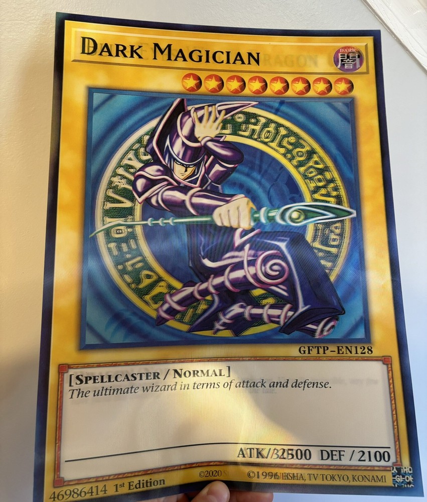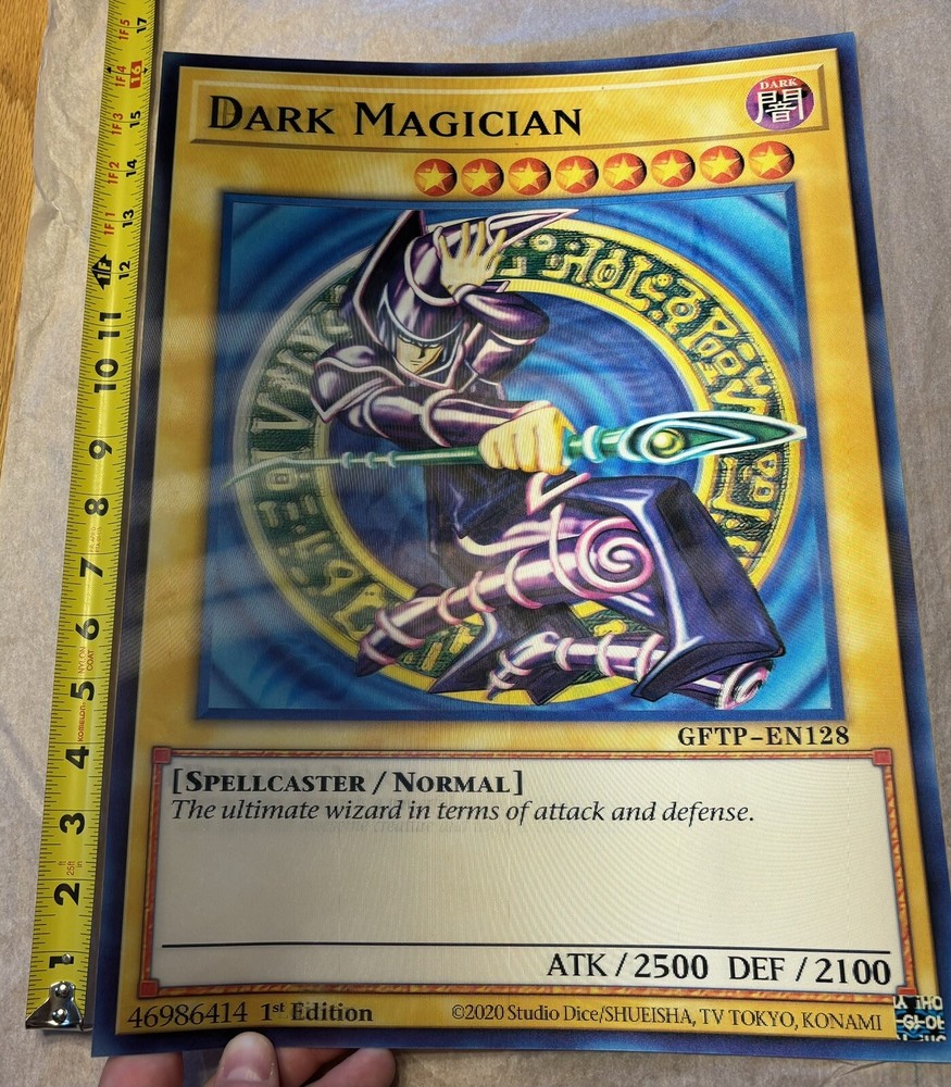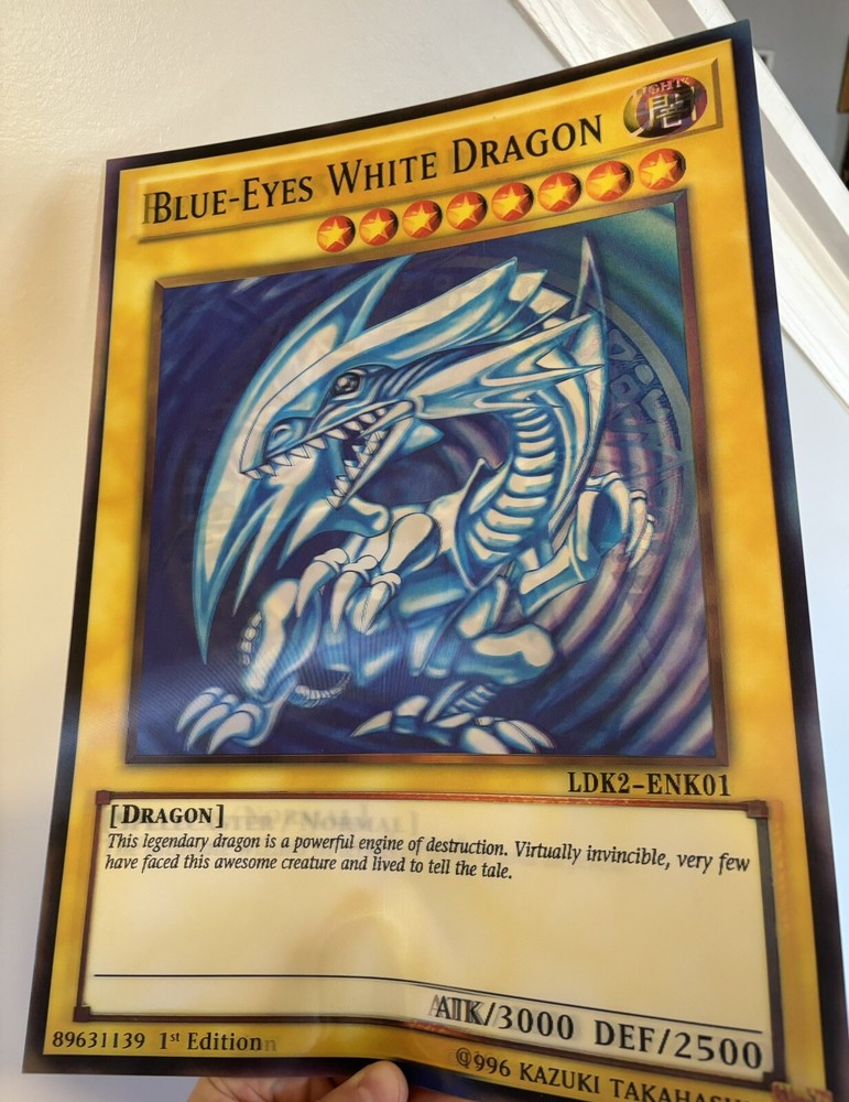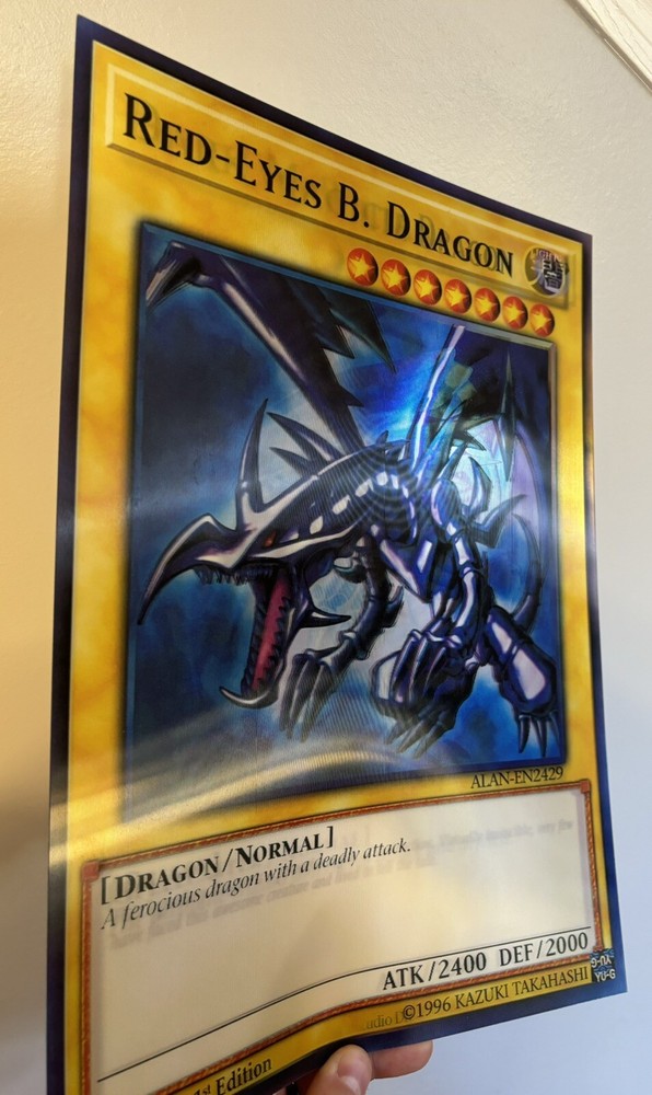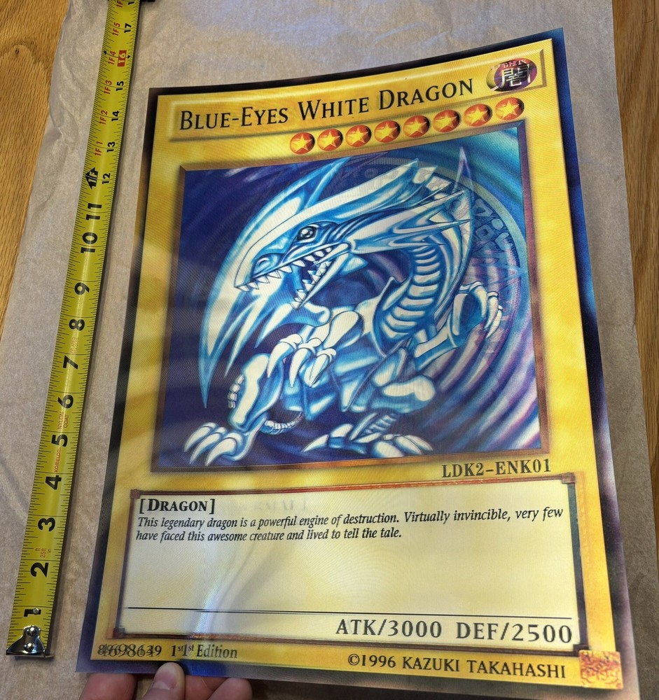 ULTIMATE COLLECTOR’S PIECE! DUE TO THE HOLOGRAPHIC NATURE OF THE ITEM THE PHOTOS DO NOT DO IT JUSTICE. This Yu-Gi-Oh! collectible features 3 characters in 1 depending on your viewing angle including the iconic characters of Dark Magician, Blue-Eyes White Dragon, and Red-Eyes Black Dragon. Fans of the franchise will appreciate the intricate details, striking colors, and holographic nature of this oversized 11.5" x 15.5" card, which is perfect for display (framing recommended) or adding to your general Yu-Gi-Oh! collection. Don't miss your chance to own this unique piece of Yu-Gi-Oh! history! NOTE: THIS IS NOT AN ACTUAL PLAYING CARD BUT A REPLICA HOLOGRAPHIC IMITATION OF THE 3 CARDS IN ONE AND IS MEANT TO BE FRAMED OR DISPLAYED AS A COLLECTOR’S PIECE, NOT USED AS A PLAYING CARD. THE BACK IS BLANK WHITE. Happy to send any additional pictures upon request. I was unable to upload a video as the pictures alone do not fully capture how cool this card is as it rotates between the 3 characters depending on your view angle.