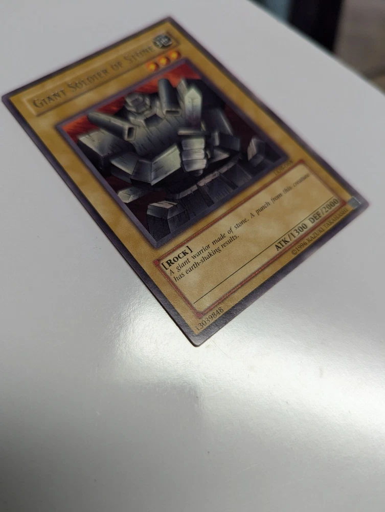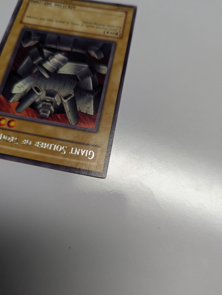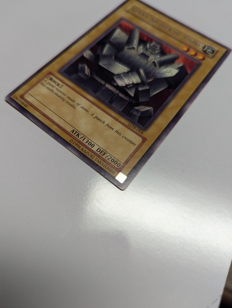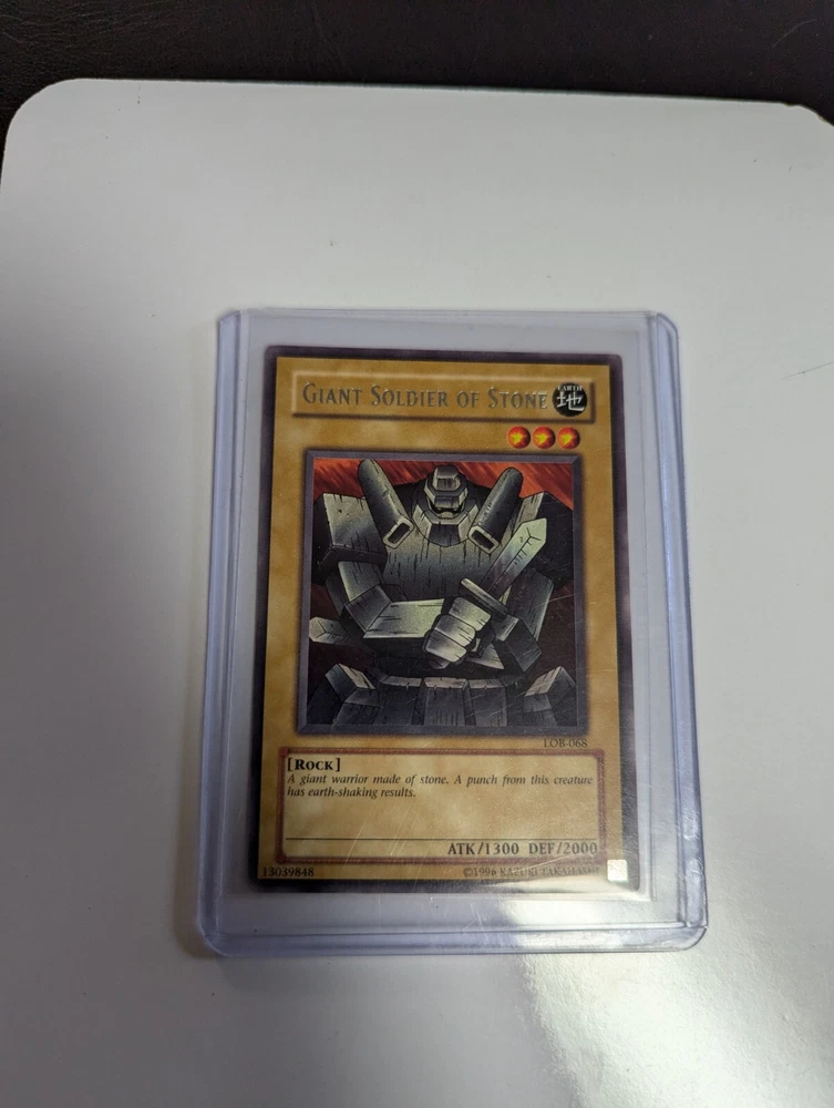 The Giant Soldier of Stone LOB-068 is a rare collectible card from the Yu-Gi-Oh! TCG set The Legend of Blue Eyes White Dragon-Unlimited Edition. This Earth attribute monster with a high defense and attack power of 2000 and 1300 respectively is a legendary rock creature that adds value to any card collection. Manufactured by Konami, this English language card is a sought-after item for fans and collectors alike, known for its unlimited availability and unique design within the world of Yu-Gi-Oh! CCG.
