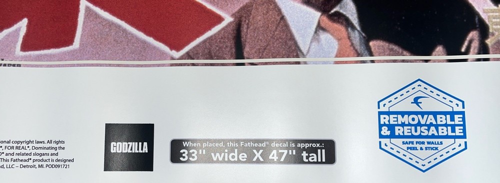 Add a touch of monster to your wall with this Godzilla Fathead decal. Measuring 33x47 inches, this high-quality decal is perfect for any Godzilla fan. The decal is suitable for use on any smooth surface, making it easy to apply to your wall. Featuring the iconic Godzilla character family, this decal is a must-have for any home décor enthusiast. The Fathead brand is known for its high-quality products, and this decal is no exception. Whether you're looking to spruce up your home or office, this Godzilla Fathead decal is the perfect addition.