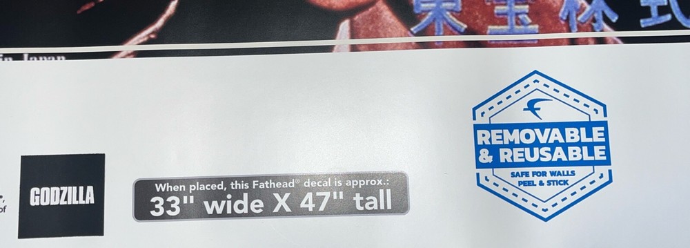 Add a touch of monster to your wall with this Godzilla Fathead decal. Measuring 33x47 inches, this high-quality decal is perfect for any Godzilla fan. The decal is suitable for use on any smooth surface, making it easy to apply to your wall. Featuring the iconic Godzilla character family, this decal is a must-have for any home décor enthusiast. The Fathead brand is known for its high-quality products, and this decal is no exception. Whether you're looking to spruce up your home or office, this Godzilla Fathead decal is the perfect addition.