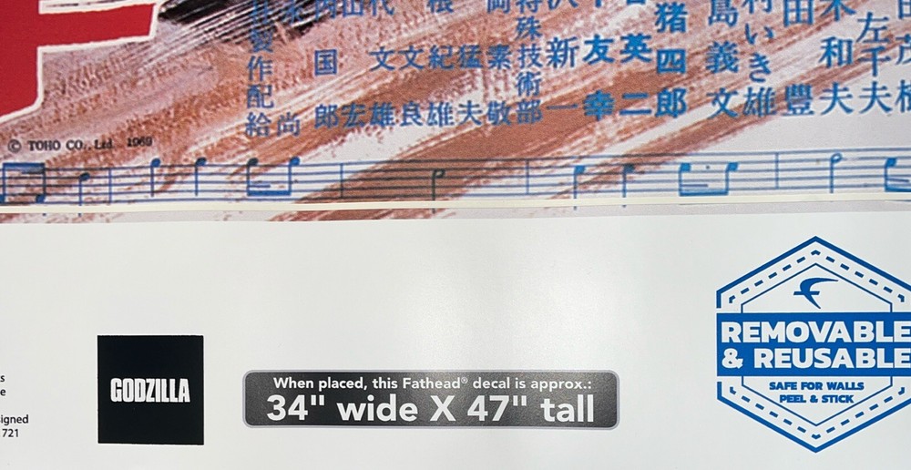 Add a touch of monster to your wall with this Godzilla Fathead decal. Measuring 34x47 inches, this high-quality decal is perfect for any Godzilla fan. The decal is suitable for use on any smooth surface, making it easy to apply to your wall. Featuring the iconic Godzilla character family, this decal is a must-have for any home décor enthusiast. The Fathead brand is known for its high-quality products, and this decal is no exception. Whether you're looking to spruce up your home or office, this Godzilla Fathead decal is the perfect addition.