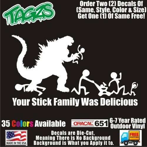 Godzilla Stick Family Funny Die-Cut Vinyl Window Decal Sticker Car Truck SUV JDM Ordering Pick your color from the Vinyl Color Swatch Chart In Listing Pictures above and specify that color in message to seller - 40+ STOCK COLORS. Think carefully about your color choice, you want good contrast between your decal and your application surface. (white and light colors show up and look great on windows, where as black or dark colors blend in and will not show up well unless placed on light colored objects) You must send message to seller for color choice name and number for any colors other than defaults. If you just give a color without the number we are going to use our best judgment to fulfill your order, we stock different shades of blues, reds etc... In order to keep our production accurate we ask that you "Please Keep Your Color Choice To One Color Only Per Order" in other words if you want two different colors of the same item, add the item to your cart as separate line items and indicate your desired color for each item in message to seller. Discounts Order Two get One Free Discount, All Decals Must be the same Style, Color and Size! (Free Decal will be automatically shipped with your order, Nothing more is needed to be done on your part.) BUY 2 Decals that are the same style, color and size, and get and get a third FREE! All you have to do is check out with a quantity of 2 or more of the same Style, Color and Size Decal, and we will ship an extra Decal for free! (To be clear this is NOT a buy 3 and we refund you one. If you want a total of 3 please only check out with 2 decals .) Free decals will be the same Style, Color and Size as the decal(s) ordered, please don't request multiple Styles, Colors or Sizes on the same item. I f you want different Styles, Colors and Sizes add the item to your cart as separate line items and indicate your desired color for each item in message to seller. About US We are entering our 22th year in the sign and graphic design business, We do things the right way. We are USA based, all your products are produced and shipped in the USA. (No Foreign Junk, No 2-3 Month Shipping Times, No Missing Orders and No Scams.) We do custom orders and sizes, please contact us for your special requests. We don't use cheap application tape on our decals. your decals will be produced with Professional High-Tac Application Mask Tape . We only use the industries best vinyl films from Oracal , Minimum 7 year durability. Customer Satisfaction We are human and we will make mistakes now and then, please allow us to correct them before you leave negative feedback. We want all of our customers to be totally satisfied with their purchases. If for any reason you have a problem, please message us before you give Neutral or Negative feedback. We will do all we can to make it right! Feedback Feedback is very important in the ebay community. We leave feedback for every item we sell. Please help us out and leave us feedback when you receive your item. If you feel you can't give us an all 5-star rating, please let us know why so we can improve! Please feel free to contact us with any questions Shipping Policy All Orders With A Combined Order Total Of 19.95 And Up Will Be Upgraded To USPS First Class Package Shipping With Tracking For Free! All Shipping is FREE USPS First Class Mail by default, meaning snail mail, which can take up to 12+ days. You Have the option to upgrade your shipping to USPS First Class with tracking (Normally 3-5 Days) at Checkout. Ebay will arbitrarily guarantee FALSE shipping times which we have no control over, to be clear we ship regular USPS FIRST CLASS MAIL and Your Order Should Arrive in 2-12 Business Days. Saturday , Sunday and Holidays are NOT Business Days We ship our decals on the same day or the next business day following your purchase (Monday - Friday). Orders placed after 1:00PM CST. will be shipped on the following Business Day. In order to offer FREE shipping, we use USPS First Class Letter Mail by default. This has proven to be reliable and quick as well as affordable. Unfortunately, tracking information is NOT available Unless you upgrade to USPS First Class Package Shipping at Checkout . Please Allow 2-12 Days for delivery. If your order has not arrived in 12 Business days please contact us ASAP. Note: Please make sure that your shipping address is correct. All items will be delivered to the address that is listed on your Ebay account used for ordering. If the item is not received or lost in shipping, please contact us for assistance in this matter. Items that are not delivered or returned by shipping carrier because of wrong address, incomplete address, inaccessible address, expired forwarding etc... will only be refunded purchase price less shipping costs and ebay fees, if the item is returned to us by the shipper, this applies to all items regardless if the item was free shipping. (items not returned by shipper will not be refunded) MAKE SURE YOUR EBAY SHIPPING ADDRESS IS CORRECT. Payment Policy Immediate payment is required, We accept payments through Ebay Payments (Credit Card, eCheck, Debit). We ask that all payments be made within 24 hours of purchase. Return Policy Customer Satisfaction is our number one priority. If your Item is defective or not as advertised, you can return it within 30 days and we will refund the purchase price. · We will not be responsible for buyer mistakes when applying decals. Returns must be in 100% brand new unopened condition (sealed original manufacturer packaging or in the same condition as received). Original shipping and handling fee is non-refundable unless the product is defective or not as described. Items that are returned by shipping carrier because of wrong address, incomplete address, inaccessible address, expired forwarding etc... will only be refunded purchase price less shipping cost and ebay fees, this applies to all items regardless if the item was free shipping. MAKE SURE YOUR EBAY AND PAYPAL S