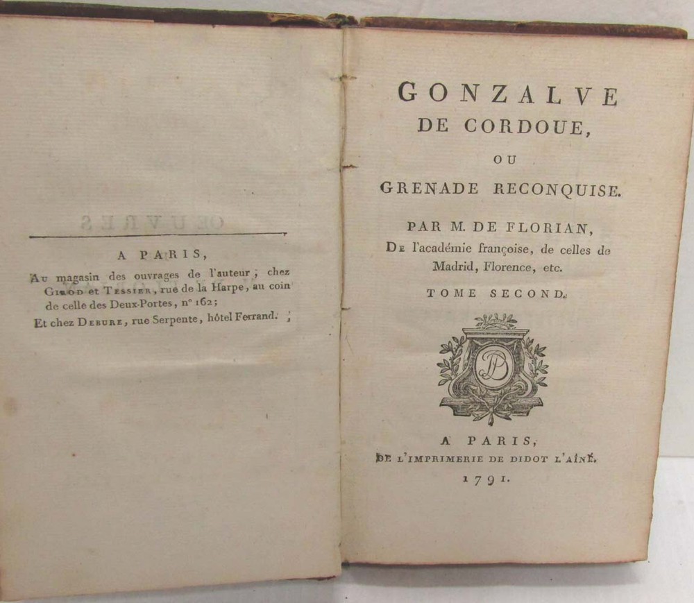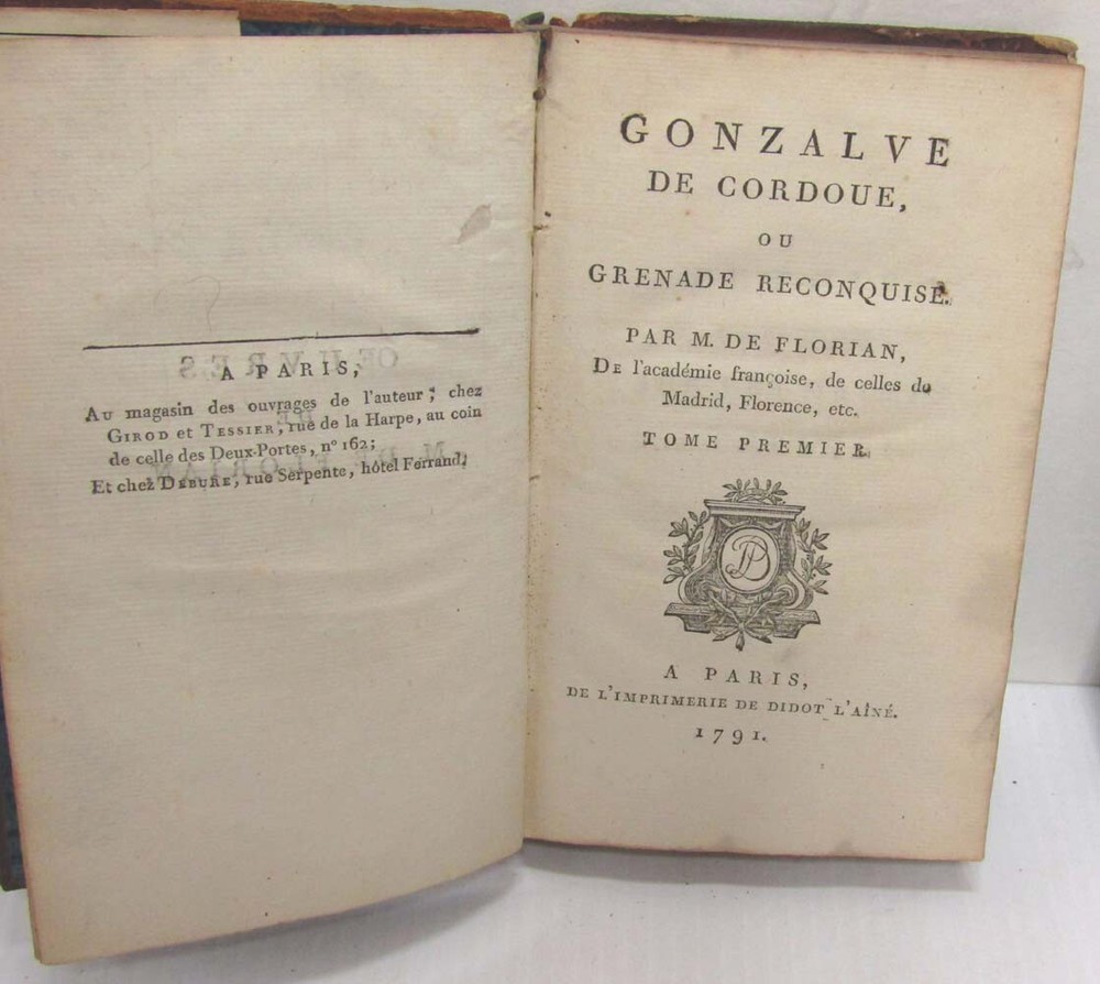Gonzalve De Cordoue ou Grenade Reconuise M. De Florian Paris: De L'Imprimerie De Didot L'Aine, 1791. First edition complete in two volumes. Each volume measures 4 3/4" x 7 3/4". Bound in full leather with gilt stamped spines. VG- condition. The leather is dry and is rubbed and chipped at the corners, spine tips, and along the front spine seams. The gilt on the spines is dull. Former owner's book plate on front endpapers. Name inked on the front fly leafs' versos. Light foxing through-out. Text is in French. Part of the "Oeuvres" of M. De Florian.
