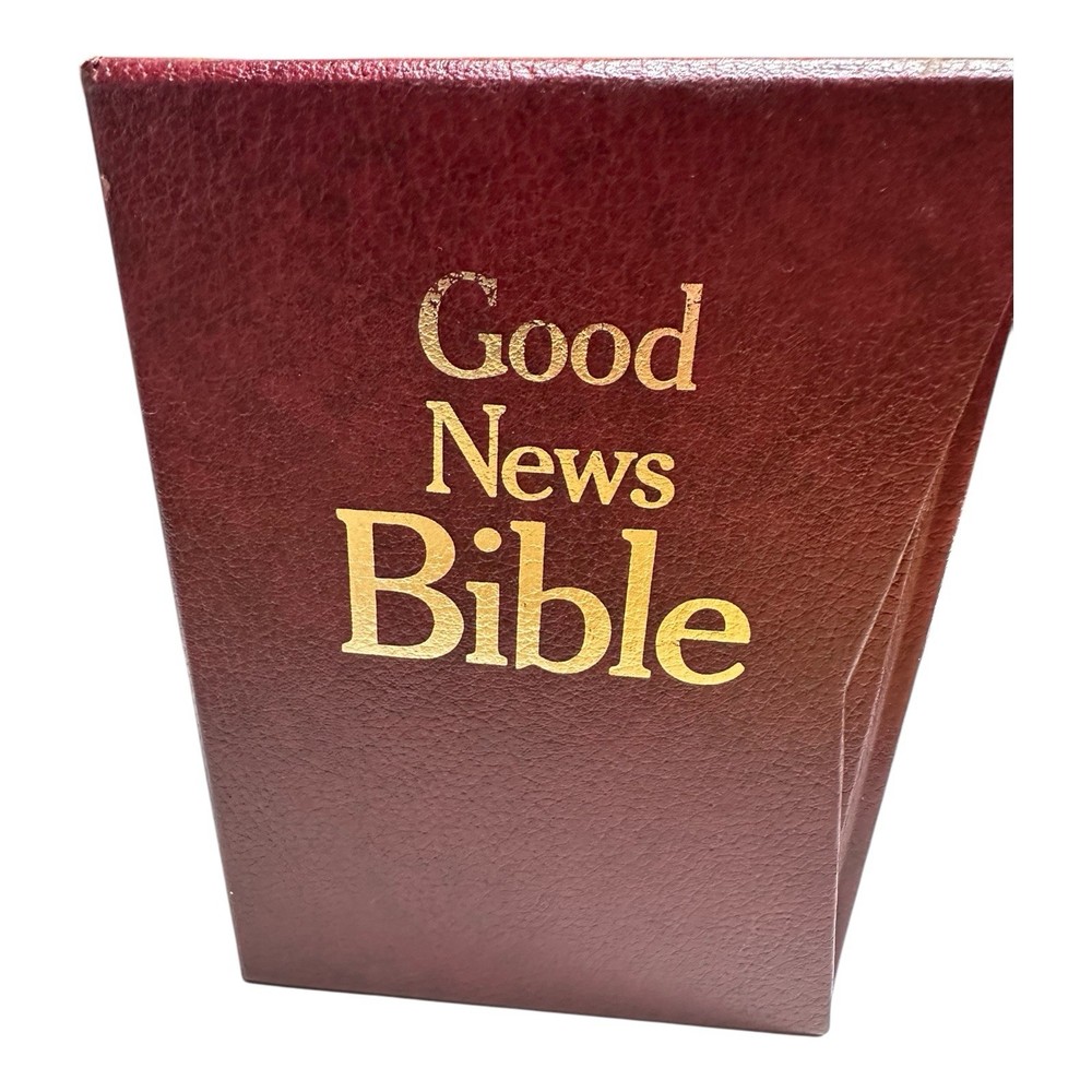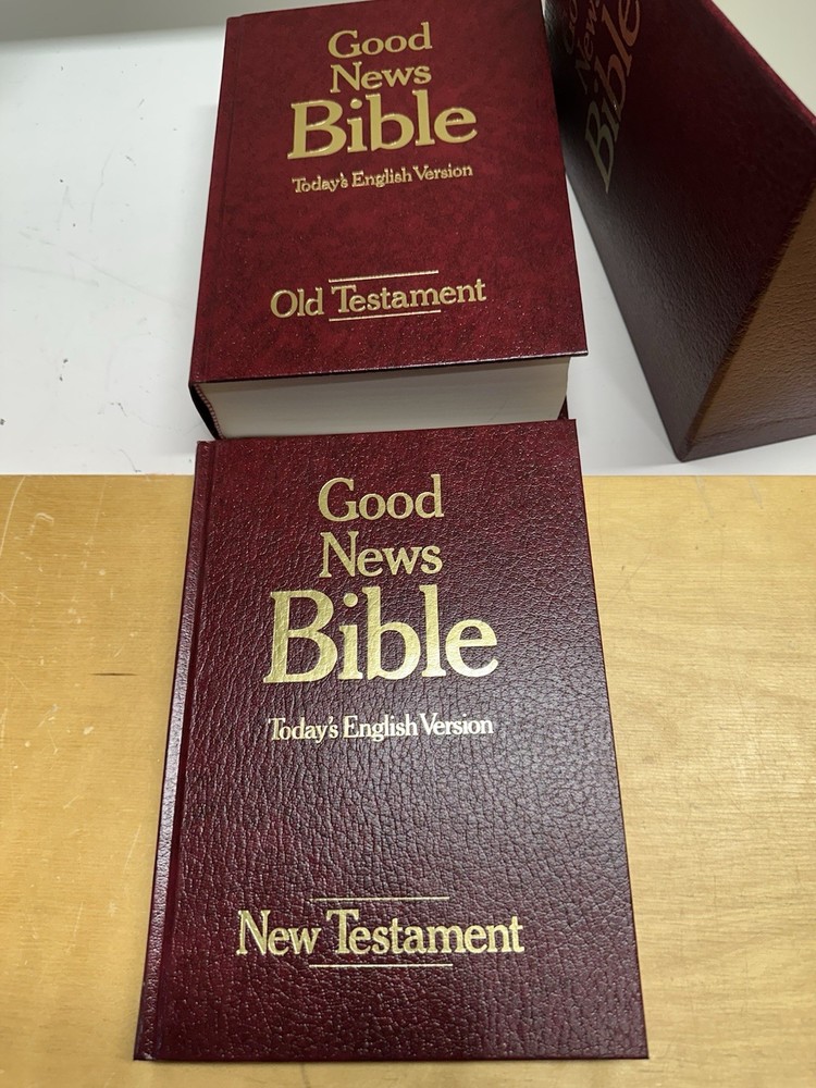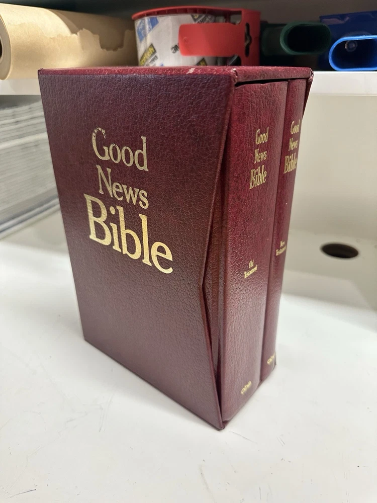 This vintage 2-book set of the Good News Bible Today's English Version from 1976 is a limited edition published by the American Bible Society. The faux leather-bound hardcovers are in excellent condition and contain nonfiction narratives intended for adults. The books are written in English and feature a box set bundle of two volumes. The Good News Bible Today's English Version is a religious and spiritual genre book that is perfect for those interested in the Christian faith. The books are signed by no one and are written by God. This Bible is perfect for collectors and those looking for a timeless piece of literature.