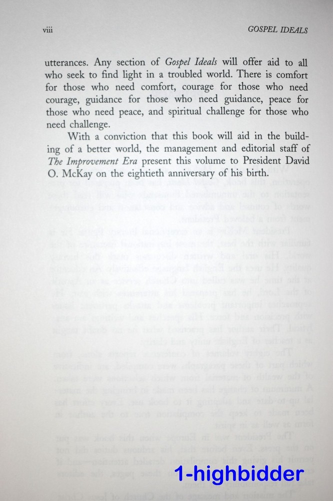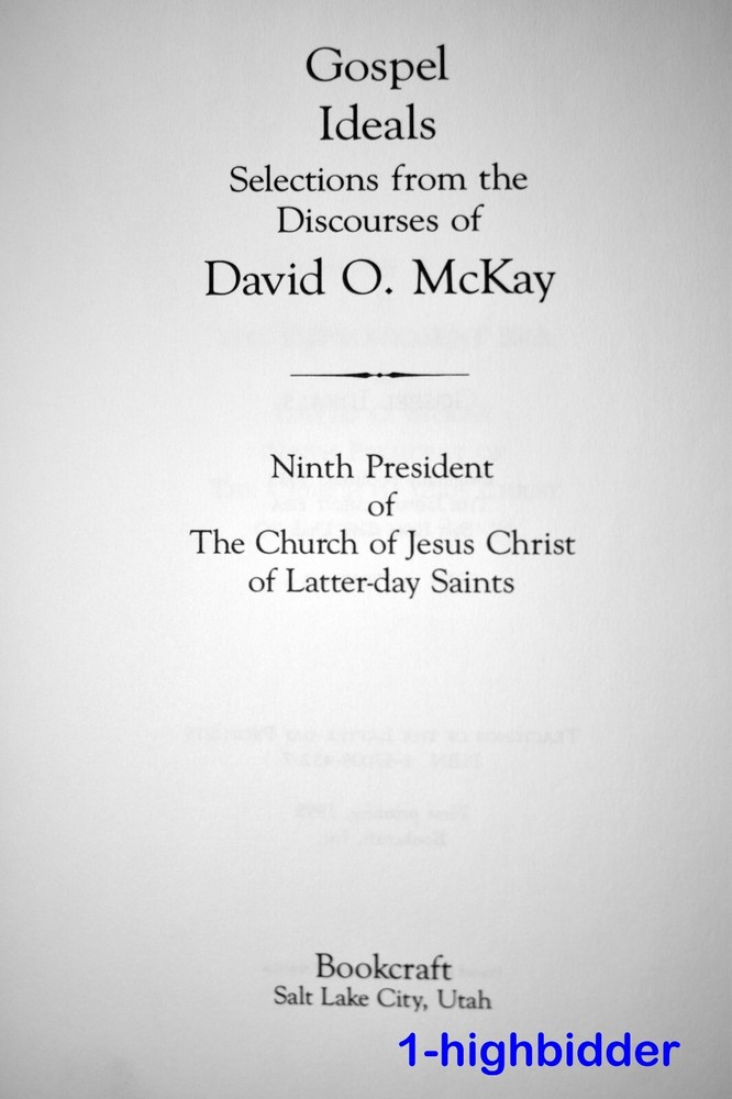 Gospel Ideals David O. McKay Teachings of Latter-day Prophets Leather Special Ed. ___________________________________________ Gospel Ideals: Selections and Discourses of David O. McKay, Volume 9 by David O. McKay Published by Bookcraft (1998) This is Volume 9 from the special leatherette bound 16 volume set of "Teachings of the Latter-day Prophets". Condition: LIKE NEW 1st Edition Green Leatherette Bound Hardcover Book! The binding is tight and all 600 pages within are bright white with NO WRITING, UNDERLINING, HIGH-LIGHTING, RIPS, TEARS, BENDS OF FOLDS! The covers look near perfect as can be seen in my photos. The book has a dark green sewn-in bookmarker and gold gilded page edges. You will be happy with this one! Always handled carefully and packaged securely! Buy with confidence from a seller who takes the time to show you the details and not use just stock photos. Please check out all my pictures and email with any questions! Thanks for looking! Copyright © 2018-2025 TDM Inc. The photos and text in this listing are copyrighted. I spend lots of time writing up my descriptions and despise it when un-original losers cut and paste my descriptions in as their own. It is against ebay policy and if you are caught, you will be reported to ebay and could be sued for copyright infringement and damages.