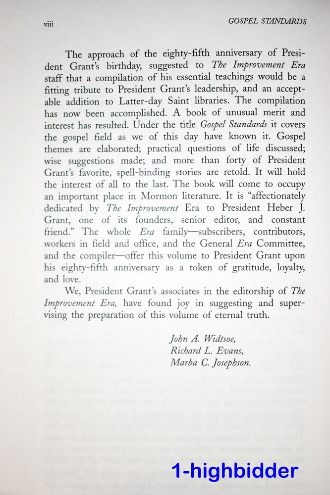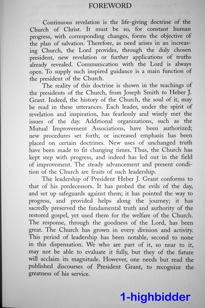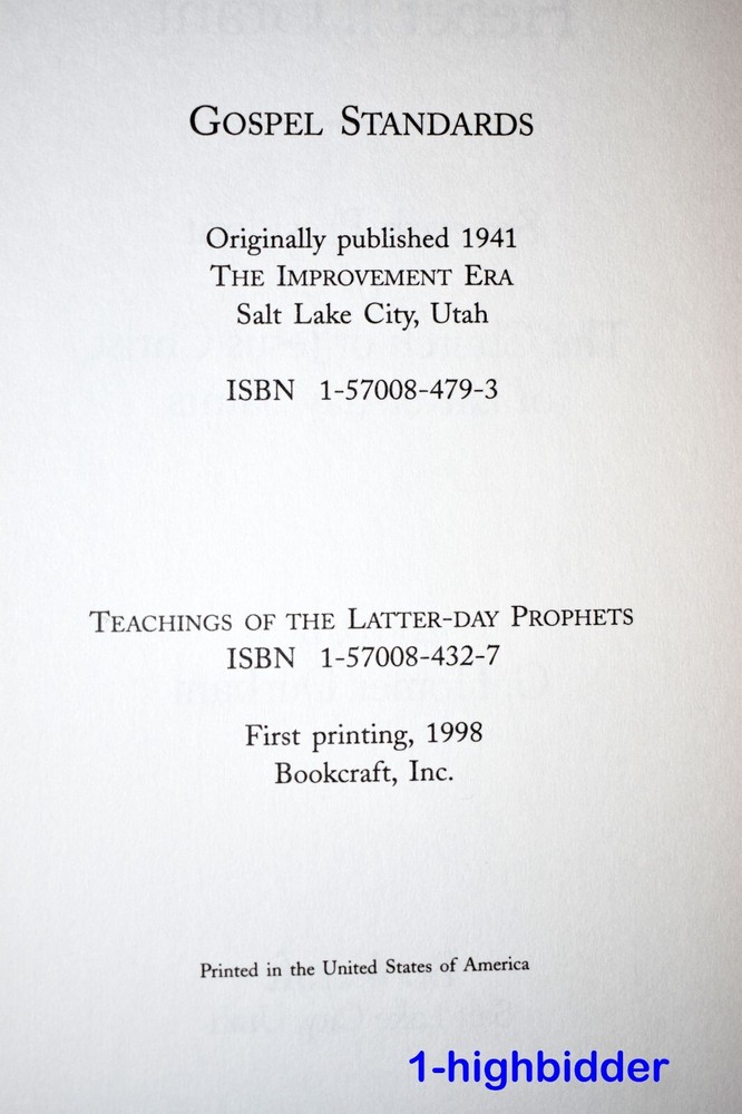 Gospel Standards Heber J Grant Teachings of Latter-day Prophets Leather Special Ed. ___________________________________________ Gospel Standards: Selections from the Sermons and Writings of Heber J. Grant, Volume 7 by Heber J. Grant Edited by G. Homer Durham Published by Bookcraft (1998) This is Volume 7 from the special leatherette bound 16 volume set of "Teachings of the Latter-day Prophets". Condition: LIKE NEW 1st Edition Green Leatherette Bound Hardcover Book! The binding is tight and all 498 pages within are bright white with NO WRITING, UNDERLINING, HIGH-LIGHTING, RIPS, TEARS, BENDS OF FOLDS! The covers look near perfect as can be seen in my photos. The book has a dark green sewn-in bookmarker and gold gilded page edges. You will be happy with this one! Always handled carefully and packaged securely! Buy with confidence from a seller who takes the time to show you the details and not use just stock photos. Please check out all my pictures and email with any questions! Thanks for looking! Copyright © 2018-2025 TDM Inc. The photos and text in this listing are copyrighted. I spend lots of time writing up my descriptions and despise it when un-original losers cut and paste my descriptions in as their own. It is against ebay policy and if you are caught, you will be reported to ebay and could be sued for copyright infringement and damages.