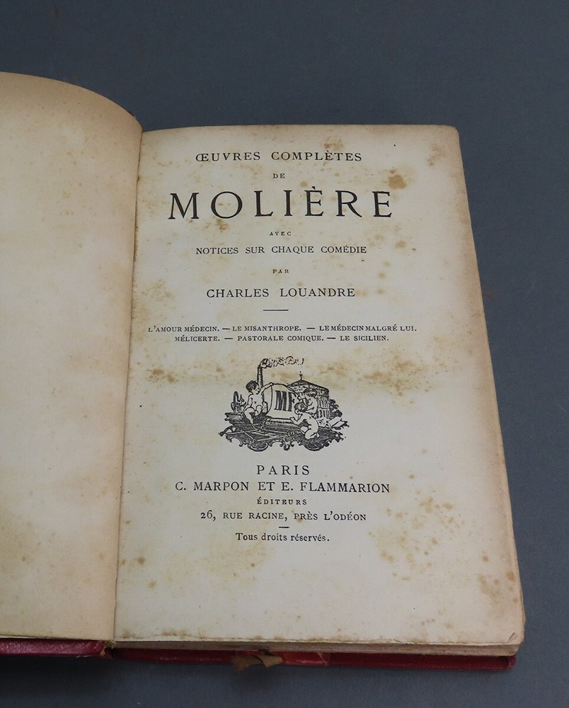 Presented is an 8 volume set of The Complete Works of Moliere in the original French. The books have a beautiful red 3/4 leather binding and marble paper. The set was published in Paris by Marpon and Flammarion between 1890-1910. The books are 6 3/8 inches by 4 1/4 inches in size. They have 3/4 leather binding and five-ribbed spines with marble paper on the outside and inside flap. There is also gilding on the top edges of the page. Condition: As you can see in the photos, there is some wear on this set. There are some loose pages in the first and seventh volumes. The seventh volume also appears to have some water damage. This set is in fair condition for its age, but would make a great addition to any bookcase or display shelves. -kc Powered by SixBit's eCommerce Solution