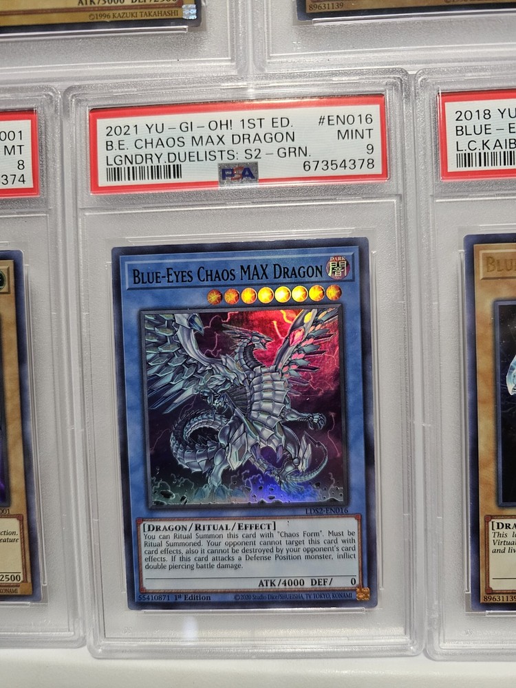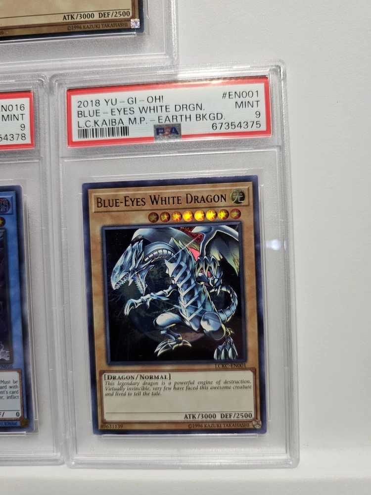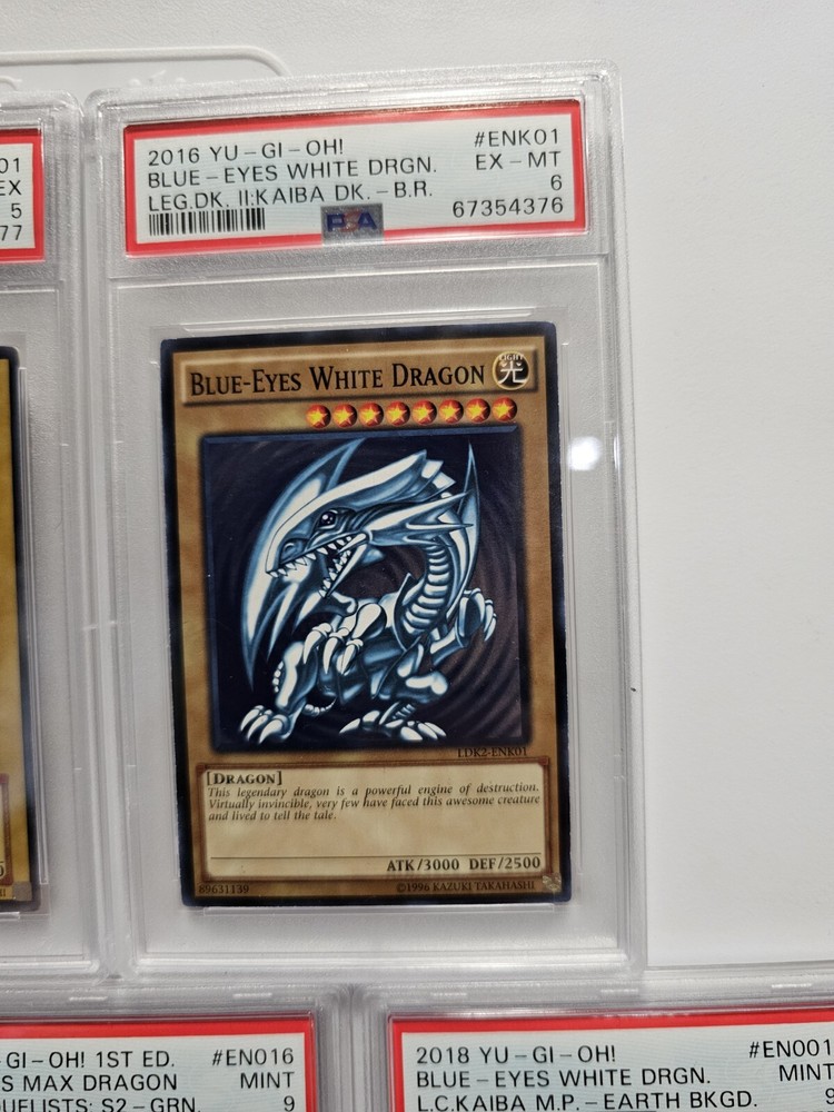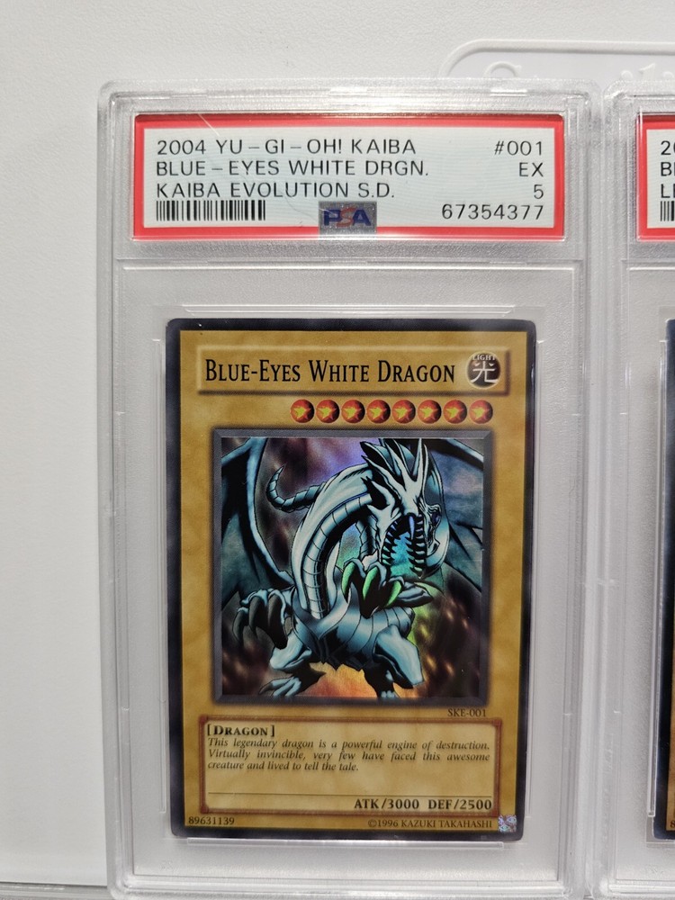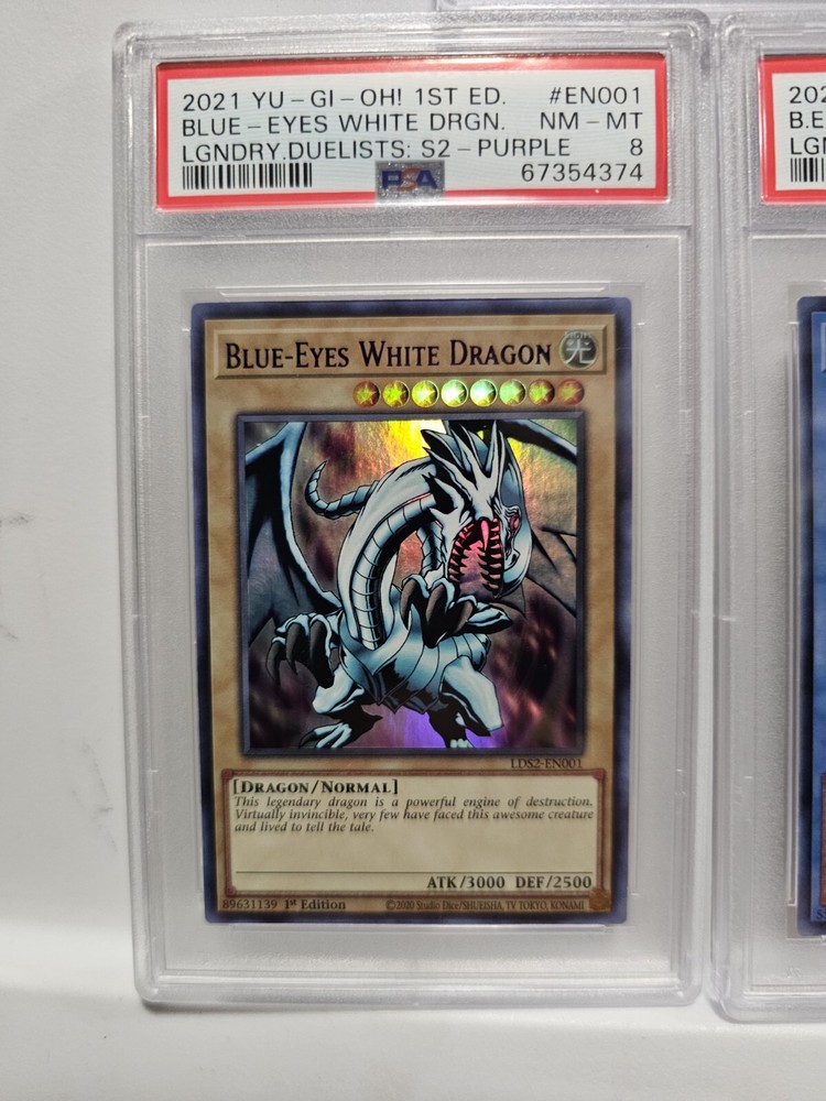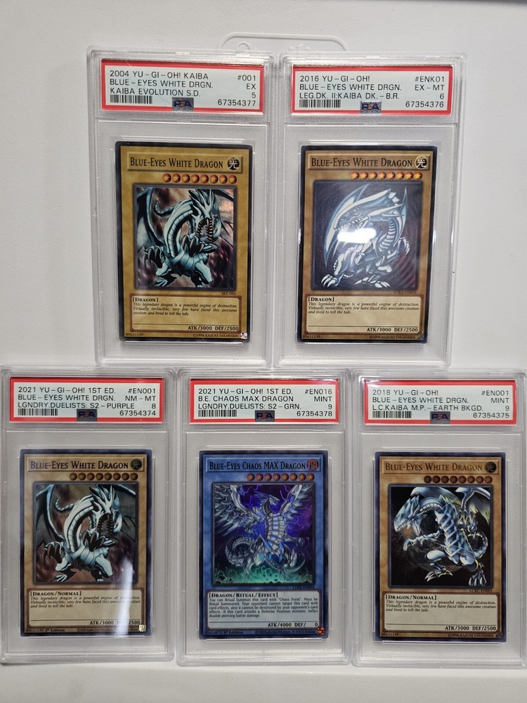 This Greded Blue-eyes White Dragon Collection includes 5 PSA graded cards, perfect for any collector or fan of the popular card game. The set features Dragons as the main focus, with each card displaying various shades of the color blue. Each card is expertly graded by PSA, ensuring their authenticity and value. Whether you're adding to your existing collection or starting a new one, this set is a must-have for any serious collector. Don't miss out on this opportunity to own these highly sought-after cards.