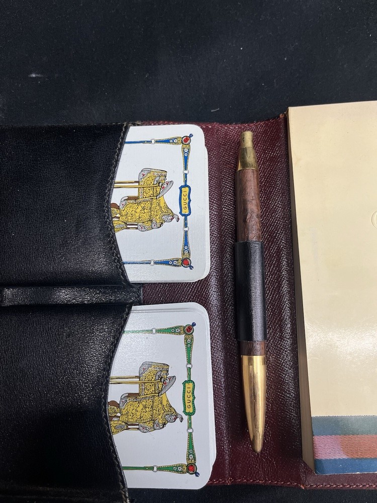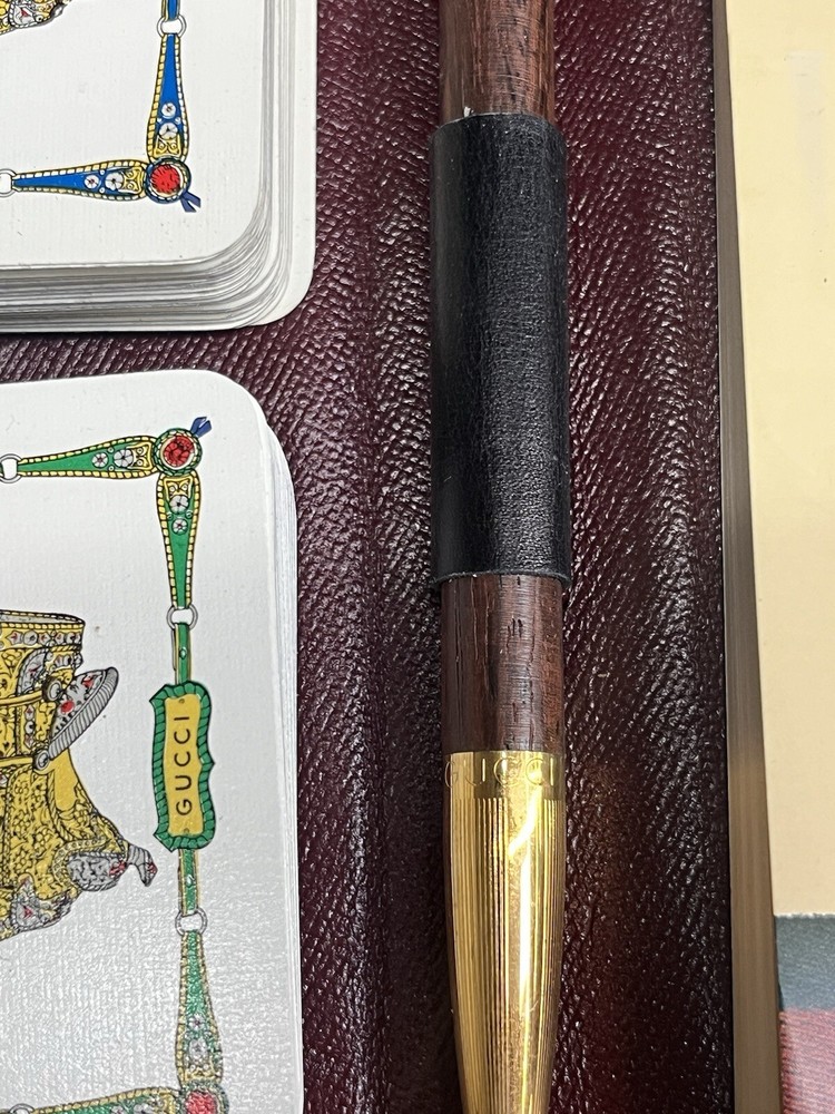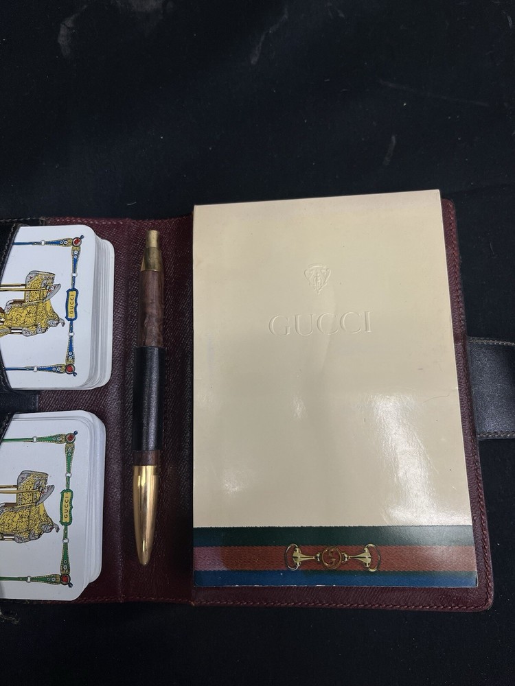 Gucci Leather Game Set with Cards, Pen & Notebook $ 237.6 Gucci Leather Bound Game Set With Playing Cards, Pen, & Notebook... Flower Bowl quantity Add To Cart Description Specifics Reviews (2) Description Gucci Leather Bound Game Set With Playing Cards, Pen, & Notebook Specifics Brand Gucci Reviews Rated 3 out of 5 Bogdan Dragomir Order completed successfully—tracked and on time Rated 3 out of 5 joeherrjr553 Very good