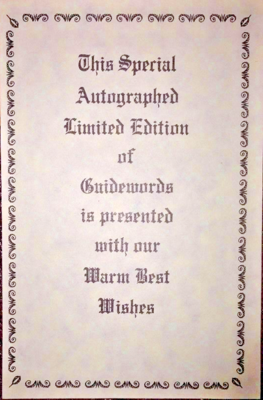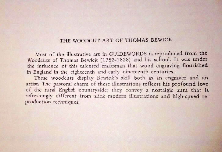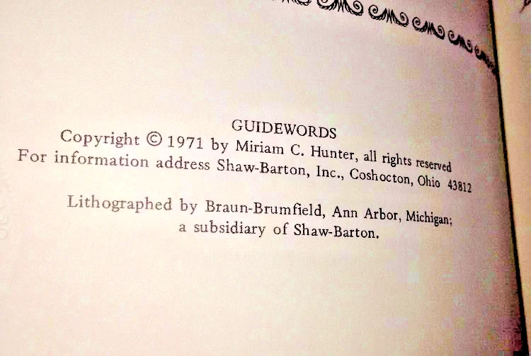Guidewords an: Anthology of Inspiration and Humor (1971) Miriam C. Hunter Shaw-Barton Publishers, Ohio, 1971 Excellent Condition Like new unread No writing or marks Sharp corners Interior pages are clean and bright Brown leatherette binder 256 tight pages Embossed title and decoration on front. Woodcut illustrations. Illus: Thomas Bewick [Inspirational, Humor] Lithographed by Braun-Brumfield Not from Publisher enclosed. You will not find a complete high quality copy Great gift for family, friends, or the collector. Note: Box has staining never went through though