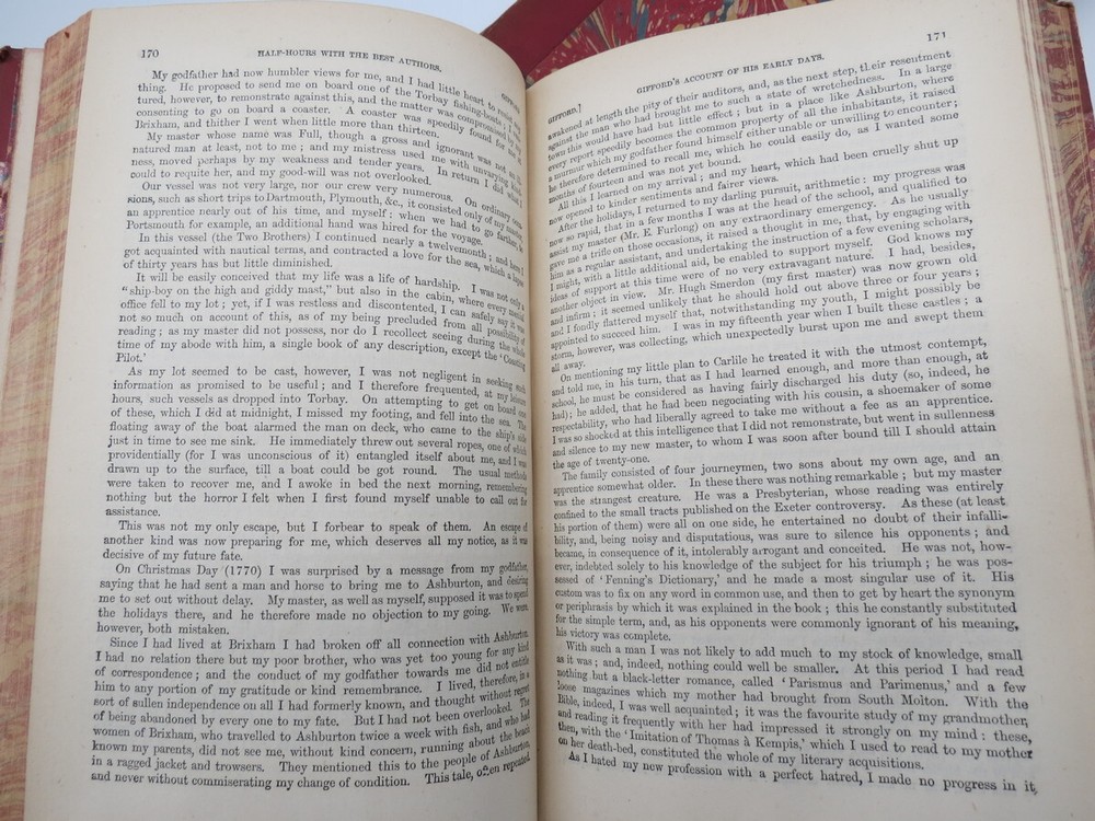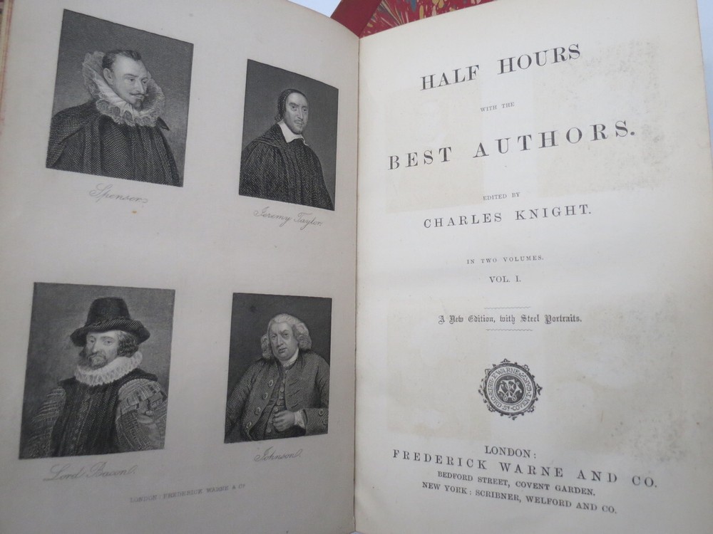 HALF-HOURS WITH THE BEST AUTHORS (COMPLETE 2 VOLUME LEATHER BOUND SET) A New Edition with Steel Portraits Author: by Charles Knight Cover: Hardcover Publisher: Frederick Warne and Co. Date: 1890 Book: VG Complete 2 volume set. Three quarter maroon calf leather with 5 raised bands, gilt stamped spine and brown leather title box are worn at the extremities and spines are toned to an attractive tan but clean, bright, and In very good- condition. Boards and spines are straight. Bindings are tight. Former owner's antiquated bookplate affxied to front paste downs. Marbled end sheets clean and bright. Engraved frontispieces and plates. Pages are clean and very good. One page is torn and missing half the page. . Sage Rare & Collectible Books specializes in first editions, signed editions, fine bindings, antiquarian, vintage, out-of-print, and rare books. We provide a complete and detailed condition description of each book so you know precisely what you are ordering.