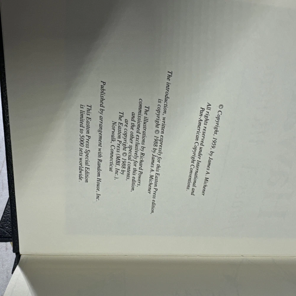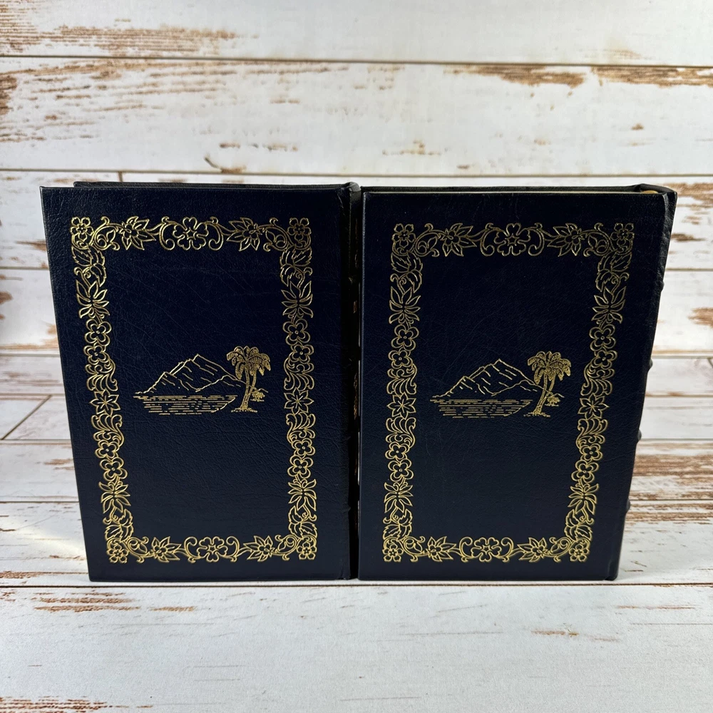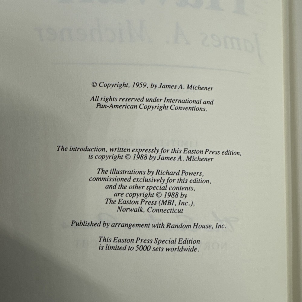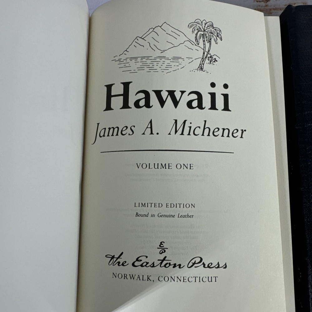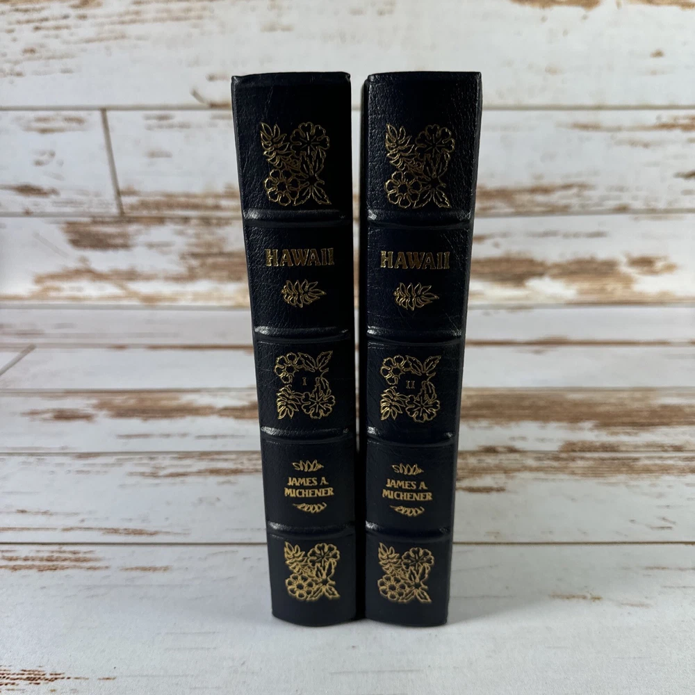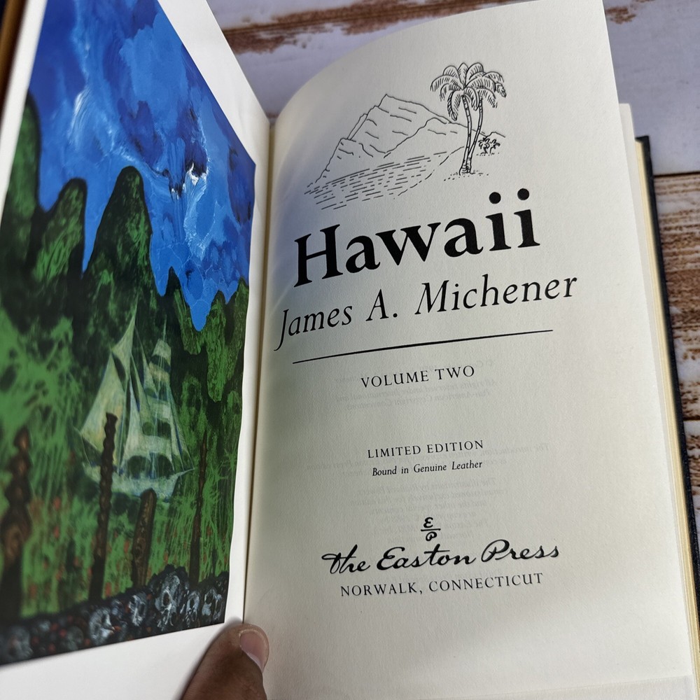 This special limited edition 2-volume set by James Michener is a must-have for any collector or enthusiast of Hawaii's history. Published in 1988 by Easton Press, this luxury edition is bound in leather and features raised hubs on the spine, numbered pages, and a gold gilt decoration. The book also includes a book mark ribbon and a color frontispiece by Richard Powers. With its original and fascinating illustrations, this limited edition book is a rare find that will make a great addition to any collection. The author's vivid descriptions and captivating storytelling make this a unique and valuable addition to any bookshelf. Don't miss your chance to own this incredible piece of history. Storage