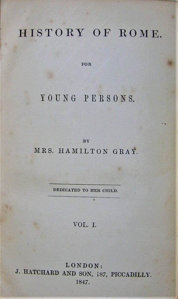 THE HISTORY OF ROME IS THE MOST REMARKABLE HISTORY IN THE WORLD, AND THE KNOWLEDGE OF IT IS ABSOLUTELY NECESSARY TO EVERY EDUCATED PERSON. ROME IS NOW THE CAPITAL OF ITALY AND THE CHIEF SEAT OF THE ROMAN CATHOLIC CHURCH. THE WORKS OF THE ROMANS WERE ALL USEFUL, AND SO SOLIDLY CONSTRUCTED THAT MANY OF THEIR CAMPS AND ROADS, AND THE FOUNDATIONS OF THEIR BATHS AND OTHER BUILDINGS EXIST TO THE PRESENT DAY. MRS. GRAY TAKE US ON A JOURNEY THAT STARTS WITH ROMULUS AND CONTINUES ON A EPIC LEVEL ALL THE WAY THROUGH MARK ANTHONY. Elizabeth Caroline Hamilton Gray , 1800 – 21 February 1887) was a Scottish historian and travel author, born in Alva, as the eldest daughter of James Raymond Johnstone. After marrying John Hamilton Gray in June 1829, Gray moved to Bolsover Castle in England, where she lived until shortly before her death. Gray became interested in the history of the Etruscans after visiting an exhibition of their artefacts in London organised by Domenico Campanari in 1837. She pursued the subject on a visit to Italy in 1837–1839, drawing on contacts in German and Italian archaeological circles. In 1840 she published Tour to the Sepulchres of Etruria , which served as an account of her archaeological research. She then wrote a general History of Rome 1843–1844. As a woman, Gray was attacked for conducting historical research.
