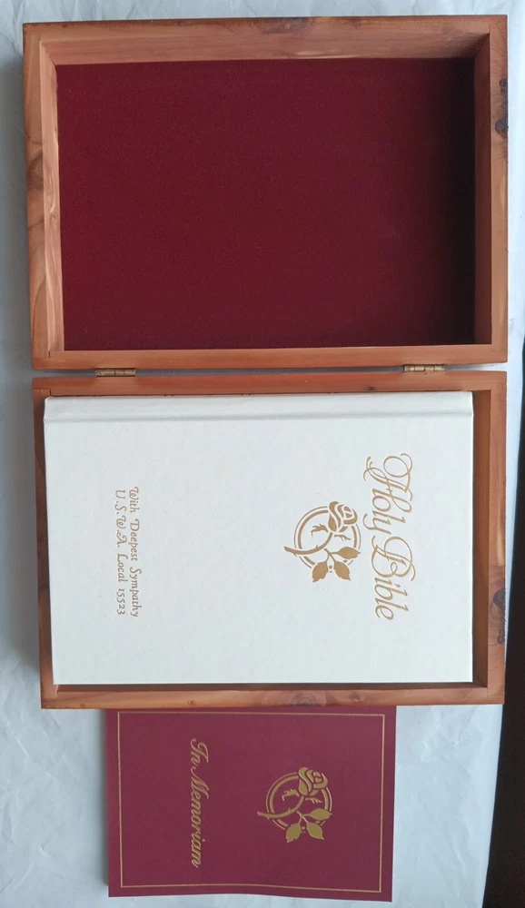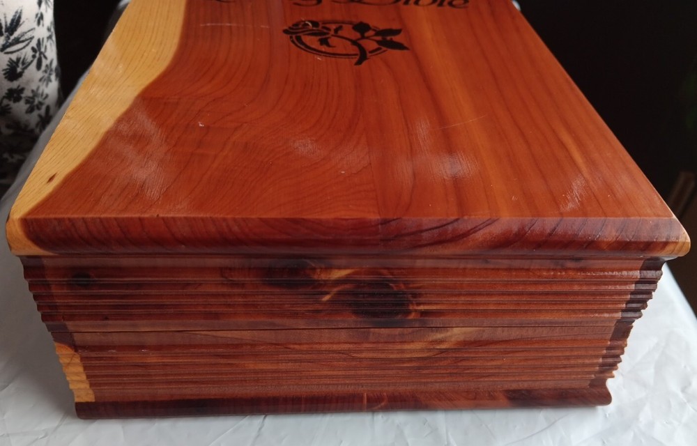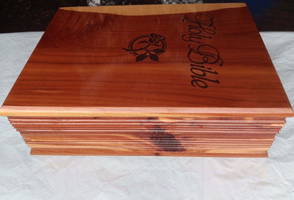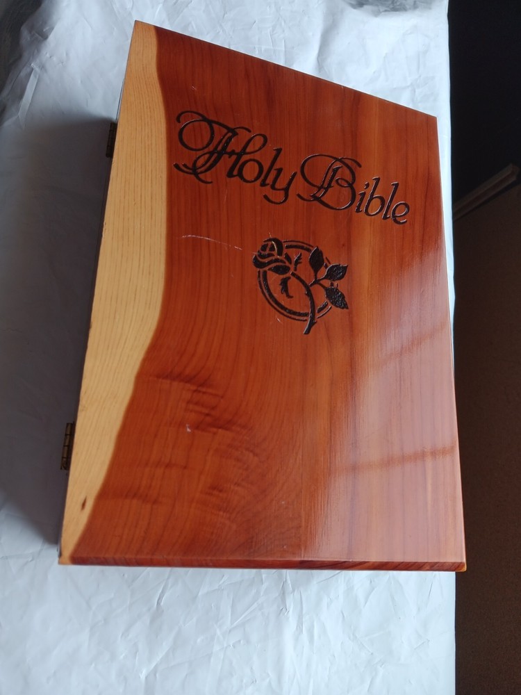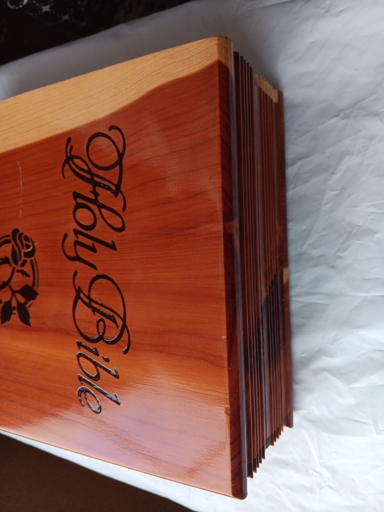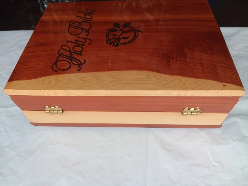 This beautifully crafted Holy Bible comes in a unique wooden engraved carved rose cedar case box, making it an ideal gift for young adults and adults. The King James Version edition of the Bible has been published by Thomas Nelson in 1984, and is a nonfiction narrative type that covers a wide range of religious and belief-related topics. The Bible features a faux leather bound cover, with illustrations and self-pronouncing red letter edition, all neatly boxed. The inscription and personalization option make it an excellent choice for a memorial or sympathy gift. The Bible is written in English and is a vintage piece from the 1980s. Mostly great condition. Small scratch along the gold edges of the pages and a few scratches on the front or top of cedar chest. Box has a small chip in bottom, right corner. Please view all photos before purchasing.