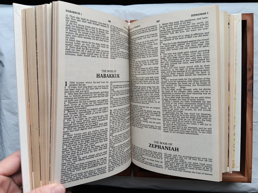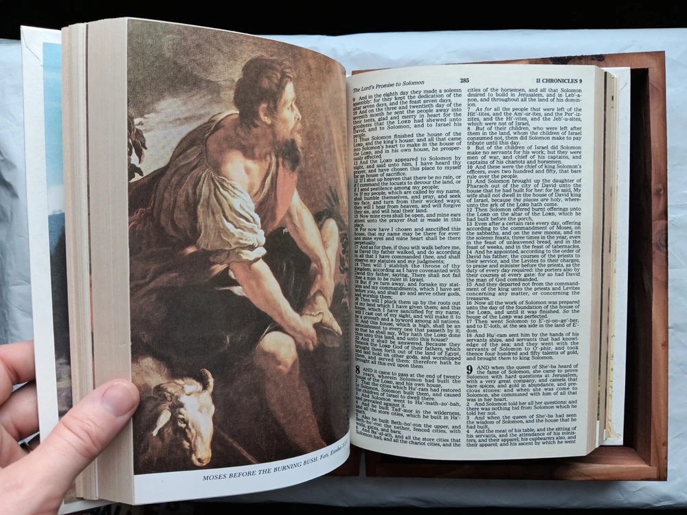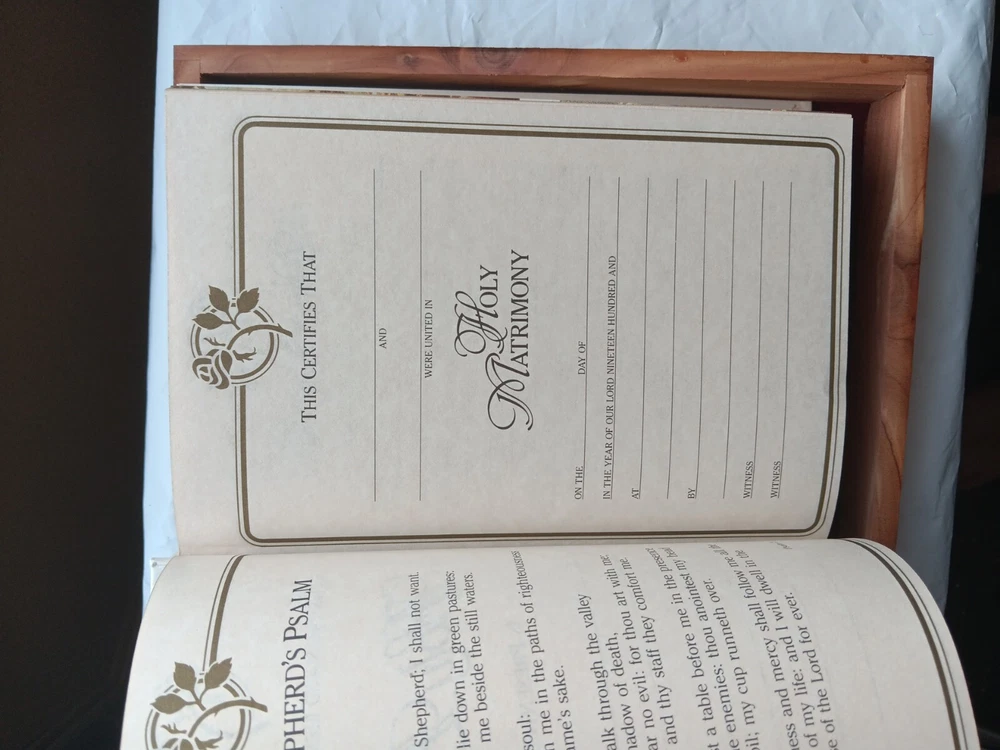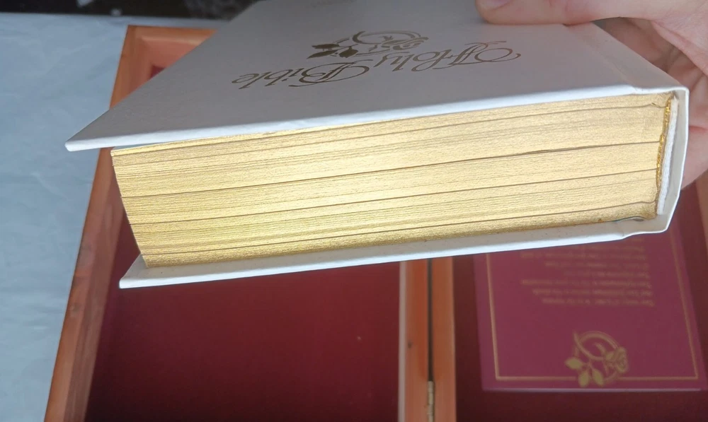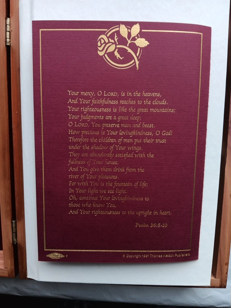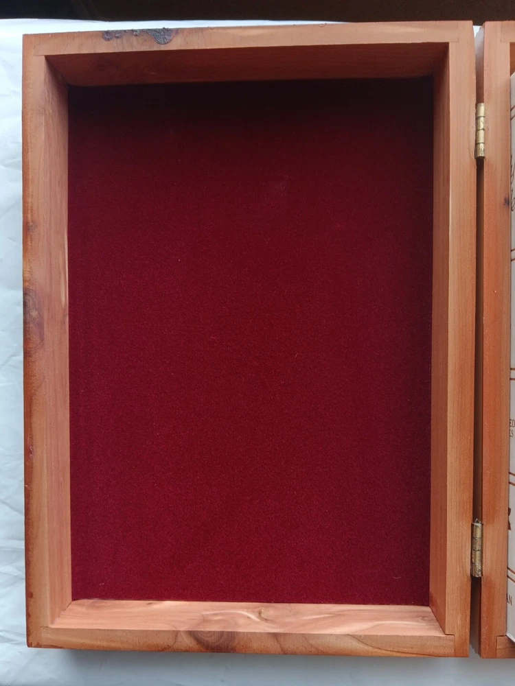 This beautifully crafted Holy Bible comes in a unique wooden engraved carved rose cedar case box, making it an ideal gift for young adults and adults. The King James Version edition of the Bible has been published by Thomas Nelson in 1984, and is a nonfiction narrative type that covers a wide range of religious and belief-related topics. The Bible features a faux leather bound cover, with illustrations and self-pronouncing red letter edition, all neatly boxed. The inscription and personalization option make it an excellent choice for a memorial or sympathy gift. The Bible is written in English and is a vintage piece from the 1980s. Mostly great condition. Small scratch along the gold edges of the pages and a few scratches on the front or top of cedar chest. Box has a small chip in bottom, right corner. Please view all photos before purchasing.