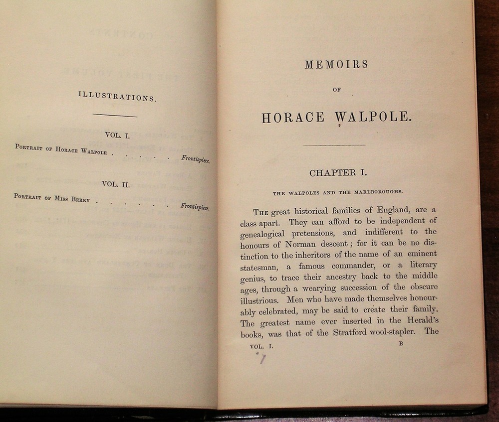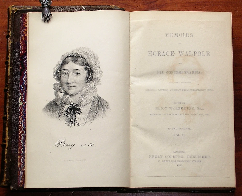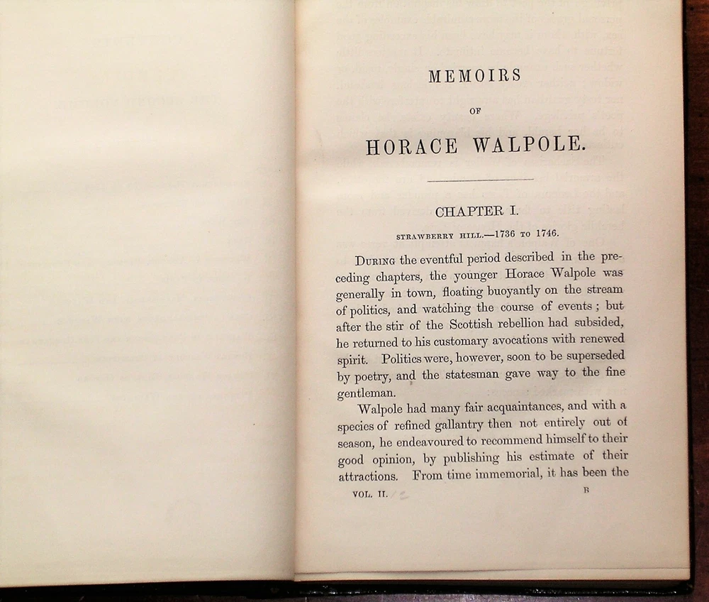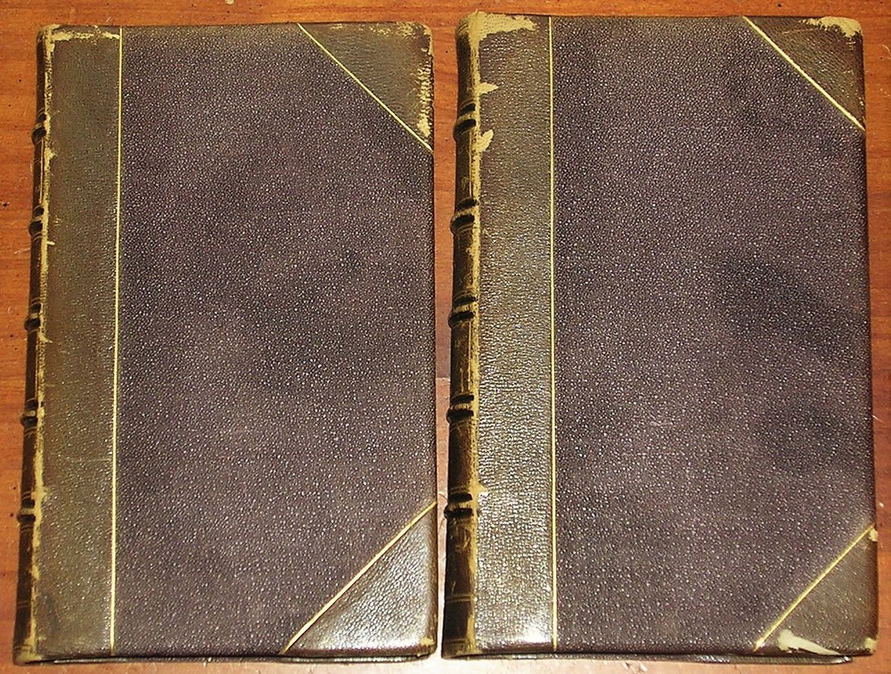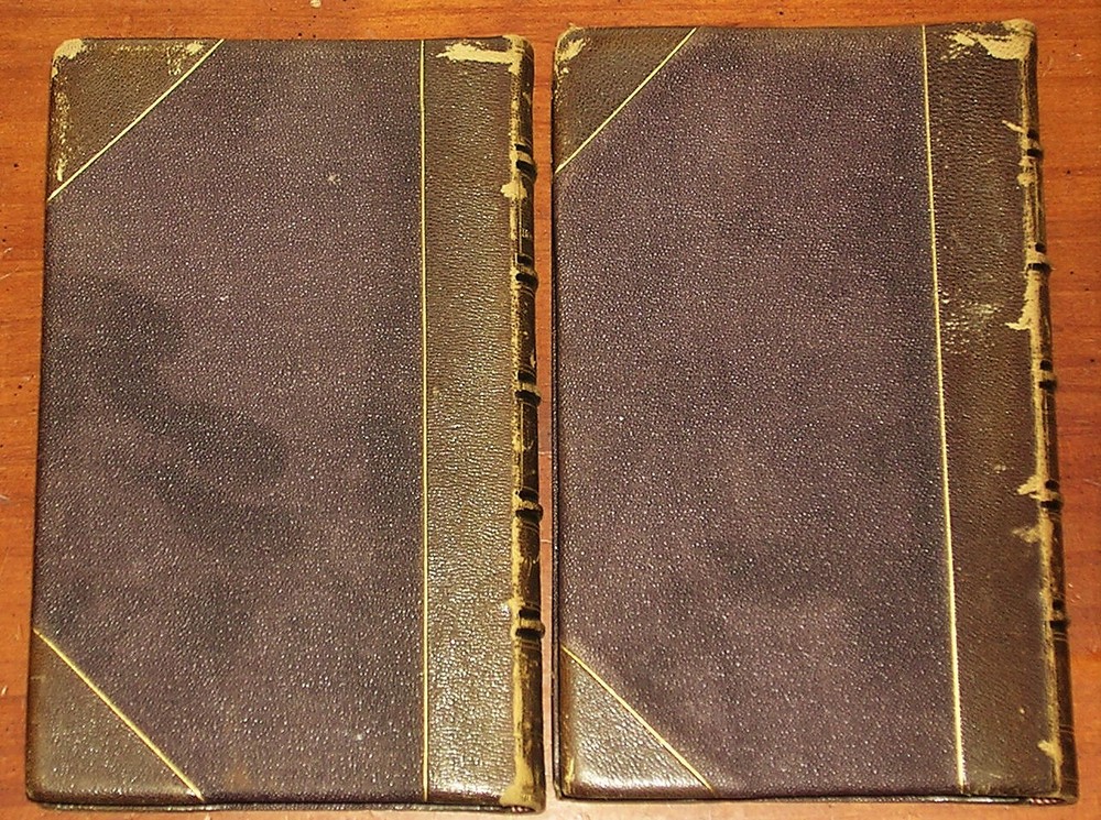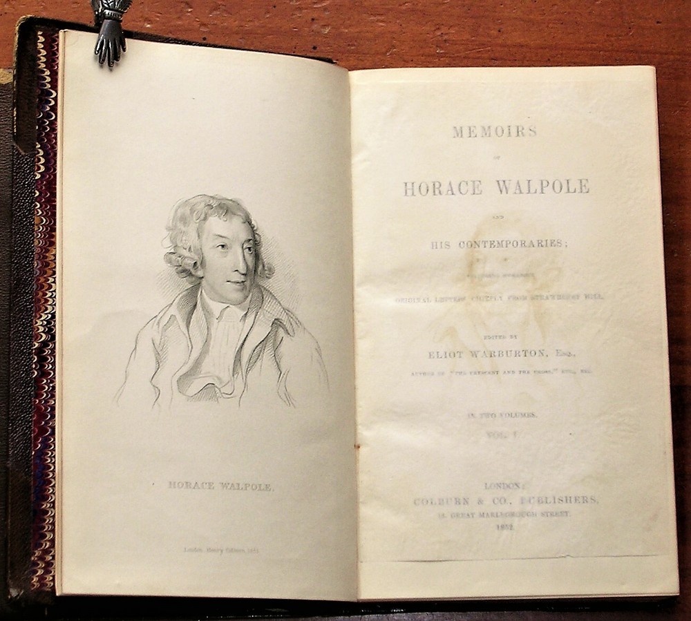 Memoirs of Horace Walpole and His Contemporaries, Including Numerous Original Letters, Chiefly from Strawberry Hill , edited by Eliot Warburton. Volumes I & II (complete), published respectively in 1852 and 1851 by Henry Colburn, London. Hardcovers in 3/4 leather binding over sturdy buckram, with marbled endpapers, top edge gilt, banded spines, gilt spine titles, top edges gilt. Tissue guarded frontispieces in both. Good to very good condition. The leather is rubbed and scuffed in places, but there's very little, if any, shedding and the leather was treated with a preservative oil. Patchy darkening of the boards. Small bookstore stickers on the back flyleaves, otherwise unmarked, tightly bound. FREE shipping in the continental USA. Thanks for looking! Loc: 1st floor sets.