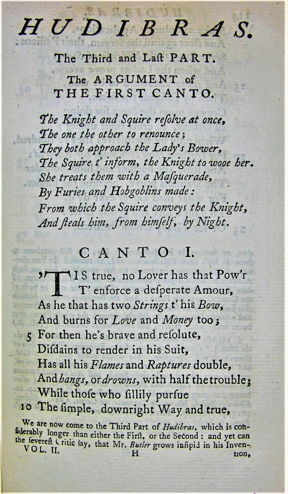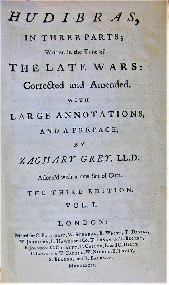Samuel Butler (baptized 14 February 1613 – 25 September 1680) was a poet and satirist. He is remembered now chiefly for a long satirical poem titled Hudibras , directed against religious sectarianism. The poem was very popular in its time, and several of its phrases have passed into the dictionary. It was sufficiently popular to spawn imitators. Hudibras takes some of its characterization from Don Quixote but, unlike that work, it has many more references to personalities and events of the day. Butler was also influenced by satirists such as John Skelton and Paul Scarron's Virgile Travesti; a satire on classical literature, particularly Virgil . Hudibras was reprinted many times in the centuries following Butler's death. Hudibras is a mock-heroic narrative poem upon the Roundheads, Puritans, Presbyterians and many of the other factions involved in the English Civil War. According to the title page, the work was begun during the war and published in three parts in 1663, 1664 and 1678, with the first edition encompassing all three parts appearing in 1684. Published only four years after the restoration of Charles II, and Cromwell's Protectorate completely over, the poem found an appreciative audience. As Butler was fiercely royalist, his satire is not balanced and only the parliamentarian side are singled out for ridicule. It is also used as a vehicle for parodying some of the dreadful poetry of the time. The work is clearly influenced by Cervantes' Don Quixote, but whereas Cervantes' noble knight, although being mocked, is supposed to draw readers' sympathies, Butler's Sir Hudibras is offered nothing but derision. Hudibras has been reprinted many times in the centuries following Butler's death but most of his other writings never saw print until they were collected posthumously by the writer and literary editor Robert Thyer in 1759