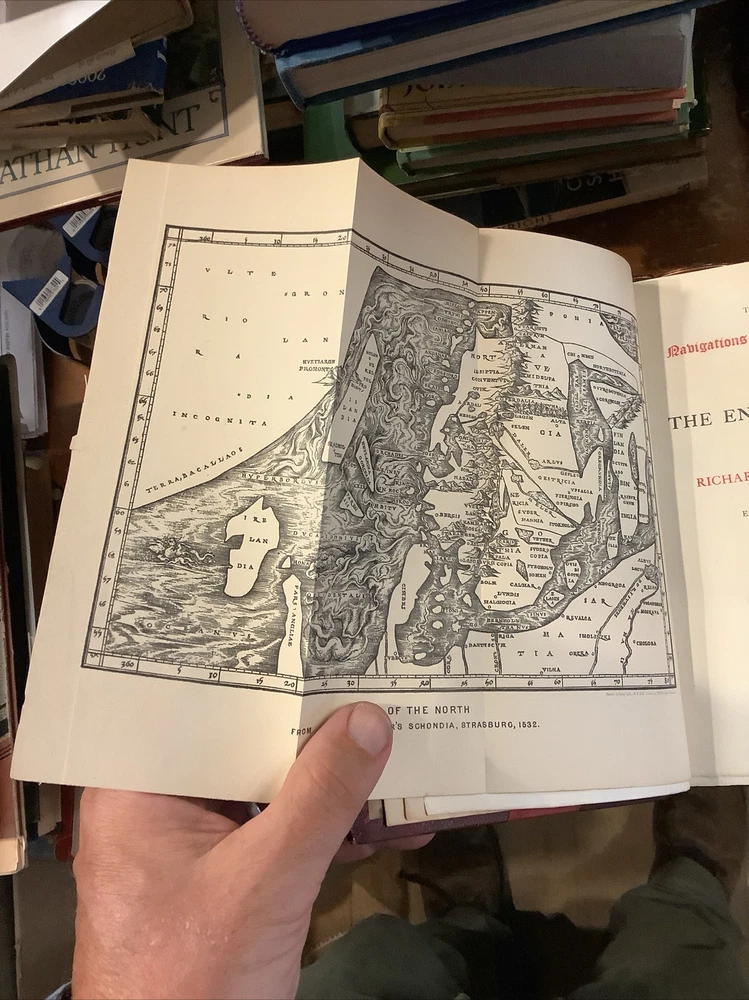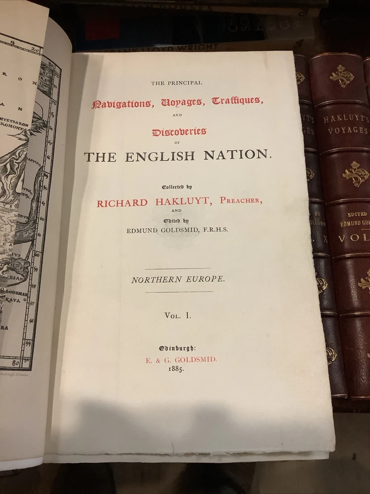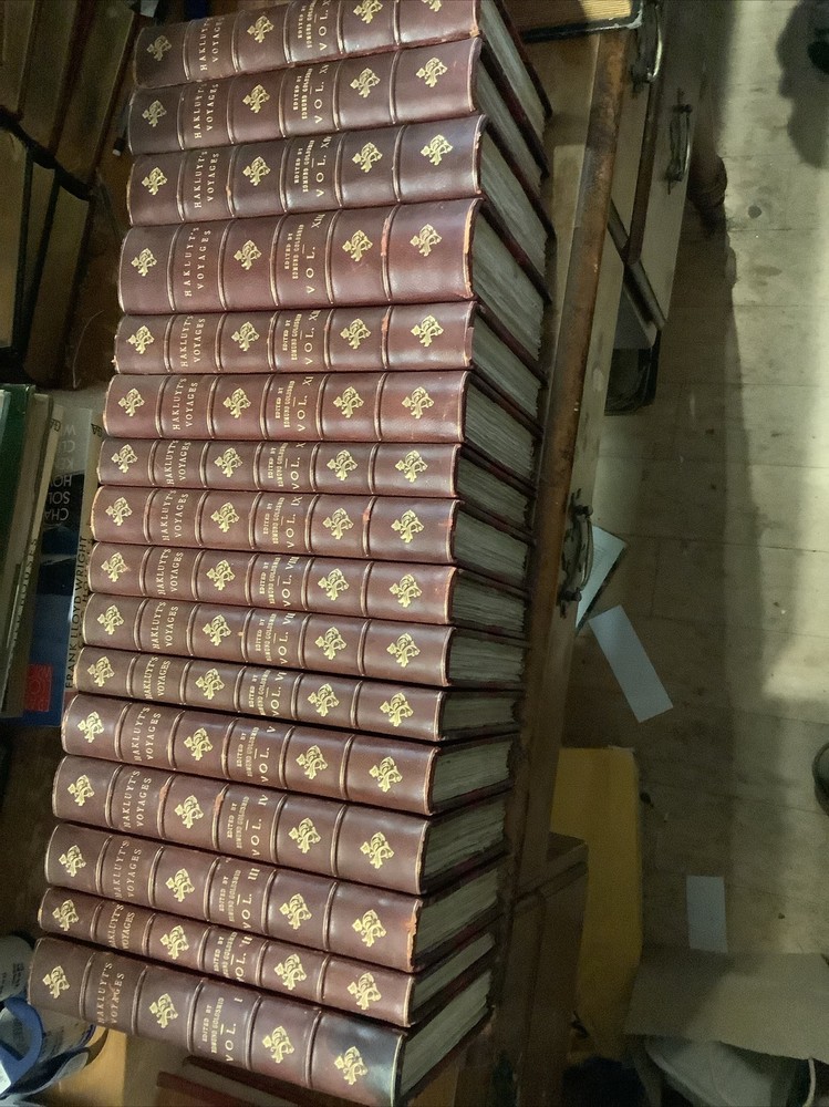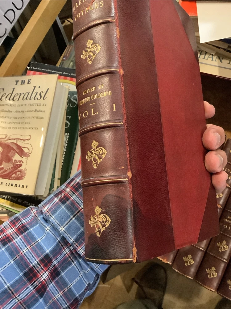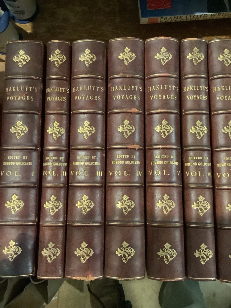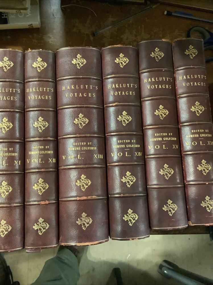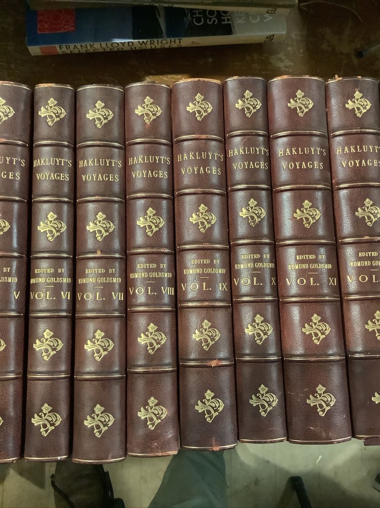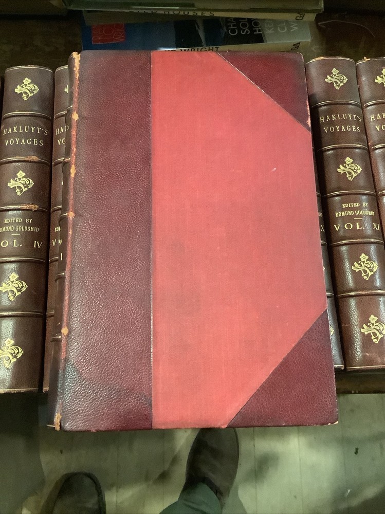 Hakluyt's Voyages. 16 volume set. Three-quarter leather binding. Binder's stamp BAYTUN on the back of the front free endpapers.Some rubbing to binding edges and along spines. Bindings sound. Bookplate with 'Withdrawn,' stamp on it affixed to front endpaper of volume 1. Withdrawn from the Salem Athenaeum a private library in Salem, Massachusetts. Bookplate of previous owner on the back of the front free endpaper of each volume. Published by E. And G. Goldsmid in Edinburgh, 1884-1890. Stain to the bottom of the spine of volume 1. The Principal Navigations, Voyages, Traffiques, and Discoveries of the English Nation.