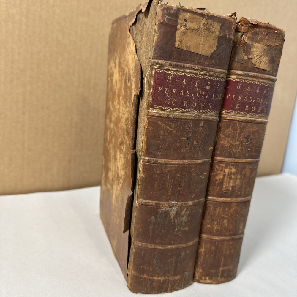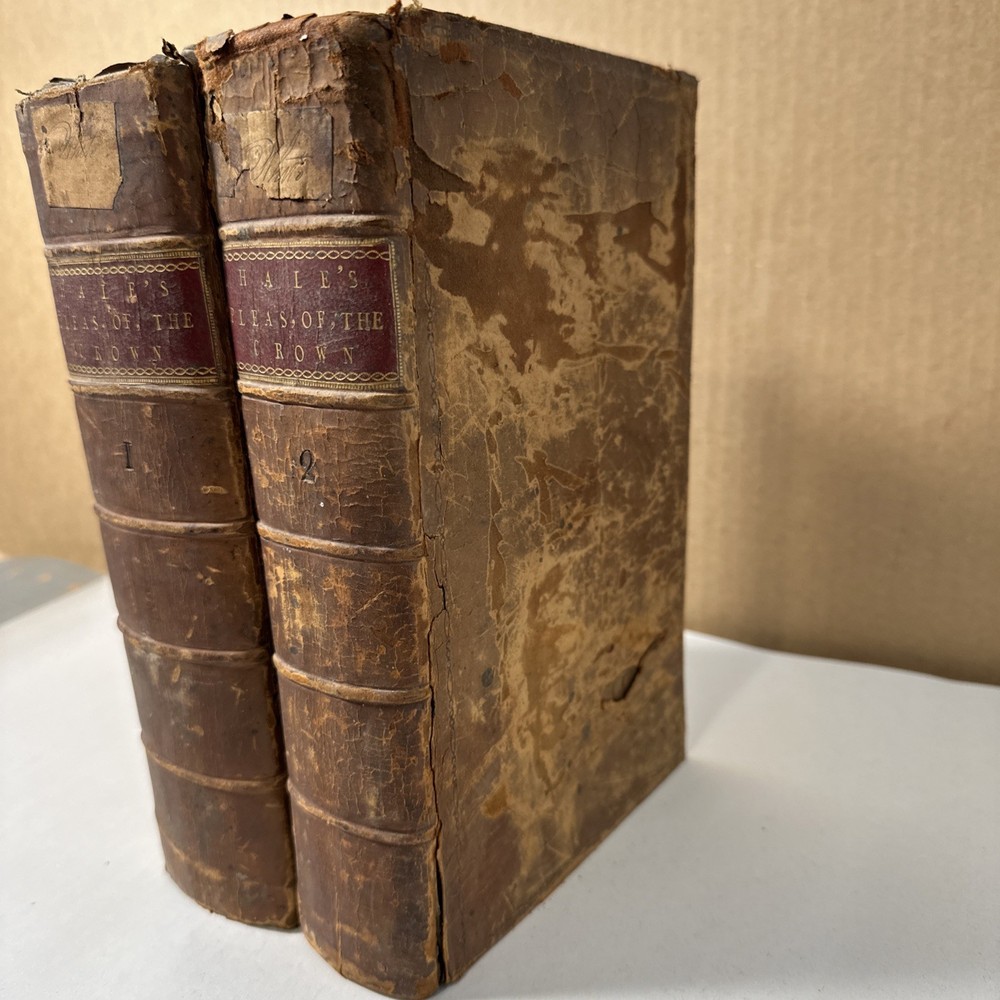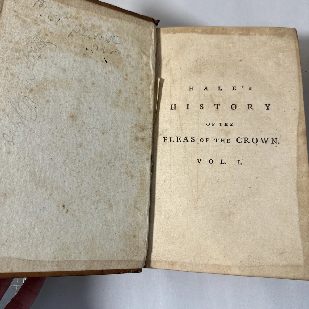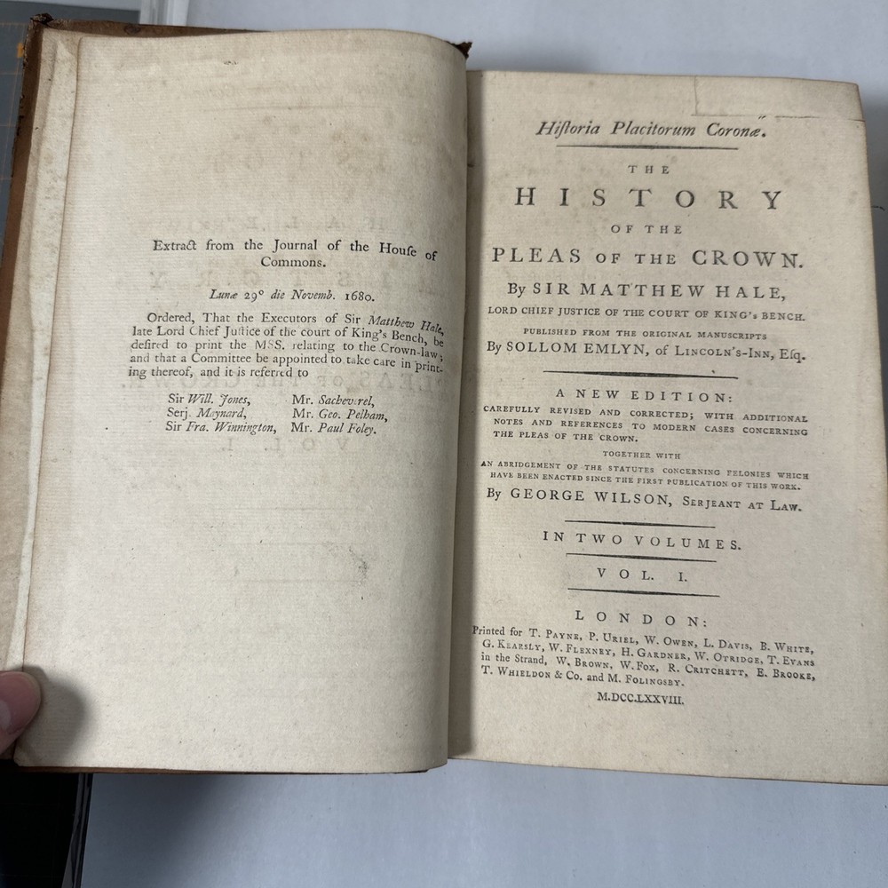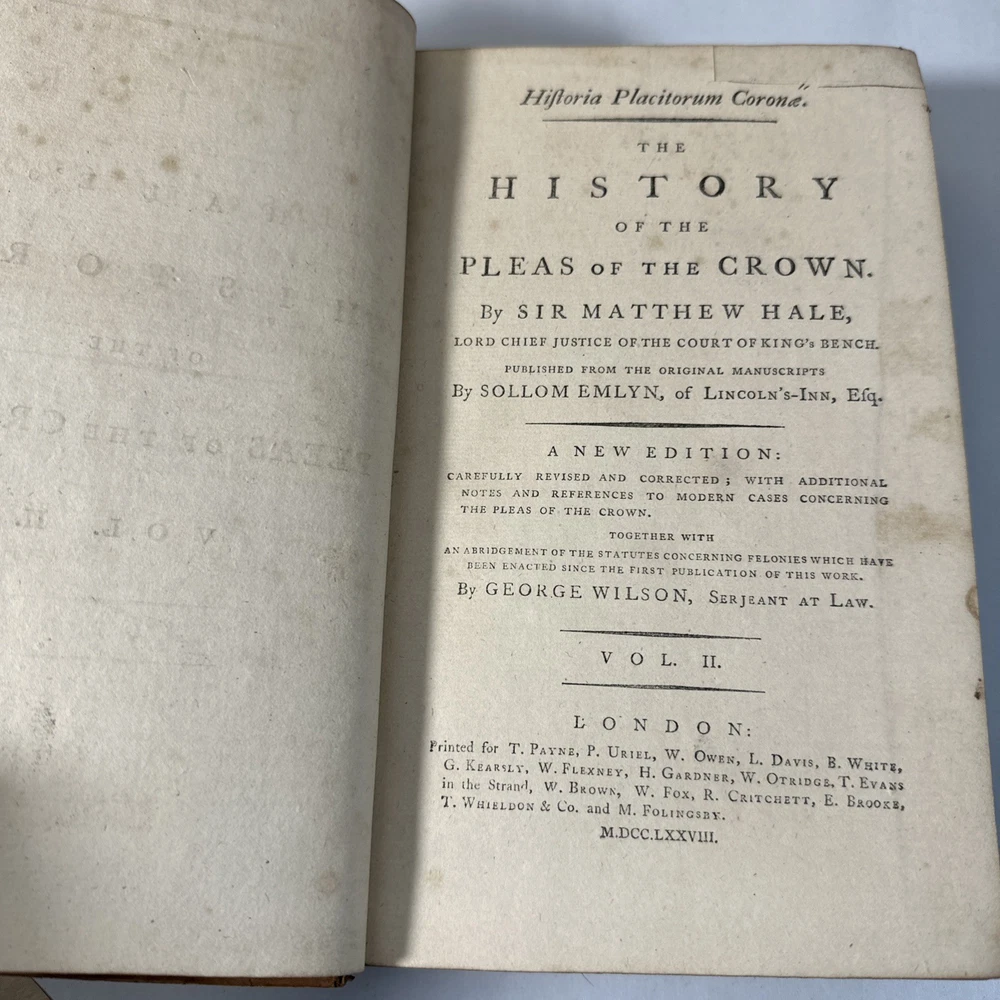 Scarce 2 Volume Set New Edition printed in 1778 in London Comparable Set on Abebooks listed at $1,200! Historia Placitorum Coronæ or The History of the Pleas of the Crown is an influential treatise on the criminal law of England, written by Sir Matthew Hale and published posthumously with notes by Sollom Emlyn Title: Historia Placitorum Coronae. The History of the Pleas of the Crown by Sir Matthew Hale A New Edition Complete in Two Volumes Authors: Matthew Hale; Sollom Emlyn; George Wilson Published by T. Payne et al, London, 1778 Volume 1 [10],xix,[i],[10],729; Volume 2 [8],414,[2], Index [181] pp
