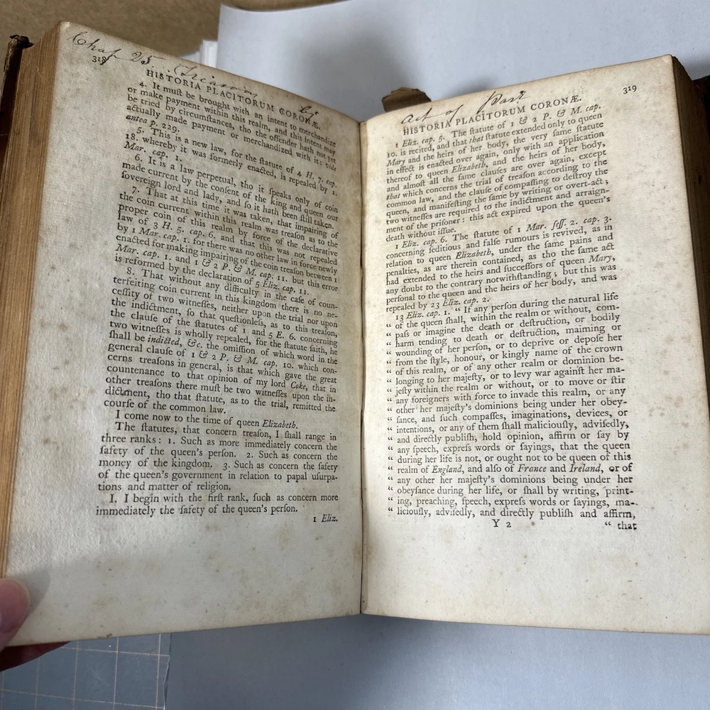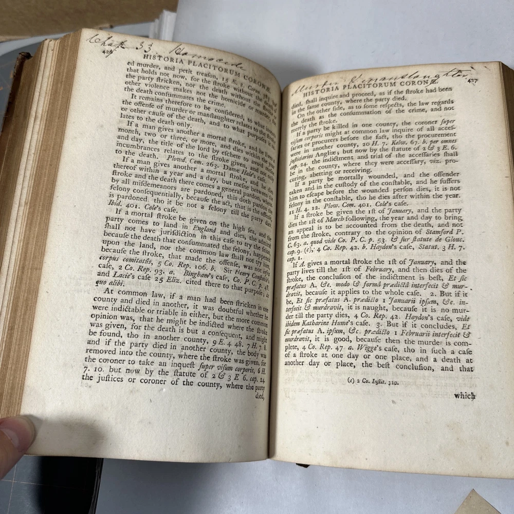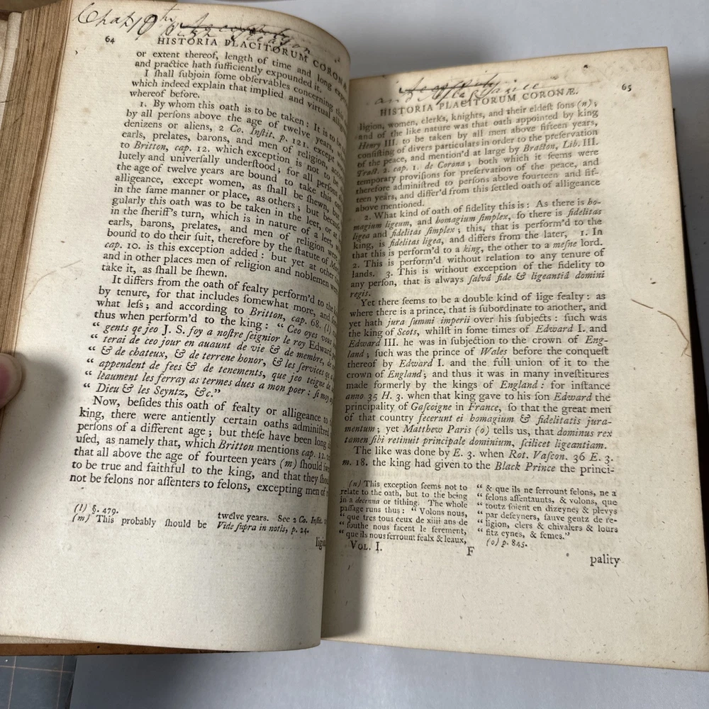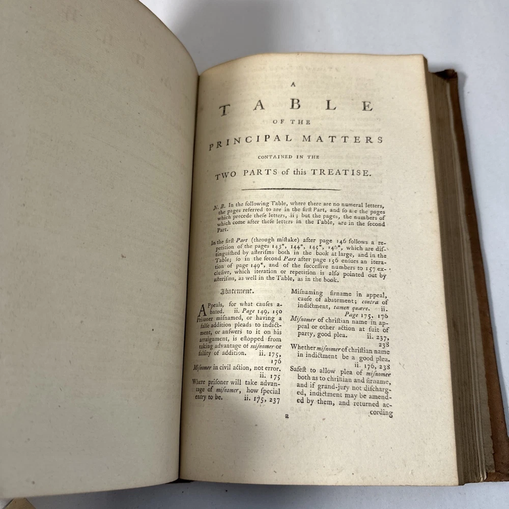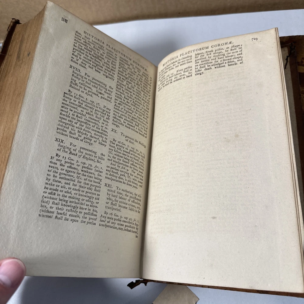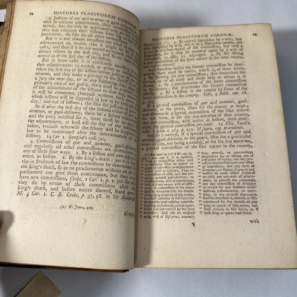Scarce 2 Volume Set New Edition printed in 1778 in London Comparable Set on Abebooks listed at $1,200! Historia Placitorum Coronæ or The History of the Pleas of the Crown is an influential treatise on the criminal law of England, written by Sir Matthew Hale and published posthumously with notes by Sollom Emlyn Title: Historia Placitorum Coronae. The History of the Pleas of the Crown by Sir Matthew Hale A New Edition Complete in Two Volumes Authors: Matthew Hale; Sollom Emlyn; George Wilson Published by T. Payne et al, London, 1778 Volume 1 [10],xix,[i],[10],729; Volume 2 [8],414,[2], Index [181] pp
