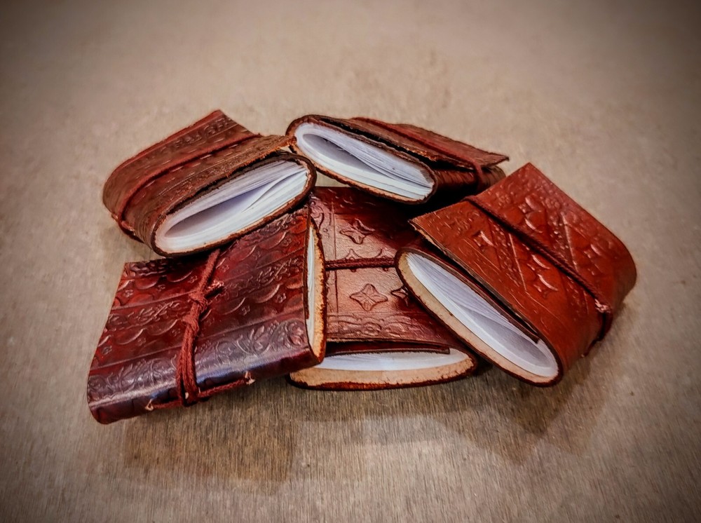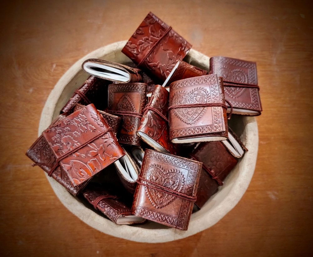 Handmade Mini Leather Journals - Perfect for Pocket Use These beautifully crafted mini journals are the ideal companion for your daily notes, sketches, or thoughts. Each journal features a durable leather outer cover and eco-friendly, recycled cotton pages inside, making them both stylish and sustainable. At 3 by 3 inches, they easily fit in your pocket, ensuring you can carry them wherever you go. Available in assorted patterns including tree, heart, stars, and more, these journals come in packs of 3, 5, 10, 20, and 50. Whether for personal use or as unique gifts, these mini leather journals are perfect for anyone who loves writing or journaling on the go. Ideal for Gifting Handmade and eco-friendly, these mini journals make thoughtful gifts for any occasion. Their charming size, premium materials, and beautiful patterns make them ideal for birthdays, holidays, or even as a special treat for yourself. Perfect for both men and women, these journals appeal to anyone who values craftsmanship and sustainability. Premium Leather Cover The outer cover of each journal is made from high-quality leather, giving it a timeless, classic look and feel. Leather not only adds durability to the journal but also gives it a rich texture that ages beautifully over time. The more you use these journals, the better they look, making them not just a tool for writing but also a stylish accessory. The leather cover protects the pages inside, ensuring your notes stay intact and secure.