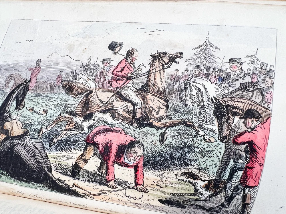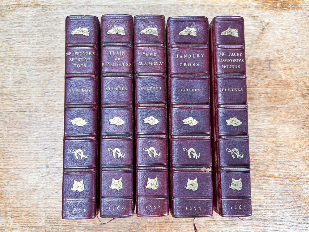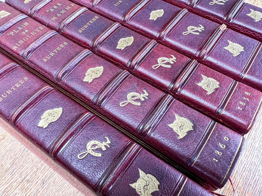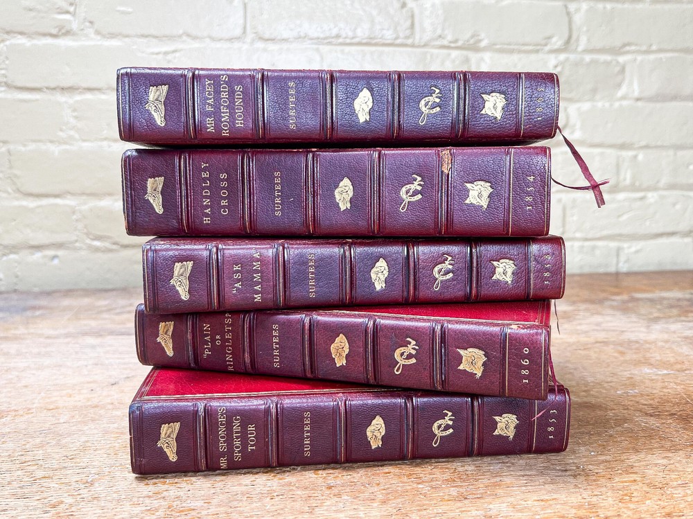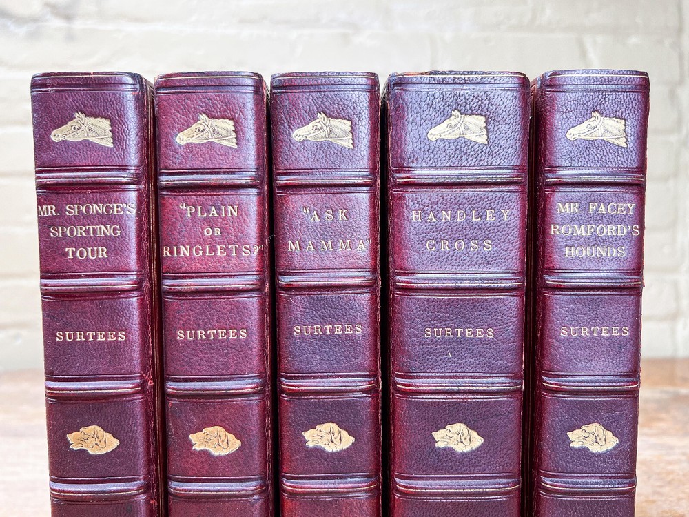 This charming five-volume set by Robert Smith Surtees, published in the mid to late 1800s, is a true treasure for collectors and literary enthusiasts. Bound in rich red leather with intricately detailed gilt spines, these volumes radiate Victorian refinement and timeless sophistication. Illustrated by the renowned John Leech, each book features vibrant hand-colored plates that bring to life the spirit of English country pursuits—from exhilarating equestrian adventures to lively hunting scenes and the social intricacies of the sporting gentry. The combination of Surtees’ sharp wit and Leech’s masterful illustrations makes this set not only a literary classic but also a visual delight. A remarkable addition to any fine library, equestrian collection, or antique book display, this set captures the essence of 19th-century sporting life with enduring charm and historical significance. The set includes: Mr. Facey Romford’s Hounds (1865) Ask Mamma (1858) Handley Cross (1854) Plain or Ringlets (1860) Mr. Sponge’s Sporting Tour (1853) Each volume, measuring 9 inches high, 5.5 inches wide, and between 1.25 to 2 inches deep, is a substantial and beautifully crafted piece of literary history. The leather-bound spines add a stately presence, making this set a striking addition to any antique book collection or classic country house decor. Good condition with tight bindings, light age-related wear, some wear to corners from handling, clean interior pages. Please review the photos for further assessment. Whether for the avid reader, equestrian enthusiast, or collector of fine antiquarian books, this set embodies the grandeur and wit of 19th-century sporting literature. A remarkable find that bridges the worlds of literature, art, and history. Check out our other antique listings.