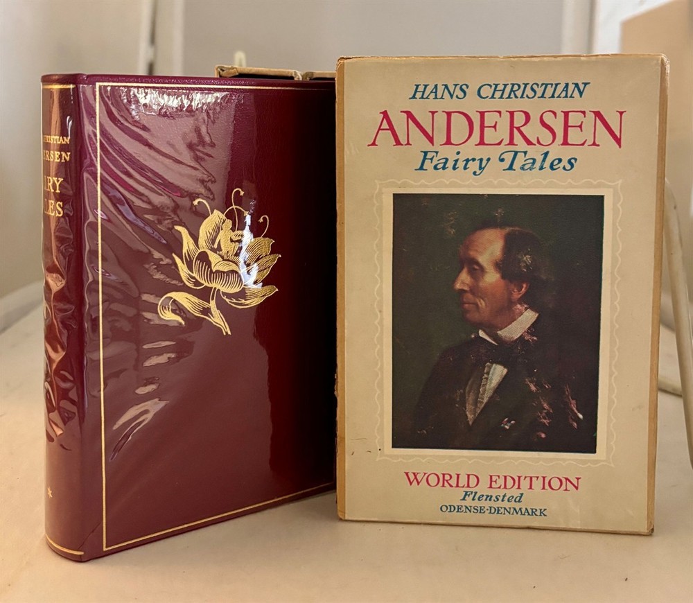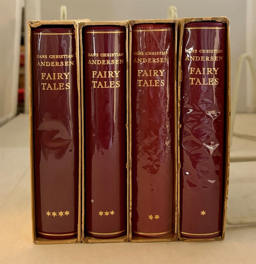(Young Adult) Andersen, Hans Christian, R. P. Keigwin (translated by) , Svend Larsen (editor): Hans Christian Andersen Fairy Tales: World Edition: Leather. Flensted, Odense, Denmark. 1955. B&W Illustrations: Very Good+ Four Volume set. Two of the volumes are First English Editions, one volume is dated 1955 and has no other date. This set is in Very Good+ condition and have Very Good+ plastic dust jackets, and Very Good- slipcases. The books are in mostly clean, bright condition. The text pages are clean and bright. The plastic dust jackets are mostly clean, bright. The dust jacket on volume two is somewhat loose and has a bit of rippling, along with a one inch+ tear to the front bottom flap edge. The slipcases have some bumping and wear to the corners, and three of the slipcases have tears of varying lengths at the edges. 2 132 #50567 $95