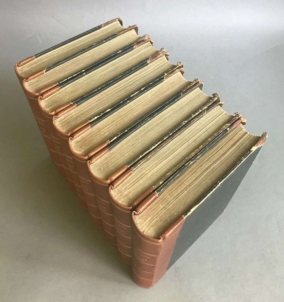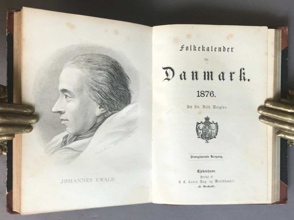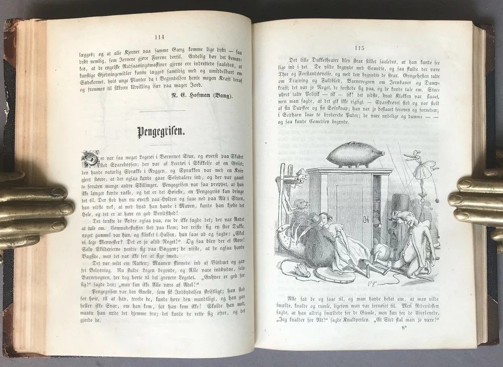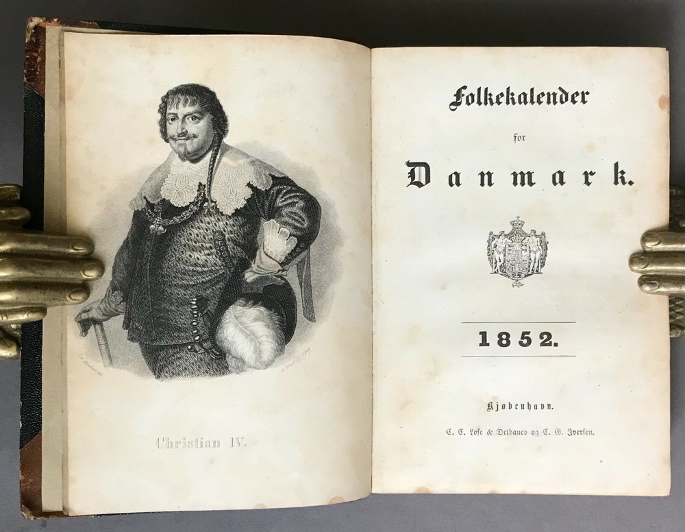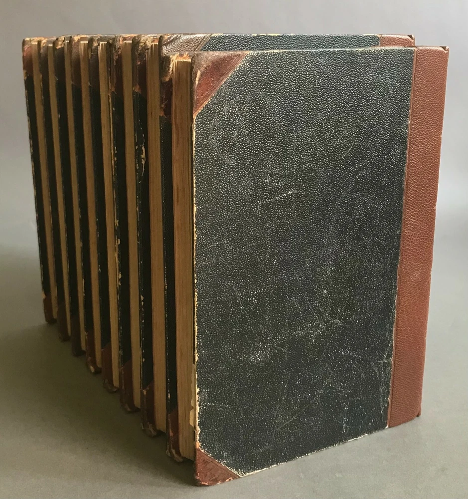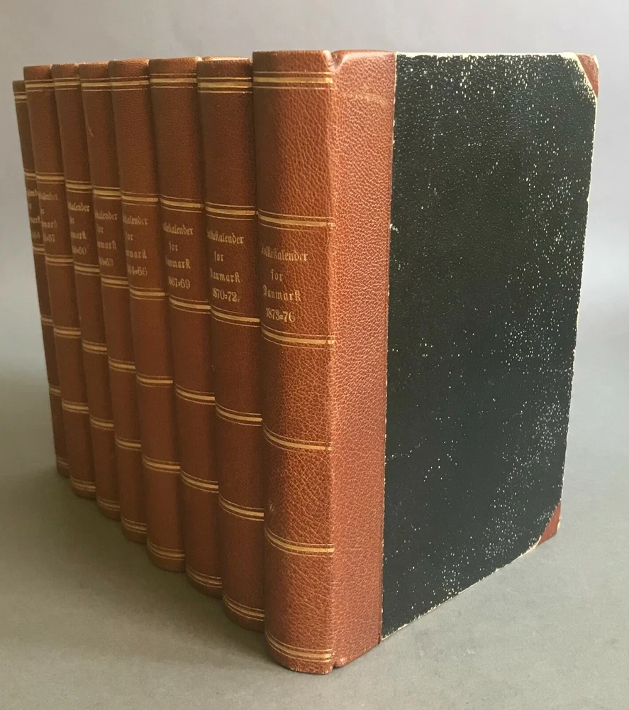[Hans Christian Andersen] Folkekalender for Danmark (8 Volume Set) 1852-1876 [Hans Christian Andersen]. Bergsøe , editor. Folkekalender for Danmark. Copenhagen: C. C. Lose & Delbanco, 1852-1876. First editions. , including twenty-eight first edition works by Hans Christian Andersen. Eight twelvemo volumes (1852-54; 1855-57; 1858-60; 1861-63; 1864-66; 1867-69; 1870-72; 1873-76). Profusely illustrated with numerous woodcuts and engravings. Uniformly bound in brown half morocco over black morocco covered boards, stamped in gilt to spines. Text in Danish. Includes twenty-eight first edition works by Hans Christian Andersen. Extremities gently rubbed, bumped, and edgeworn; hinges reinforced; light scattered foxing throughout; some with ink ownership signatures. Very good overall. LWC-00032A Please visit our eBay store for more great vintage and collectible children’s books! https://www.ebay.com/str/inkqnabula/Childrens/_i.html?_storecat=29938887014