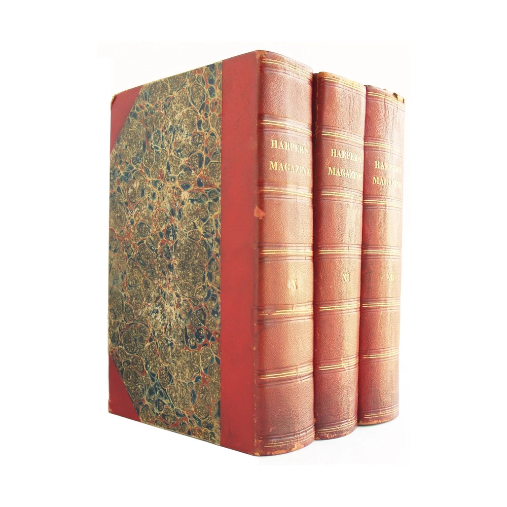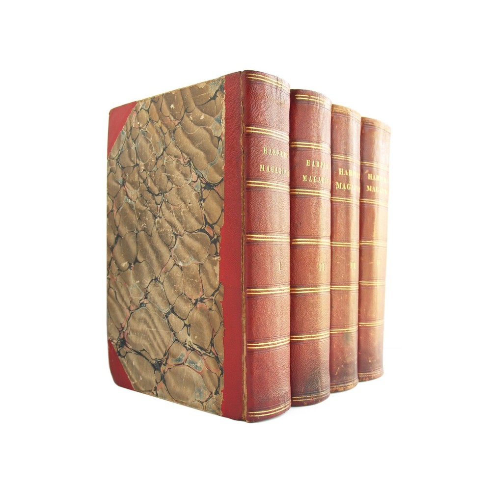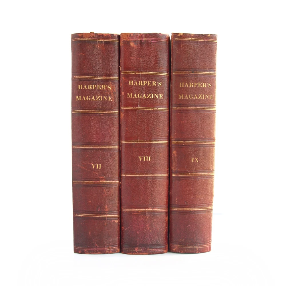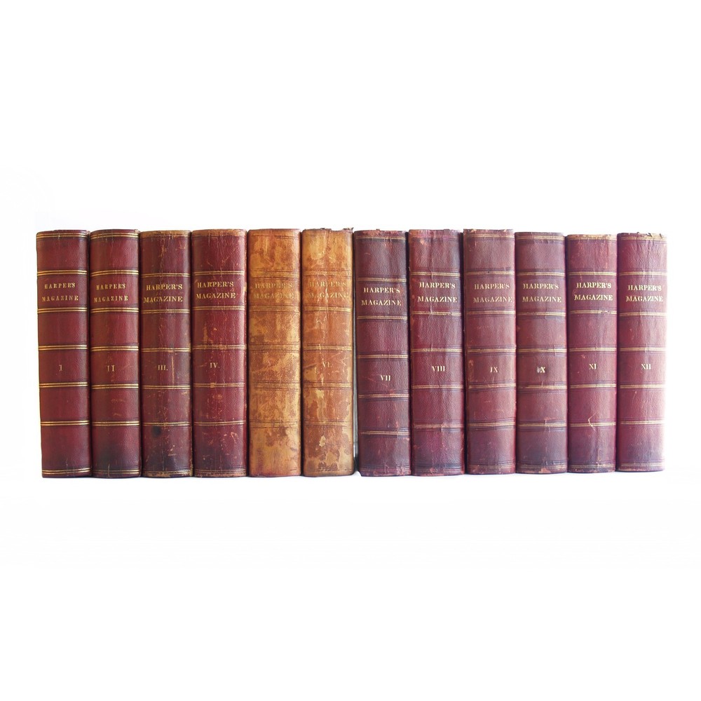 This set of the first 12 volumes of the influential Harper's New Monthly Magazine is bound in 3/4 crimson leather, with marbled boards and gilt spine lettering. Vol. 1 is dated 1850; vol. 12 goes through May 1856. Varying wear to these books; most show edgewear, fading of spines or rubbing, some scattered foxing; set is good overall. Volumes V and VI show heaviest fading of leather spines, all others appear deep red, these have gone to lighter brown. Significant literary contributions to these volumes includes the serialization of works by Dickens, such as "Little Dorritt" and "Bleak House," and the first appearance in print of what would become Herman Melville's epic "Moby Dick," here titled "The Town-Ho's Story" in Vol. III. This is the only portion of the story to be published prior to the book issue and the first portion to be published anywhere. Other contents include illustrations on fashion, essays on health and sanitation, travel diaries, political notes and much, much more. Each volume is approx. 800 pages, 7"x9". HARPER'S NEW MONTHLY MAGAZINE, VOLS. 1-12 1850 - May 1856 Harper & Brothers