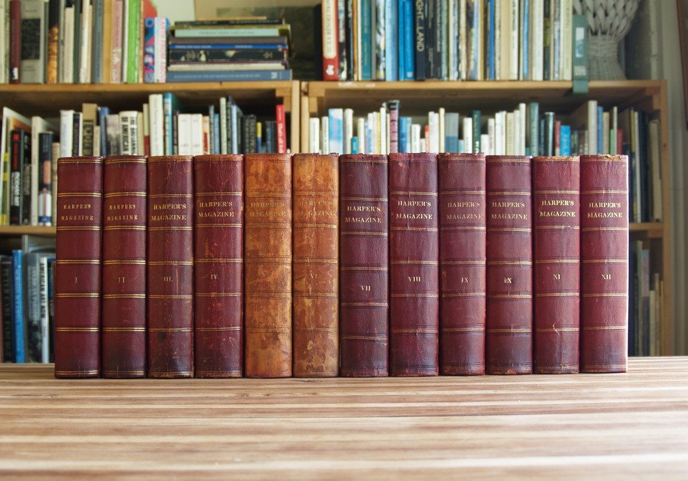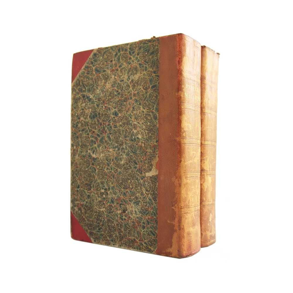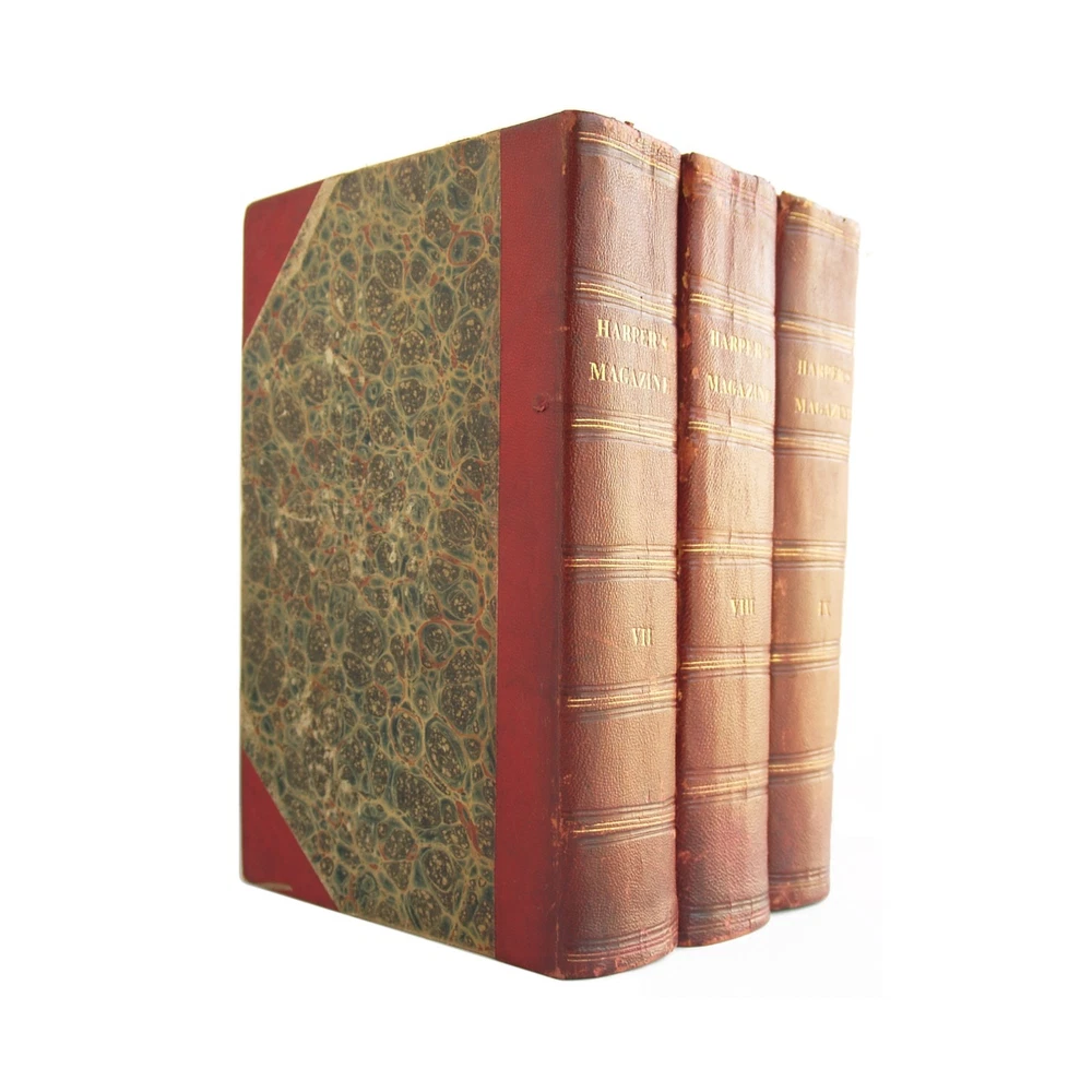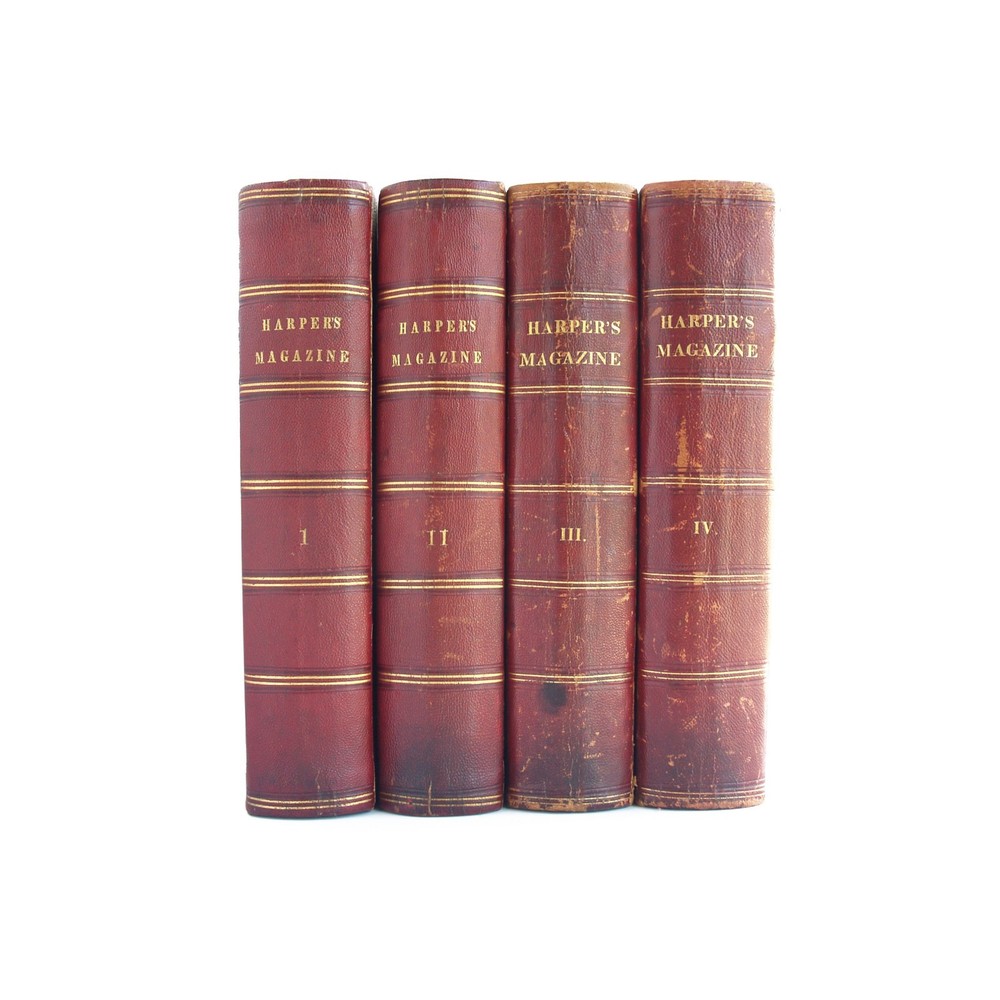 This set of the first 12 volumes of the influential Harper's New Monthly Magazine is bound in 3/4 crimson leather, with marbled boards and gilt spine lettering. Vol. 1 is dated 1850; vol. 12 goes through May 1856. Varying wear to these books; most show edgewear, fading of spines or rubbing, some scattered foxing; set is good overall. Volumes V and VI show heaviest fading of leather spines, all others appear deep red, these have gone to lighter brown. Significant literary contributions to these volumes includes the serialization of works by Dickens, such as "Little Dorritt" and "Bleak House," and the first appearance in print of what would become Herman Melville's epic "Moby Dick," here titled "The Town-Ho's Story" in Vol. III. This is the only portion of the story to be published prior to the book issue and the first portion to be published anywhere. Other contents include illustrations on fashion, essays on health and sanitation, travel diaries, political notes and much, much more. Each volume is approx. 800 pages, 7"x9". HARPER'S NEW MONTHLY MAGAZINE, VOLS. 1-12 1850 - May 1856 Harper & Brothers