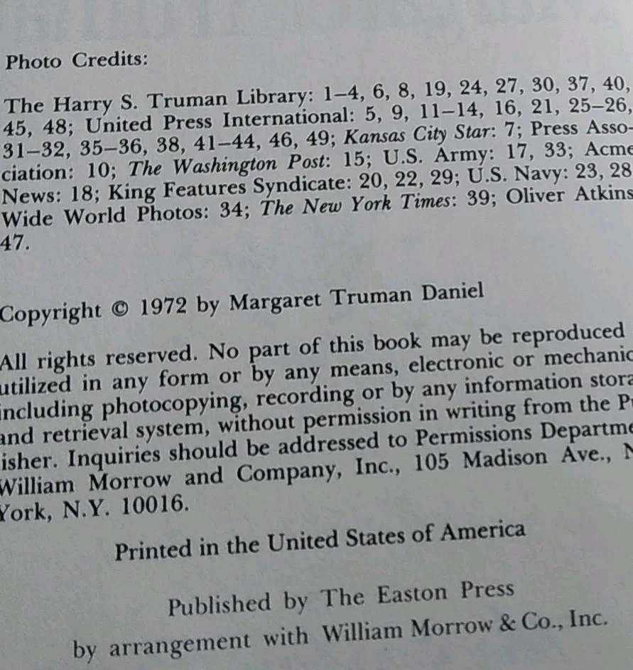 The Harry Truman Library of the Presidents Margaret Truman Leather Gilt Easton Press is a limited edition collector's item featuring a biography of President Harry Truman written by his daughter, Margaret Truman. Published by Easton Press in 1972, this special edition book is bound in leather with gilt lettering, adding to its uniqueness and value as a collectible item for any history or political enthusiast. The book provides a personal and insightful look at one of America's most influential presidents, making it a prized addition to any library or collection. Like new . 602 pages.