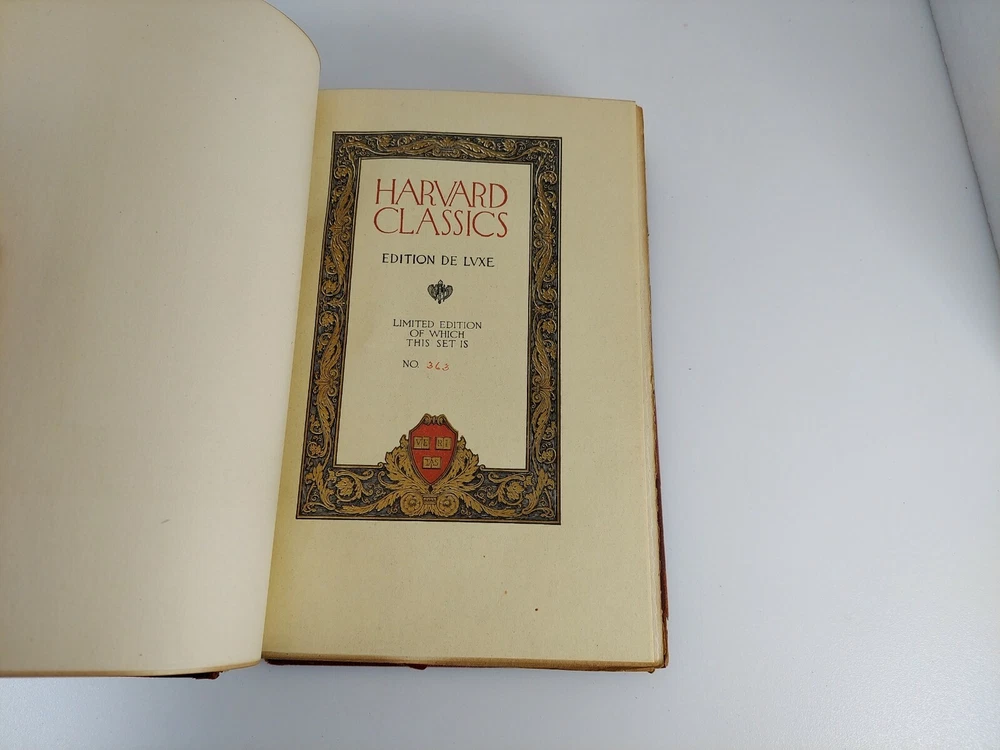 Harvard Classics 5 Essays and English Traits Library Ed 1909 PF Collier Set #363. Condition is Acceptable with cover wear, flaking of leather and light tanning of pages as shown. Shipped with USPS Med...