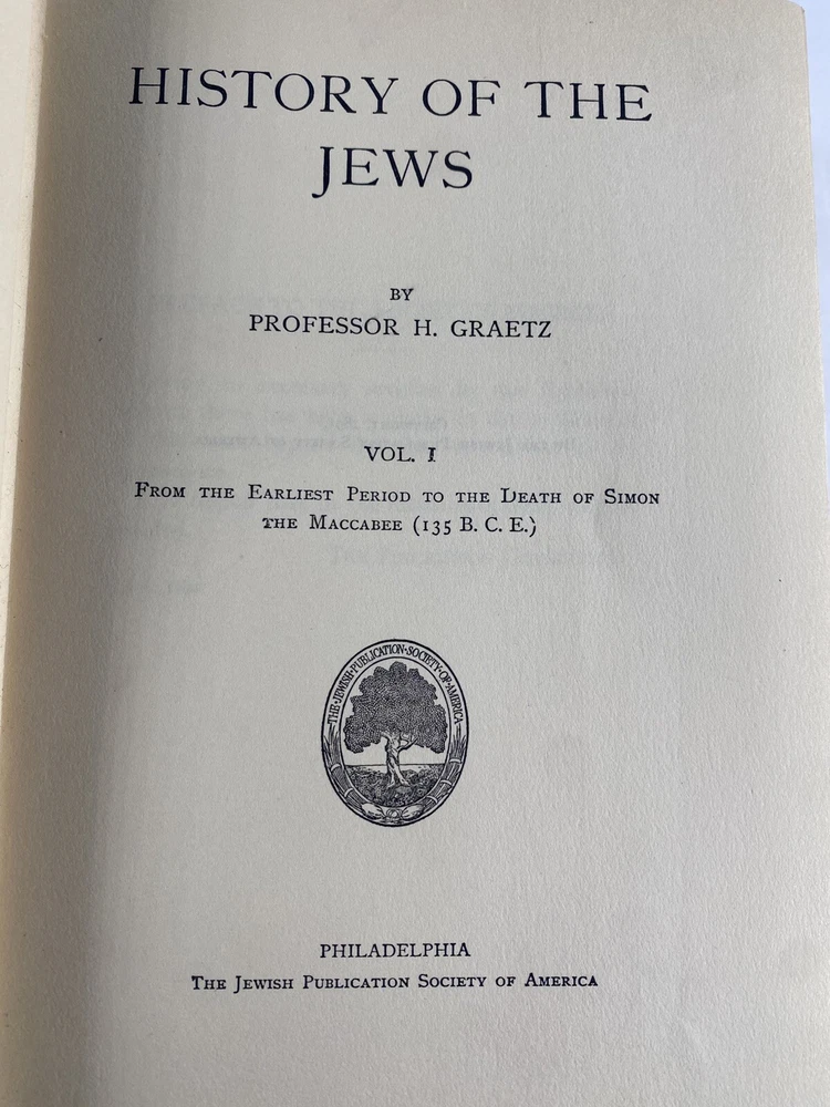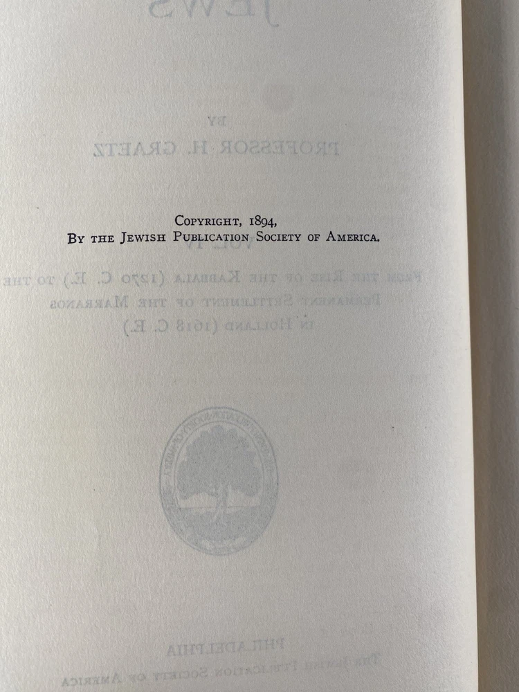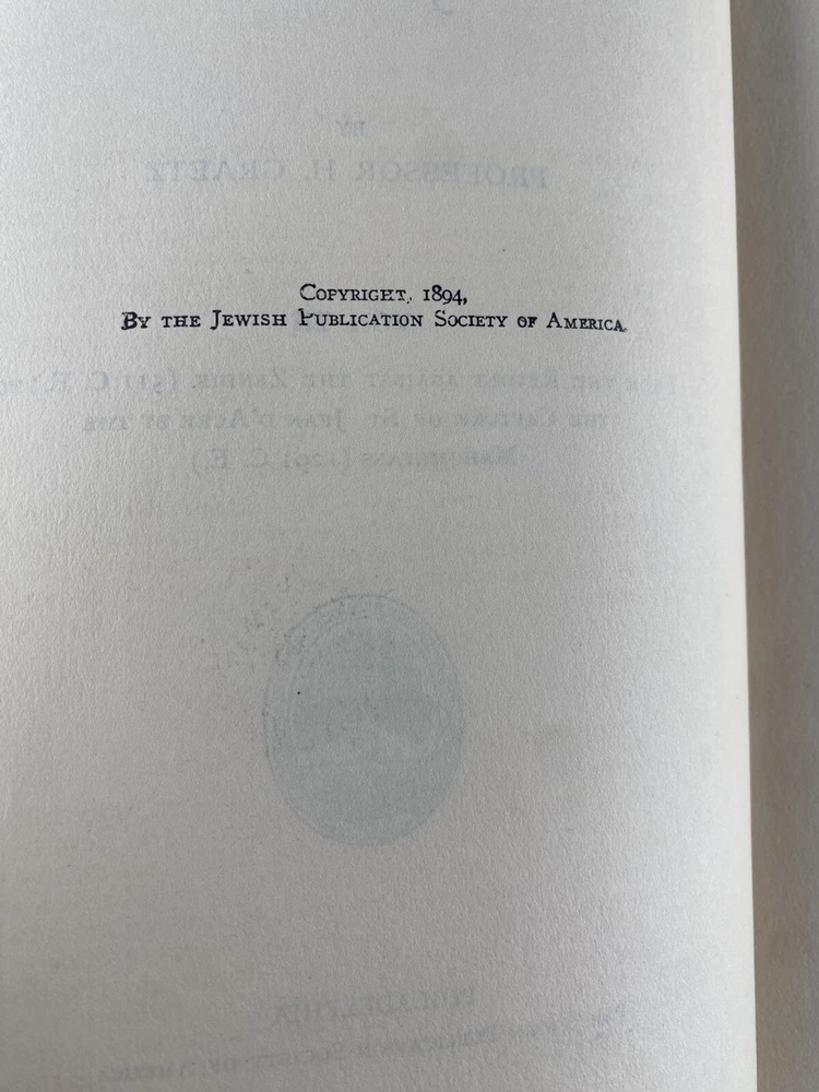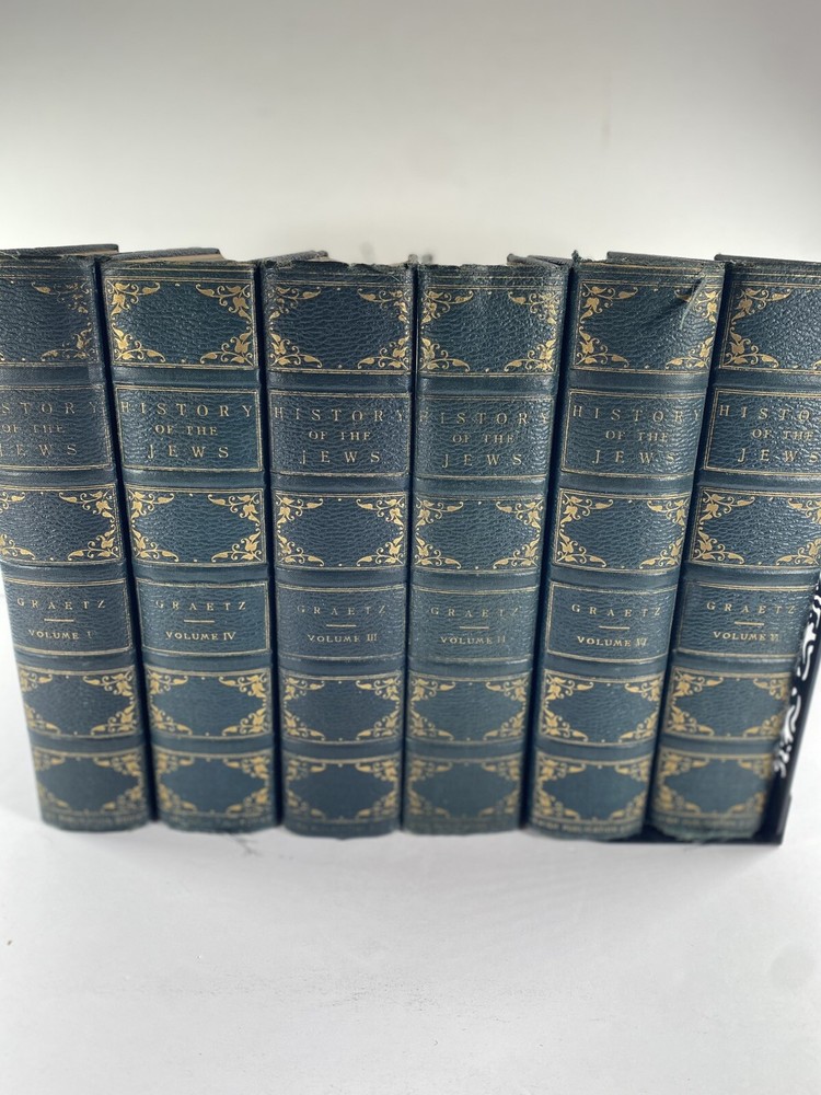 This is a complete set of 6 volumes of Heinrich Graetz's "History of the Jews" in its first American edition, published by the Jewish Publication Society between 1891 and 1898. The books are bound in leather and were originally printed in Philadelphia, United States. The language of the text is English and the books are in their original state, not facsimiles. The set provides a comprehensive history of Judaism and is a valuable collection for anyone interested in the subject. The author, Heinrich Graetz, is well-known for his works on Jewish history and this set is a testament to his legacy. The special attribute of this set is its first edition status and it would make a great addition to any collection.
