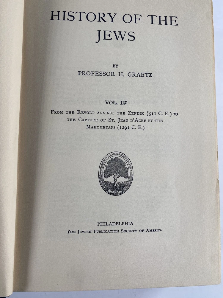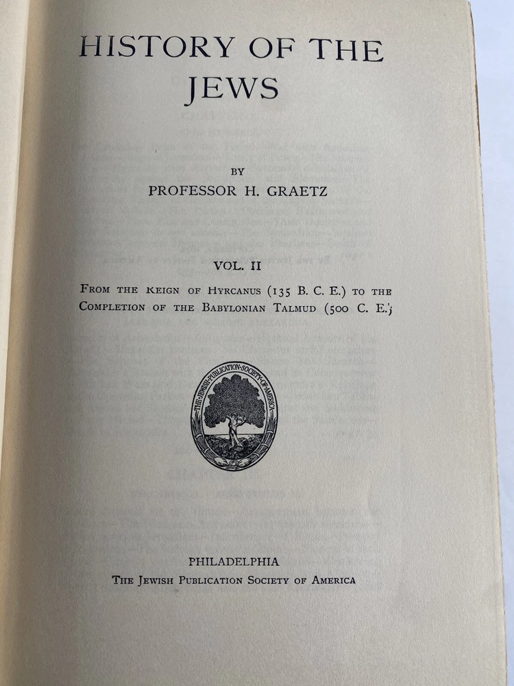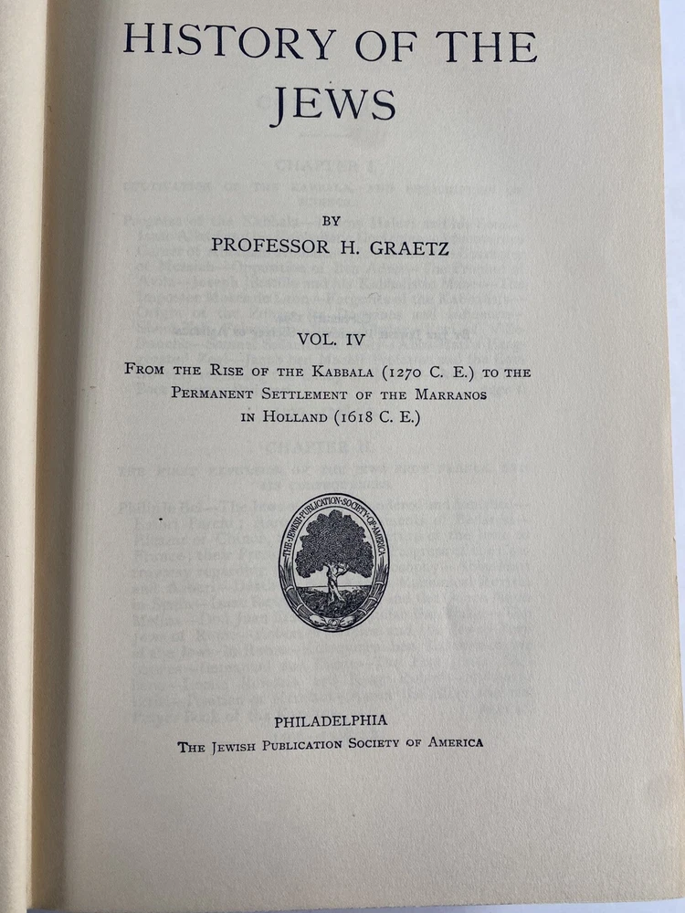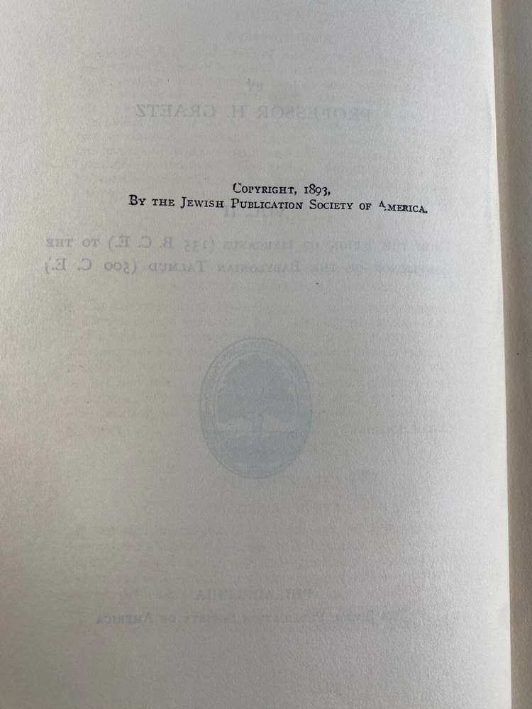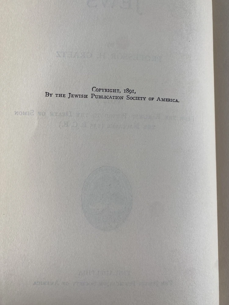 This is a complete set of 6 volumes of Heinrich Graetz's "History of the Jews" in its first American edition, published by the Jewish Publication Society between 1891 and 1898. The books are bound in leather and were originally printed in Philadelphia, United States. The language of the text is English and the books are in their original state, not facsimiles. The set provides a comprehensive history of Judaism and is a valuable collection for anyone interested in the subject. The author, Heinrich Graetz, is well-known for his works on Jewish history and this set is a testament to his legacy. The special attribute of this set is its first edition status and it would make a great addition to any collection.