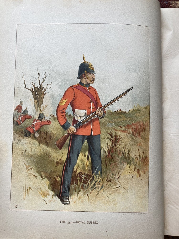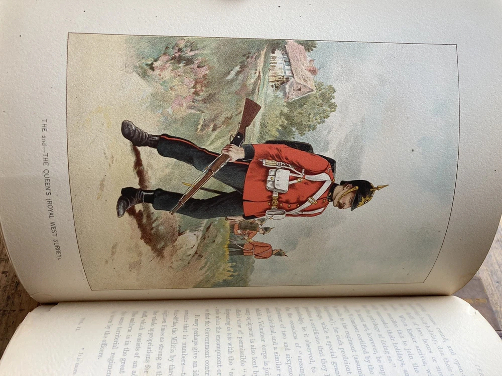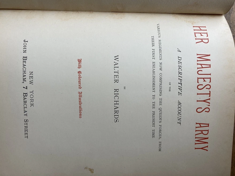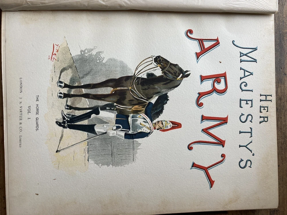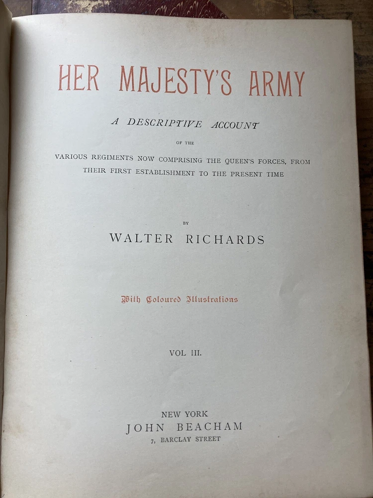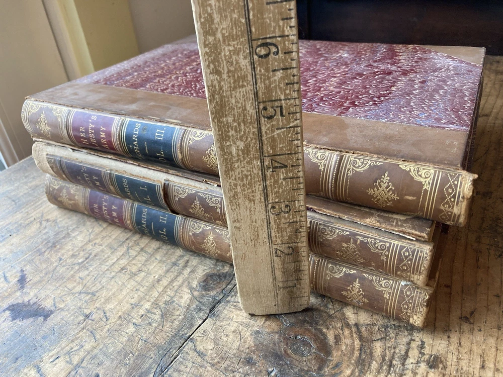 For sale is rare complete 3 Volume set of Her Majesty's Army. Antique Books with Color Prints. Pages are all Intact, but two of the front Covers are Separated! This is shown in one of the photos. Nice Marbled paper. Descriptive Account of The queens armed forces. Nice large 9" x 11" size.