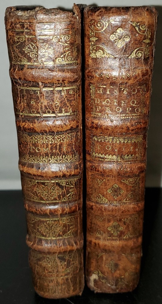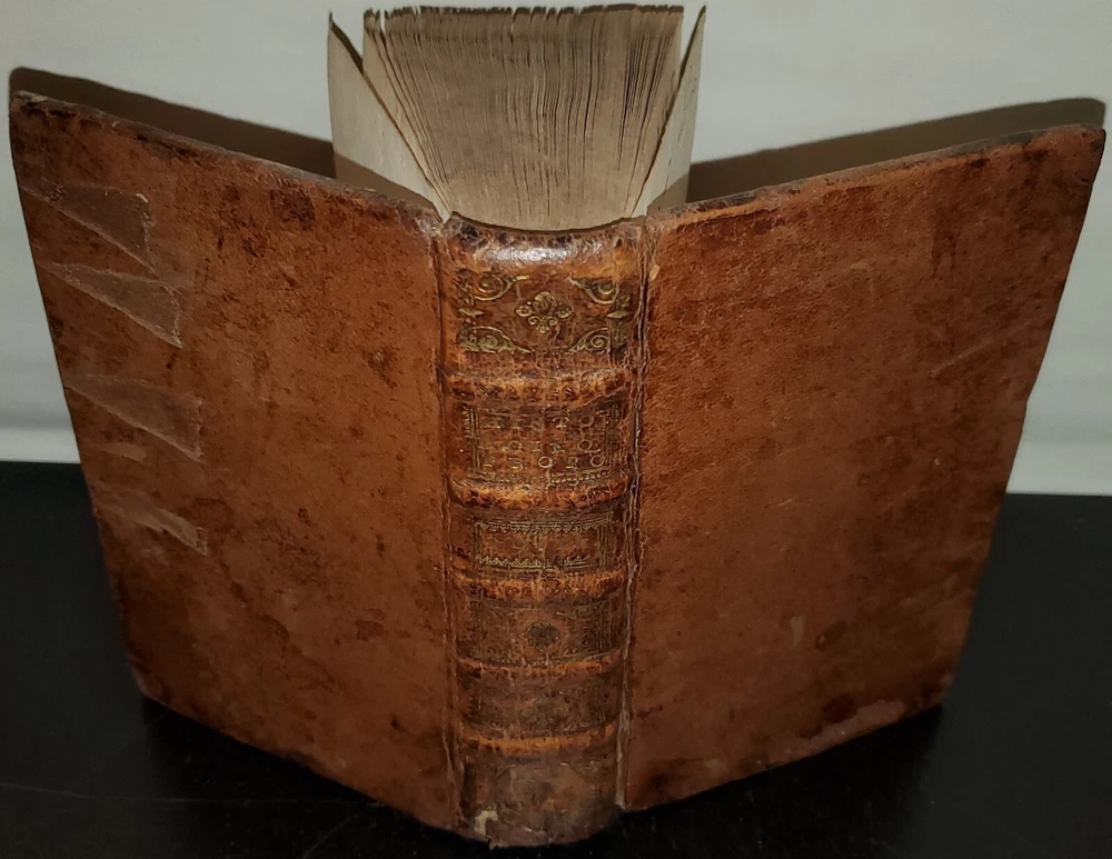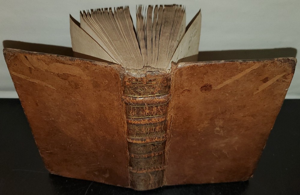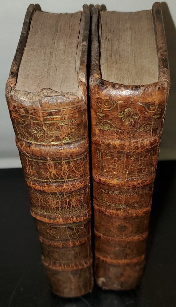 16mo. Full leather with raised bands and gilt decorations along spines and board edges. Red speckled edges of leaves. Boards are scuffed and worn. Chipped spine edges. Small worm hole in bottom of 2nd volume. Some curling at corners. Leather is starting to crack along spine. Vol. 1 has slight, light and infrequent markings in the margins. Moderate foxing all throughout. Good condition overall. [36], 407, [15]; [2], 238, 246, [8] pages.