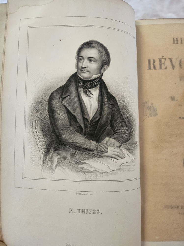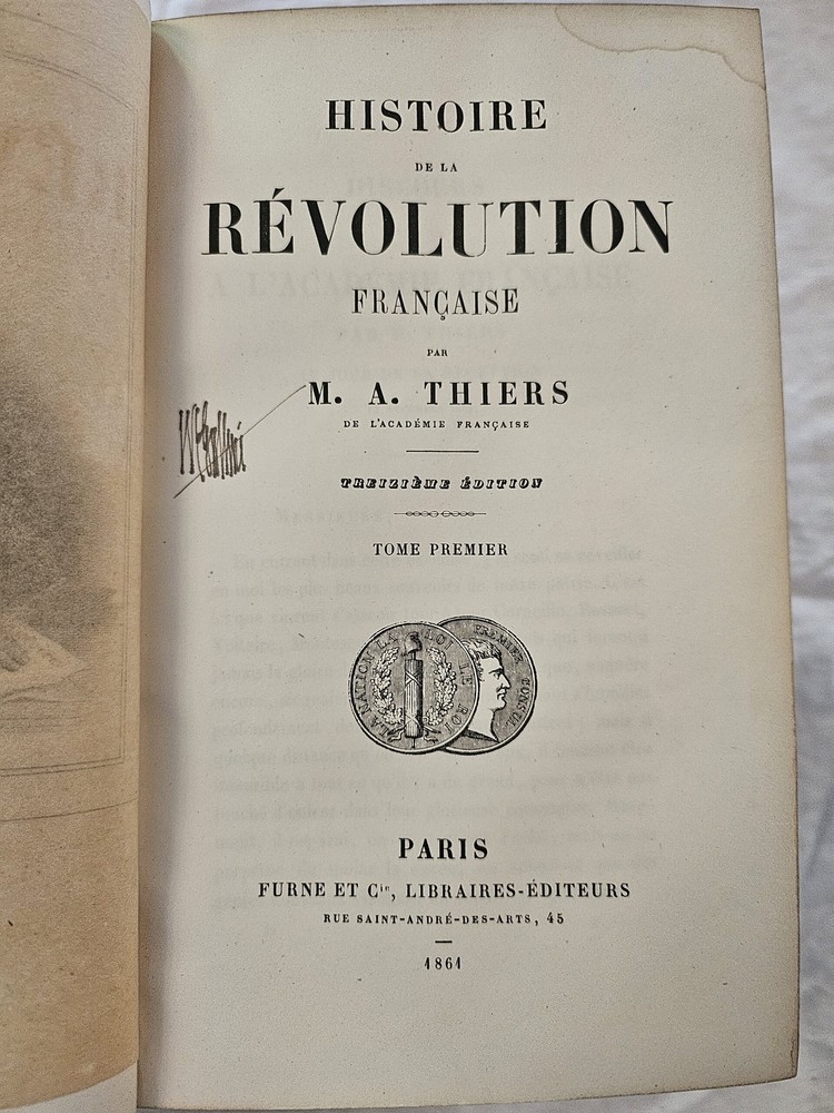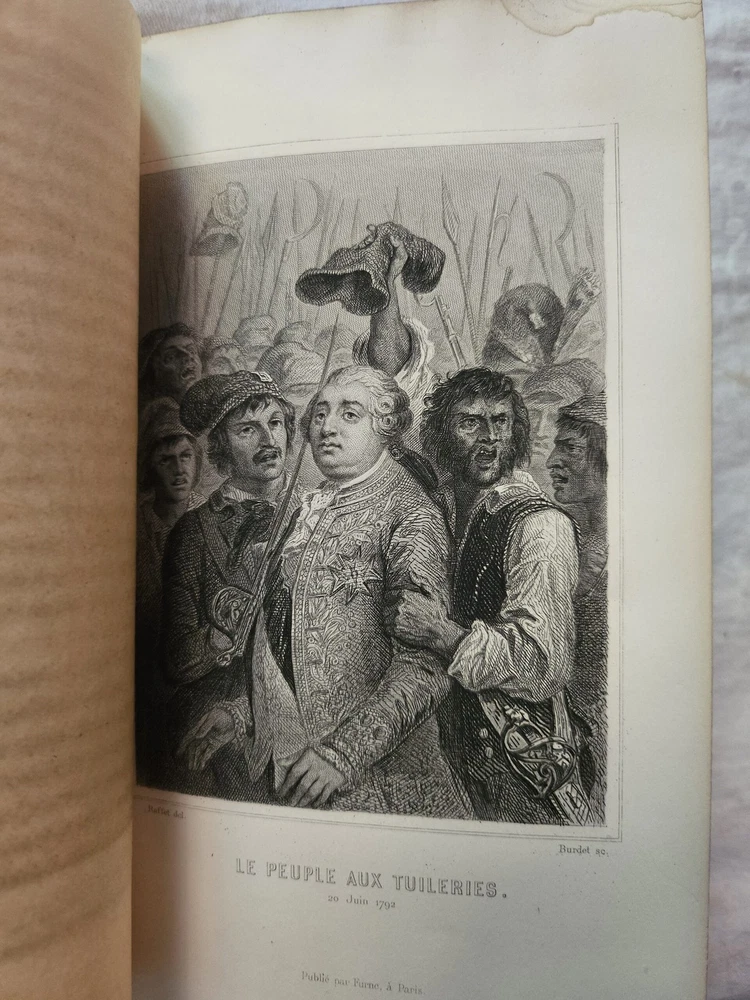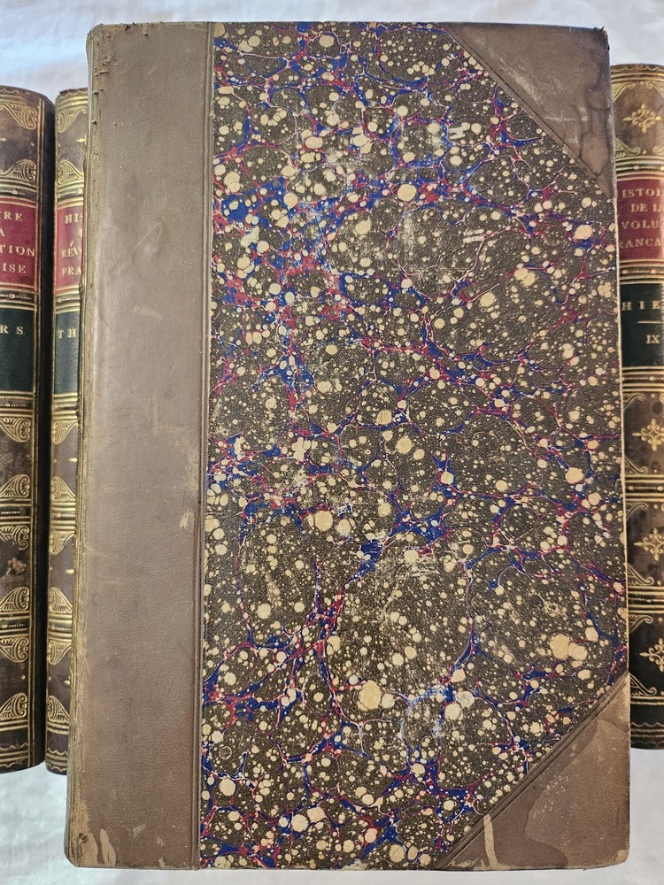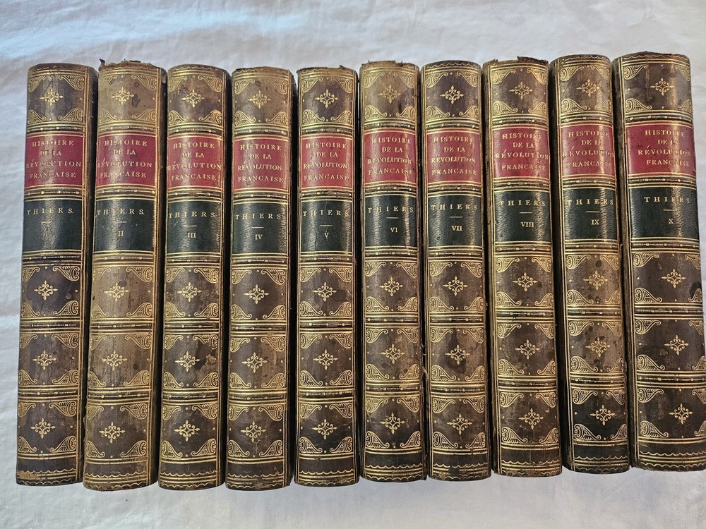 HGG Books presents ... Histoire de la Revolution Francaise 10 volume set Author: Thiers, M A [Adolphe] Publisher: Furne et Cie Libraries Editeurs Release Date: 1864 Seller Category: History Qty Available: 1 Condition: Collectible: Very Good Sku: theirshist Notes: Histoire de la Revolution Francaise 10 volume set by M A [Adolphe] Thiers. Published in Paris 1864. 3/4 leather and marble boards with marble text block edges, raised spines, red and gold titling, and gold embossed decoration. 54 engravings of scenes and portraits.Pages with a few stain spots at scattered pages corners, bindings tight, engravings crisp with tissue guards, front hinge on volume VI separated with all other hinges in tact, edge wear to all boards, bumping to spine tops, leather bright with scattered spotting, gold embossed spines and titling bright Don't forget to check out other great deals in our eBay Store!!