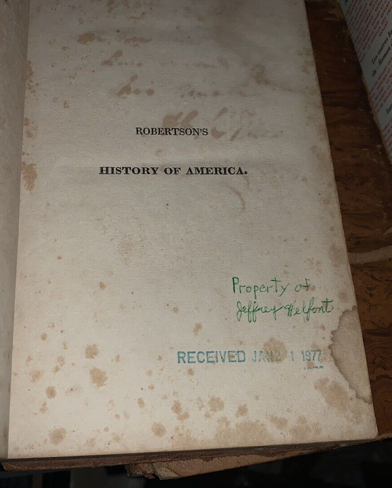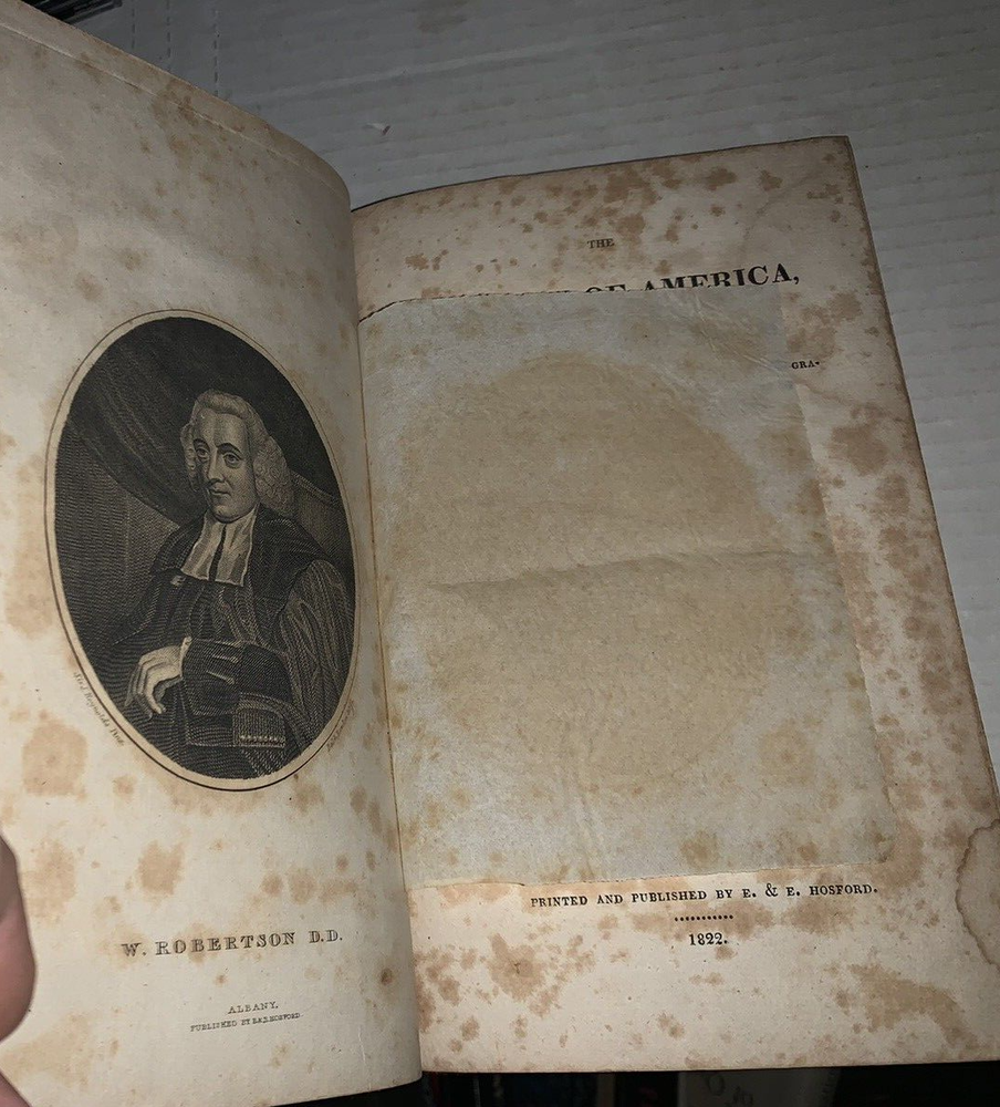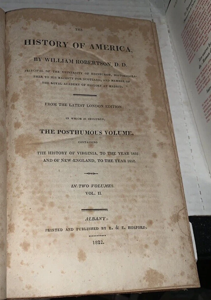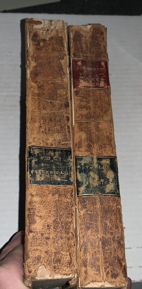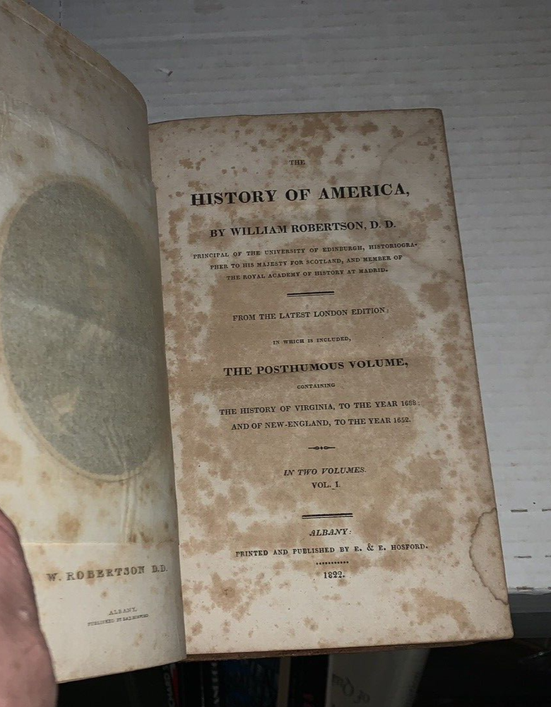 History of America, From the latest London edition, in which is included the Posthumous Volume containing the History of Virginia to the Year 1668 and of New England to the Year 1652. (2 volumes complete). Robertson, William. Published by E.and E, Hosford., Albany., 1822 Robertson's history of the discovery of America and the conquest of Mexico and Peru was the "most highly regarded secondary source of its time" (Howes, 493). From its publication until the 1840s it "held its place as the standard history of the discovery of the New World" (Honour). "The History of America was published… to a very positive reception. Its success was even more marked on the continent, where it was considered Robertson's masterpiece… The book's structure marked another departure for Robertson, as he alternated chapters of narrative concerning the Spanish conquest with chapters of description of Native American culture and society. With its dramatic sweep of narrative, combined with a provocative confrontation of two very different stages of civilization and a prose that was more flexible and evocative than that of his earlier books, the History of America is often regarded as Robertson's most interesting, original, and even Romantic work"