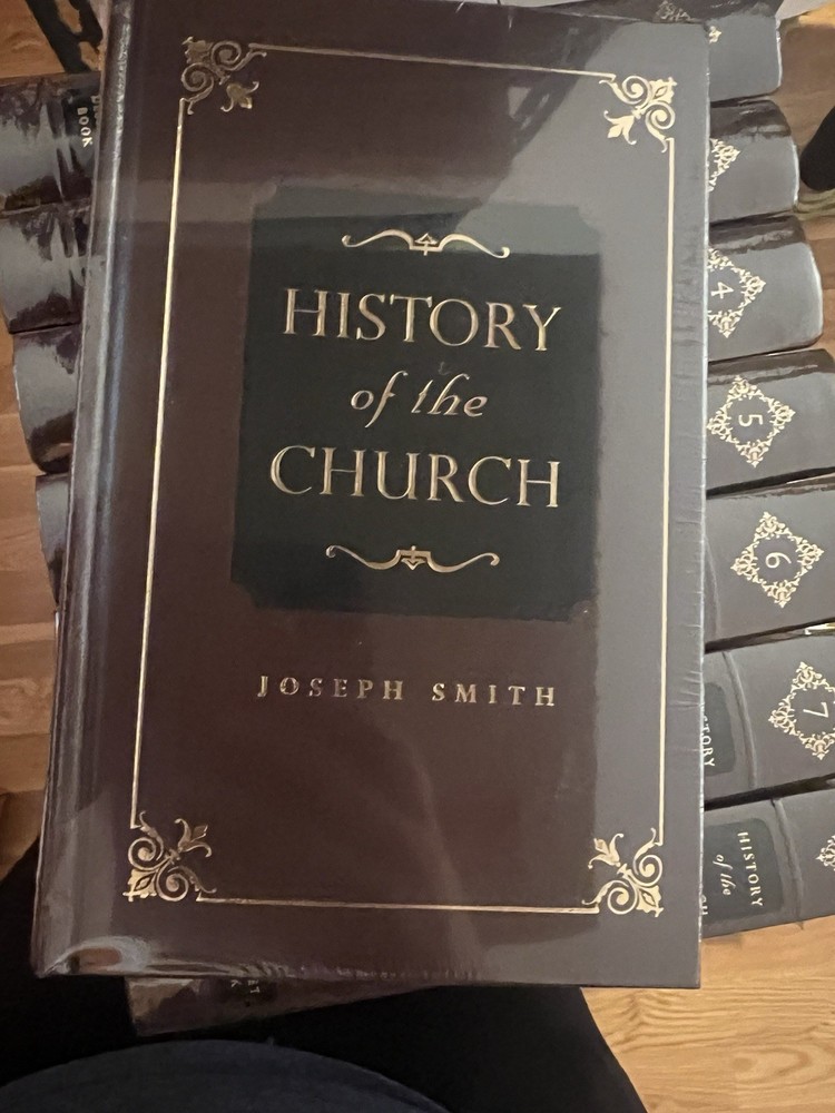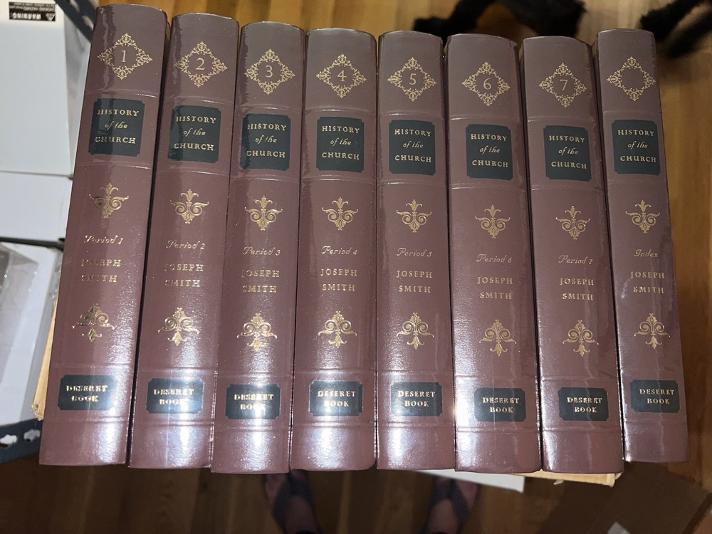 The product is an 8-volume complete hardcover set titled "History of the Church" by Joseph Smith Jr. published by Deseret Book Company in the 1980s. This special edition set is intended for young adults and adults interested in religious history, specifically the history of the LDS Church. The books feature leather binding, gilt edges, and inlays, making them a valuable addition to any collection on the topic of Mormonism and Christianity. All original sealed.