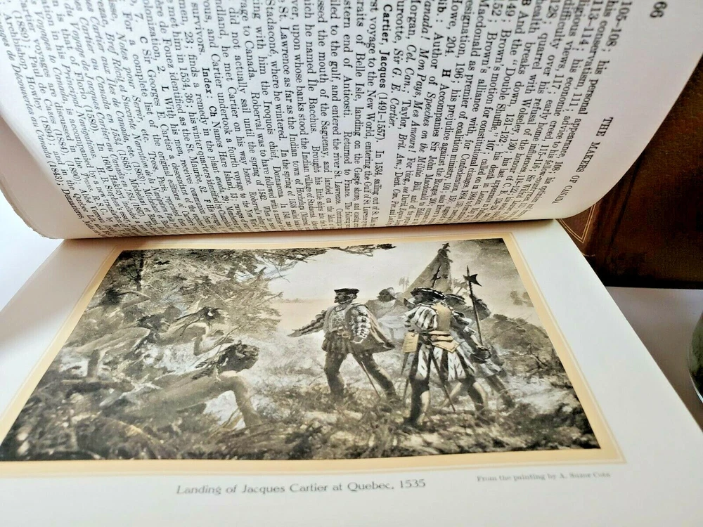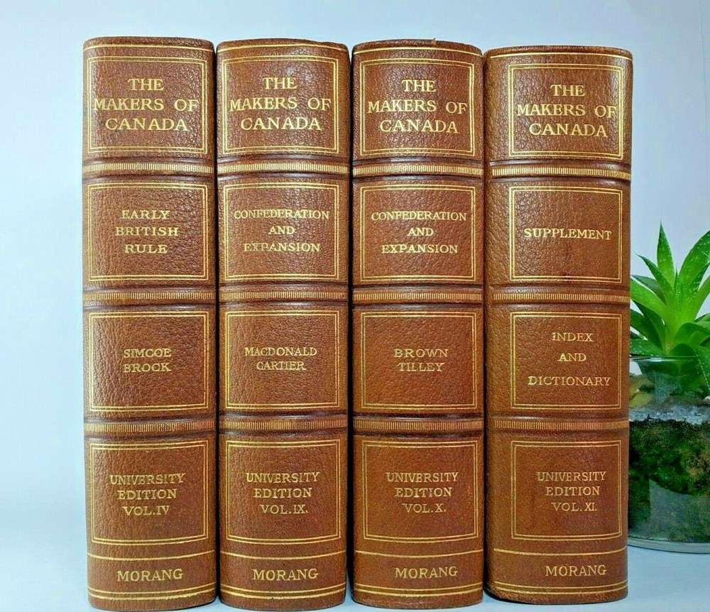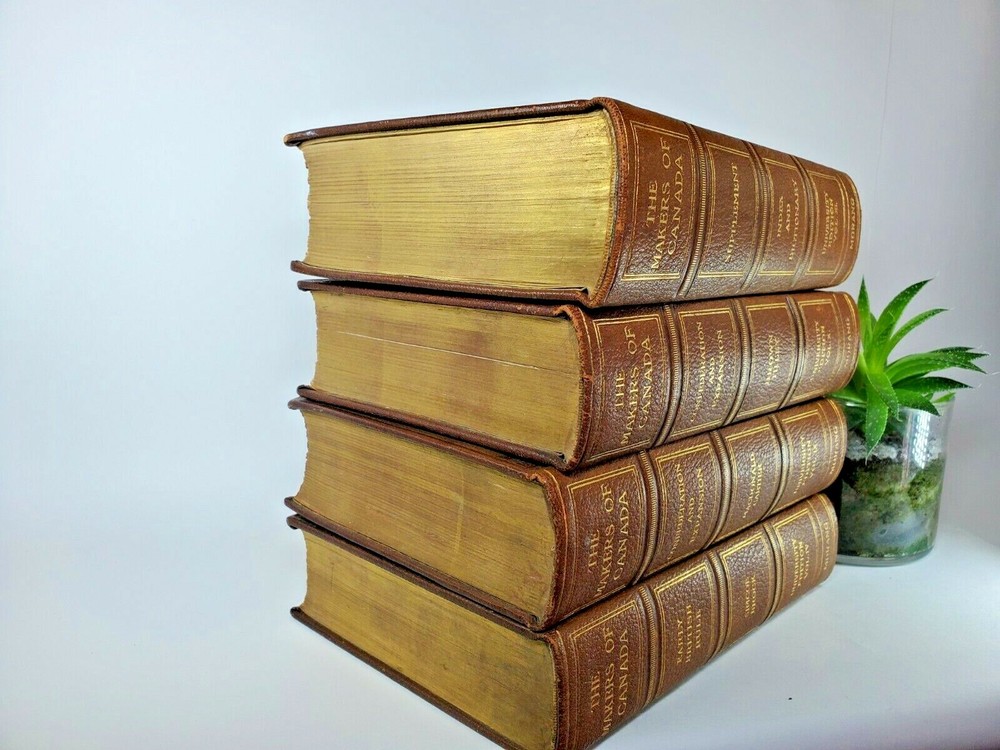 History of Canada University Edition 1912 Brown Leather Rare Volume Set- Morang and Co. Ltd A gorgeous set of 4 leather-bound books. All books are in great condition considering their age. Spines are intact and covers are in pristine condition. Golden lettering on the spine still very clear. Fore-edge gilt and deckled edges. Inserts are intact. Please see photos for details. Thank you for the interest on this item. Keep supporting small businesses. Happy shopping!